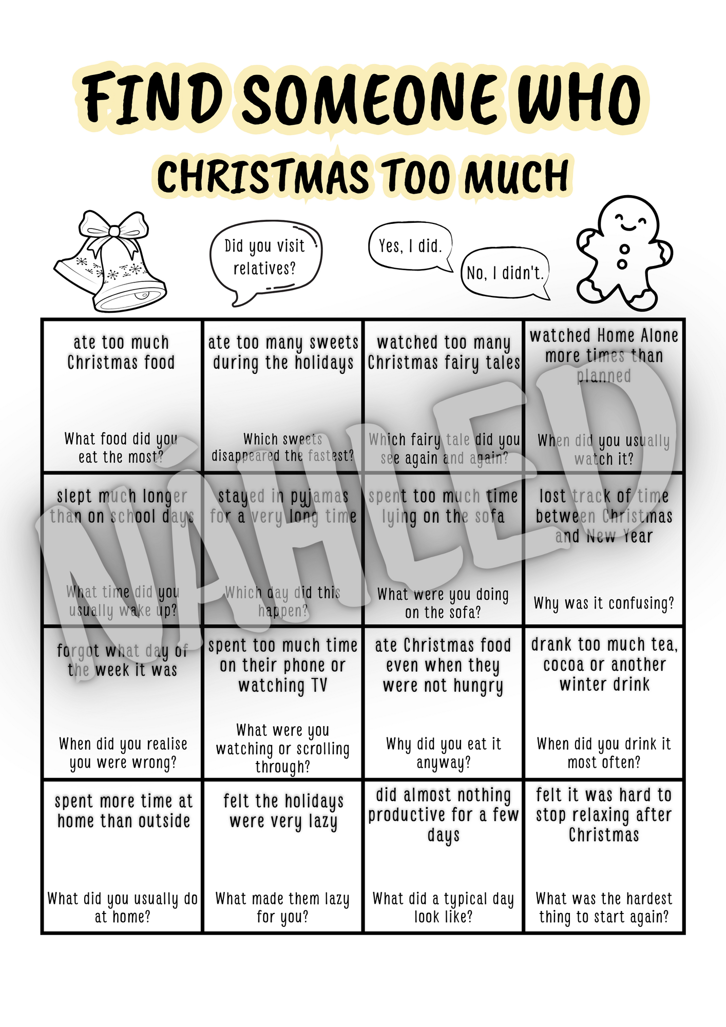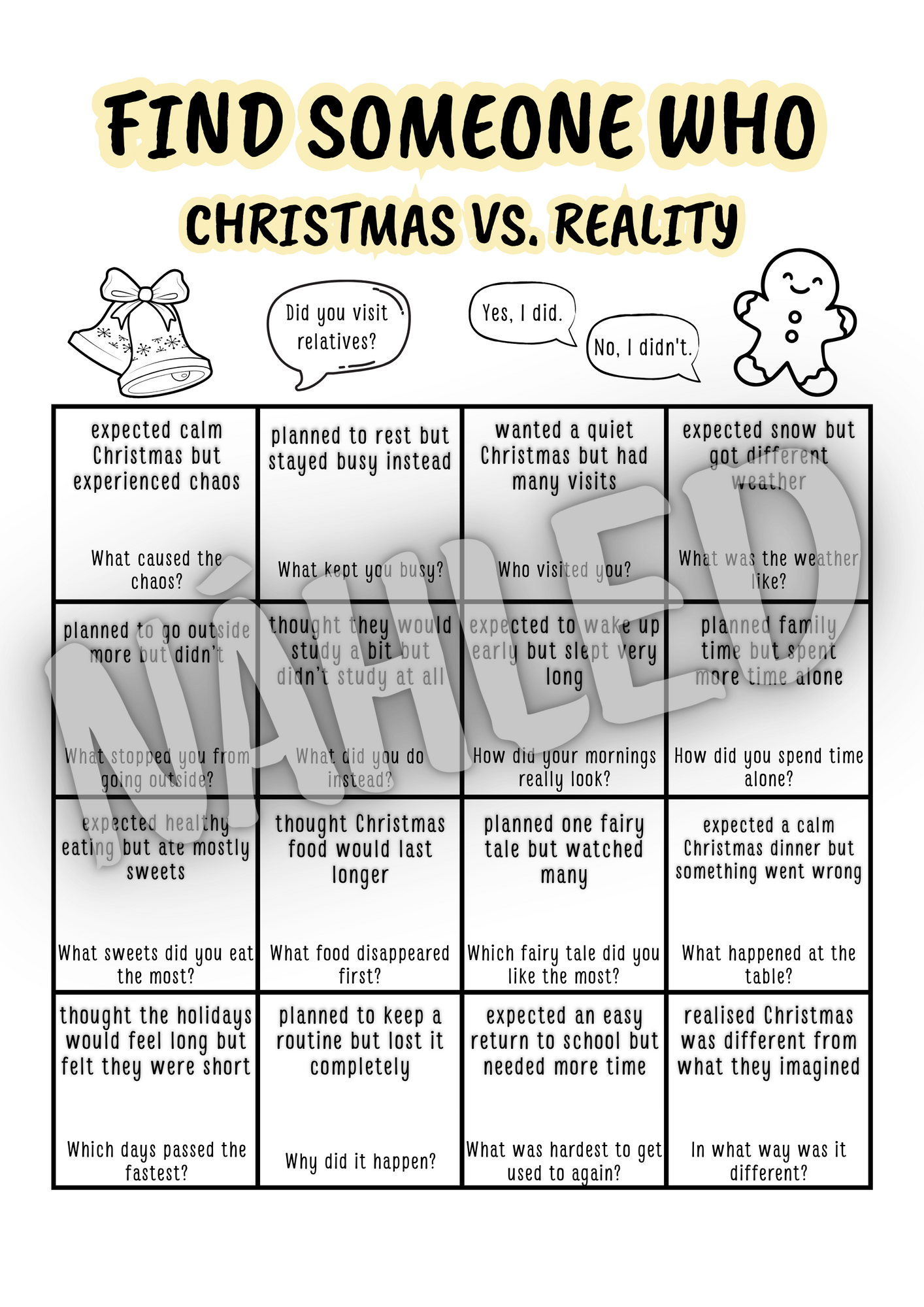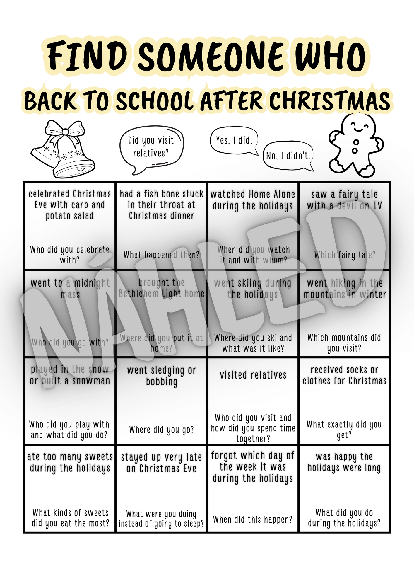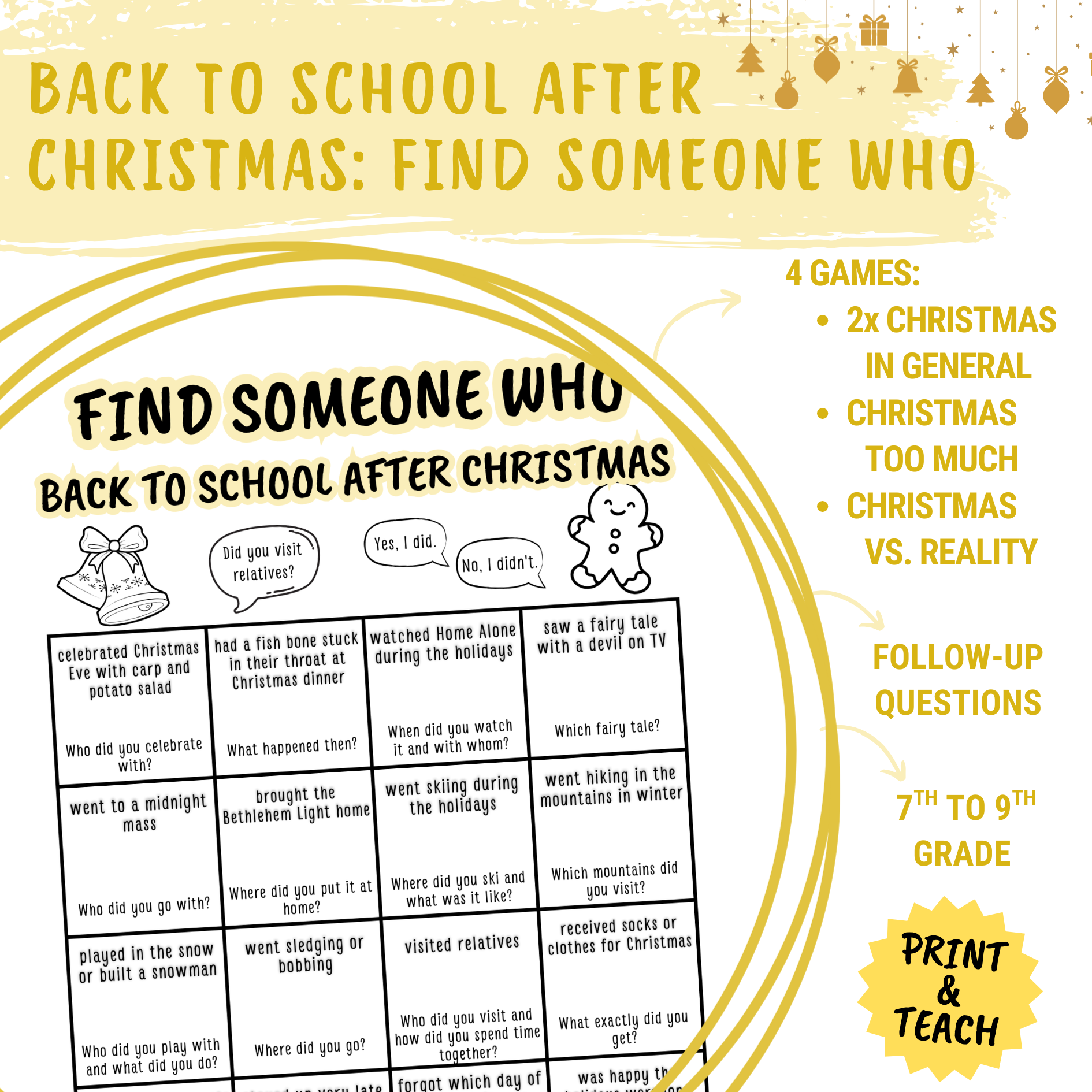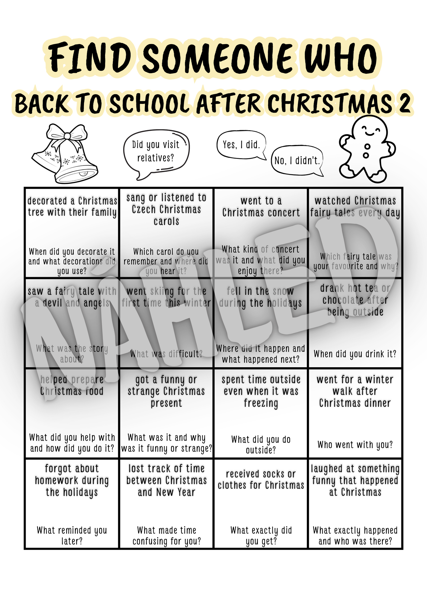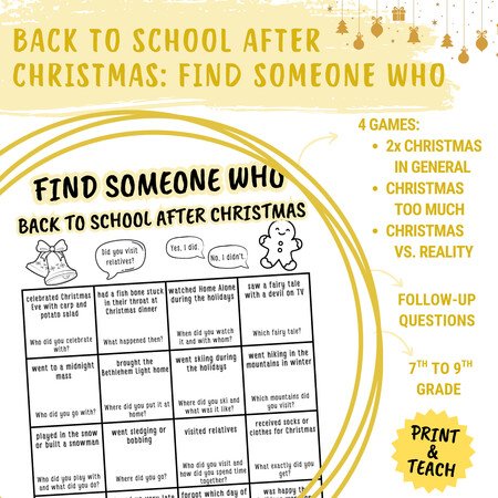 Konverzační aktivita Find someone who... zaměřená na první hodiny po vánočních prázdninách, kdy potřebujete rozhýbat třídu bez stresu a zbytečného tlaku na výkon. Aktivita je zaměřená na prázdninové vánoční zážitky žáků 🎄