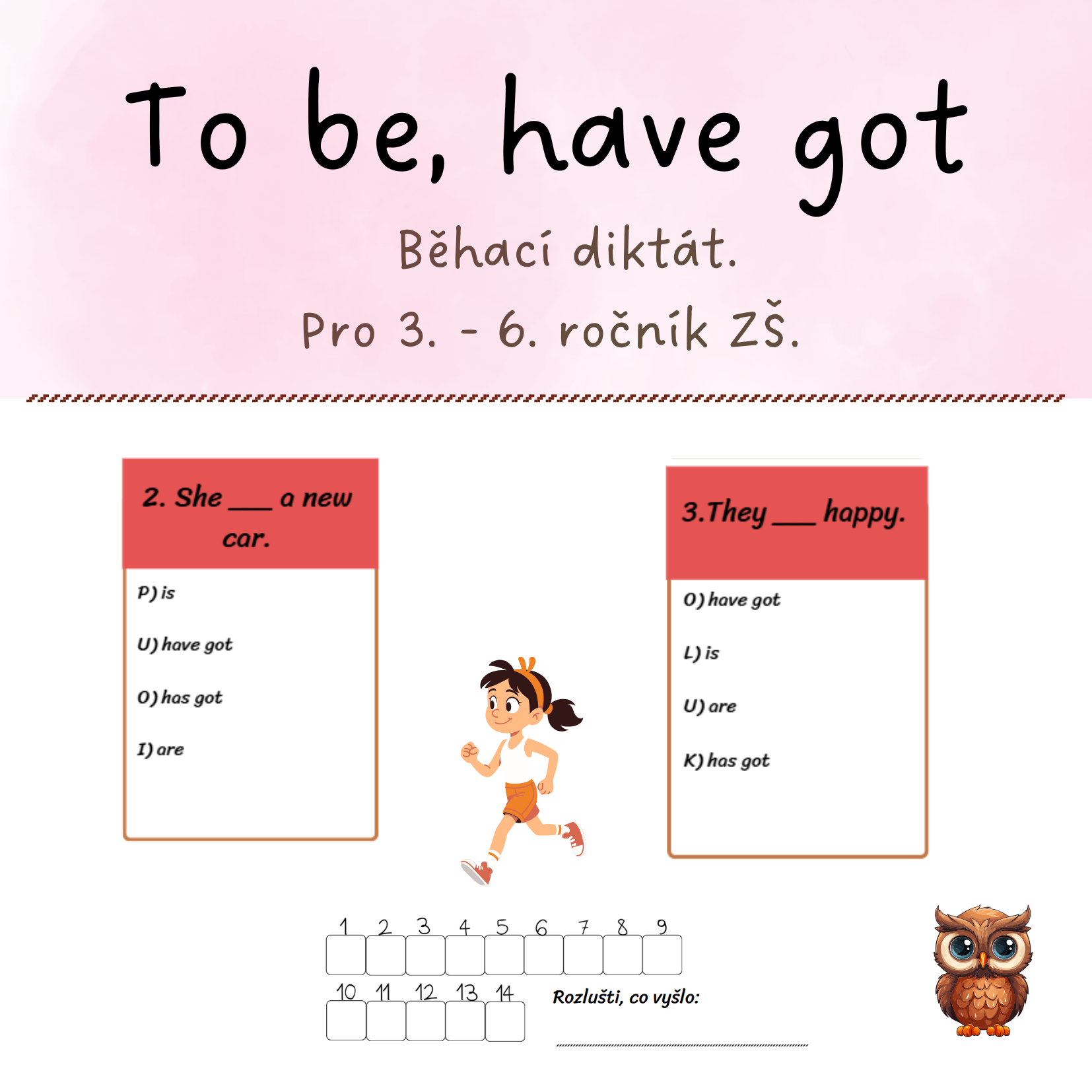 Běhací diktát na To be & Have got! 🏃♂️ Procvičte obě vazby najednou zábavnou formou. Sada obsahuje karty k rozmístění po třídě, záznamový arch.. Žádná nuda, jen aktivní pohyb a gramatika v praxi. Pro 3. - 6. třídy.