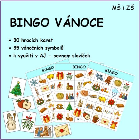 Bingo je zábavná hra pro celou třídu i skupinu menších dětí. Materiál obsahuje 35 symbolů s vánoční tématikou, 30 hracích karet a přehled anglických slovíček pro použití v hodině anglického jazyka k procvičení slovní zásoby na téma Christmas.