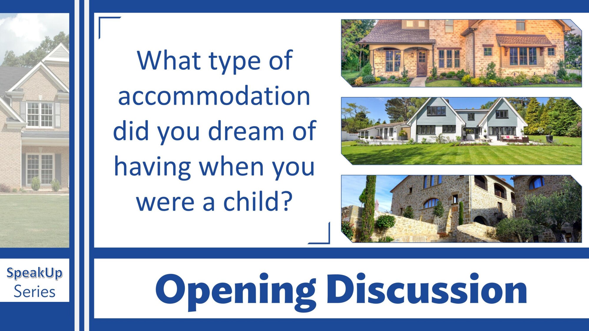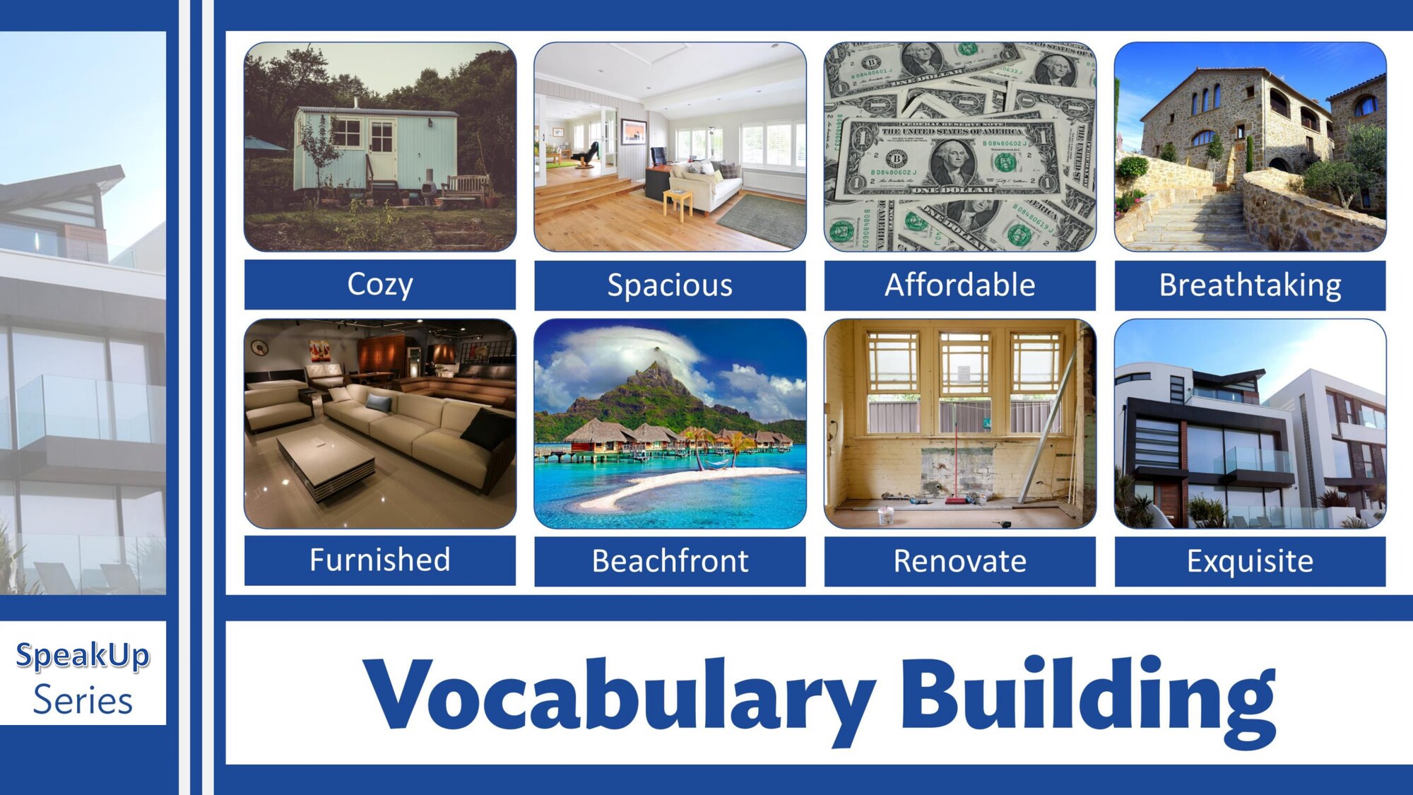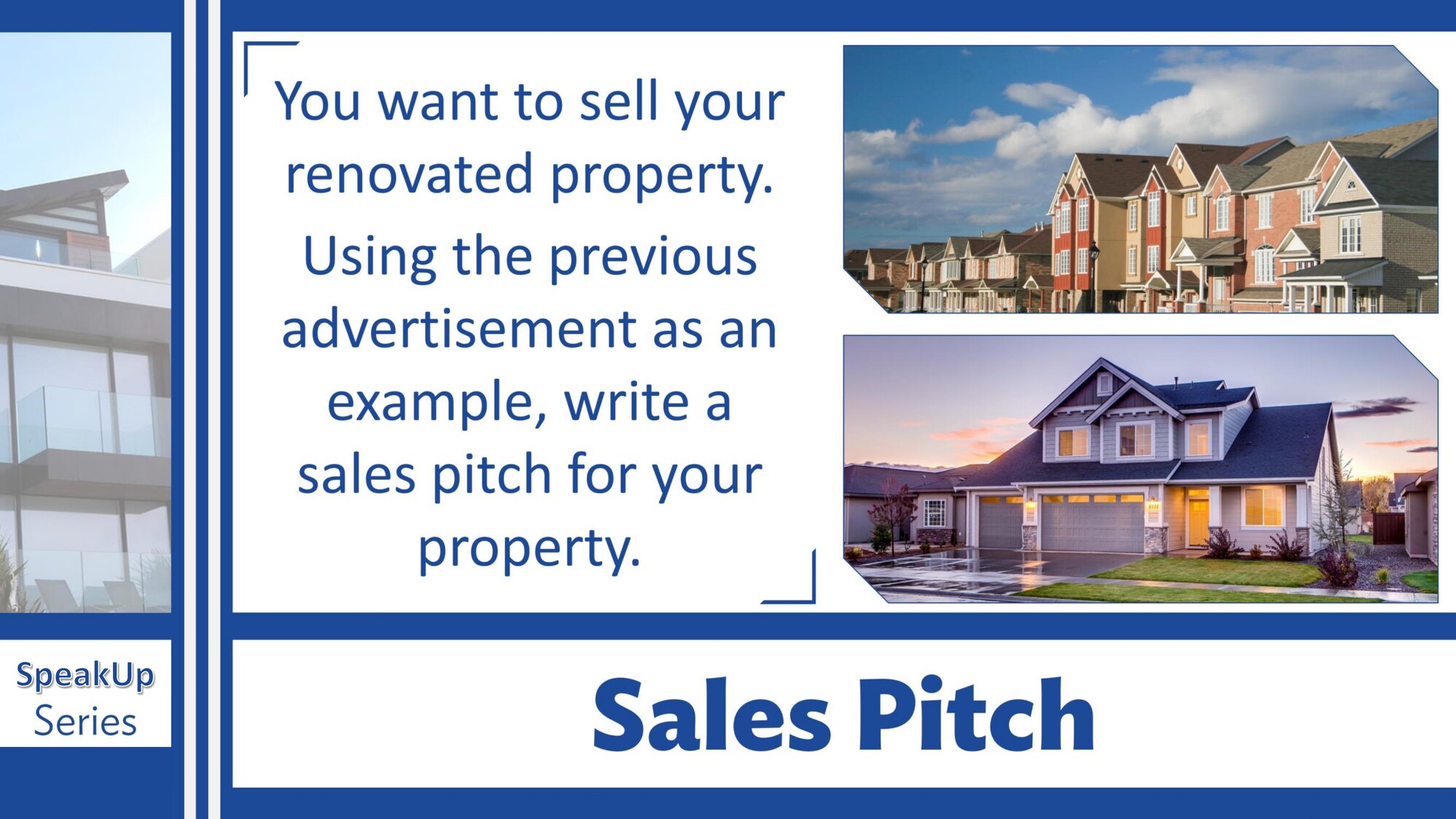 Materiál SpeakUp 10 – Buying a House se zaměřuje na situace spojené s koupí bydlení. Studenti procvičují slovní zásobu k domům a bytům a diskutují o preferencích, rozpočtu a správném domě na investici.