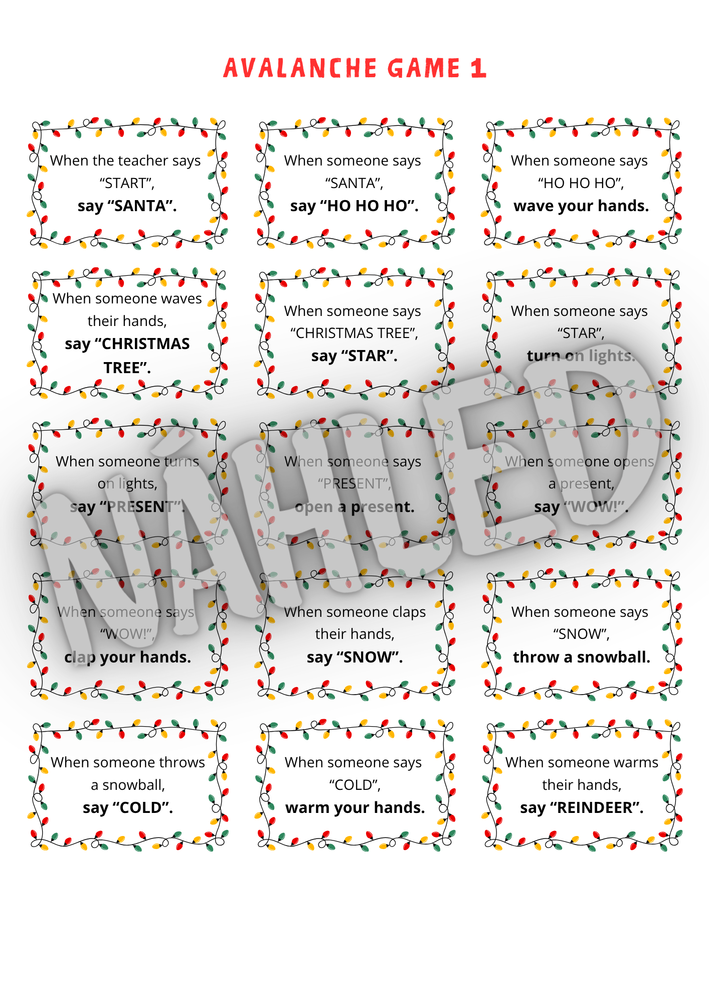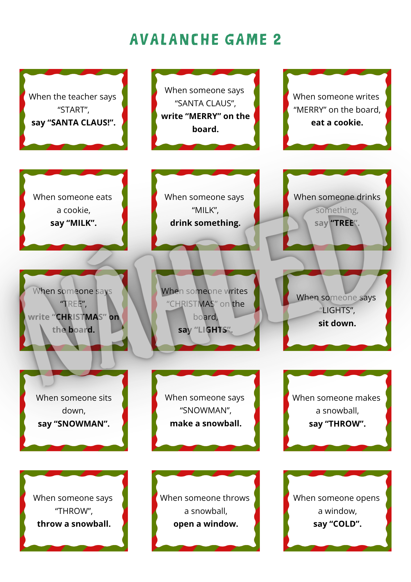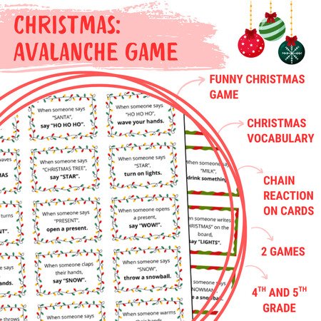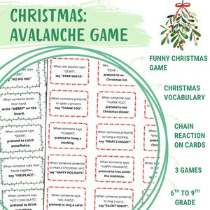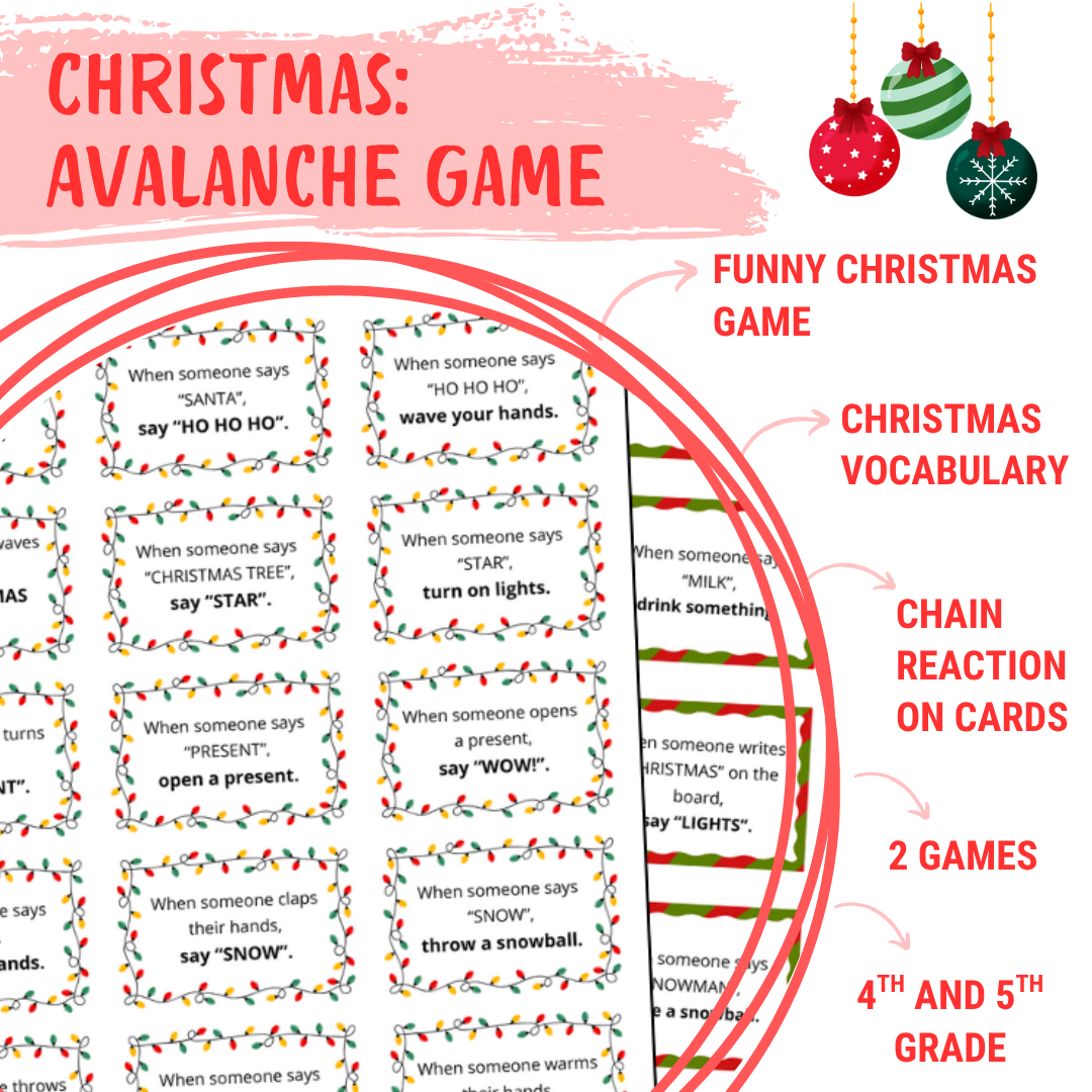 Zábavná vánoční hra do hodin angličtiny, kde každá kartička spustí další akci, tak, jako lavina na horách! Procvičení vánoční slovní zásoby a poslechu hravou formou v zábavné řetězové reakci.