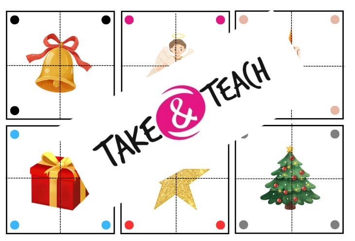 star, Christmas tree, candle, Santa, elf, reindeer, bell, Baby Jesus, snowman, angel, present, stocking a 6 různých aktivit pro seznámení se slovní zásobou, procvičení slovíček, hry a sebekontrolu.