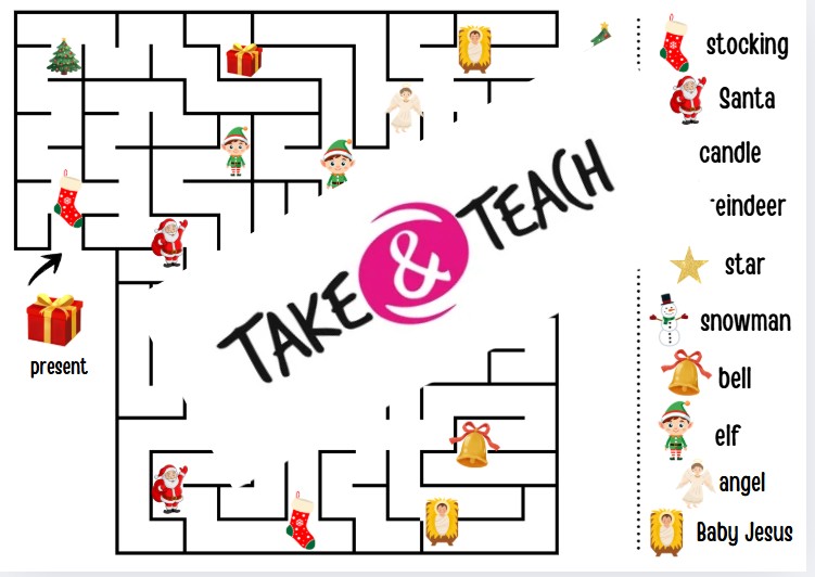 - CHRISTMAS MAZE- žáci pomáhají dárku v bludišti dostat se po vánoční stezce až pod vánoční stromeček a při cestě pojmenují podle nápovědy základní slovíčka (pořadí obrázků v nápovědě jim ukazuje i směr cesty)