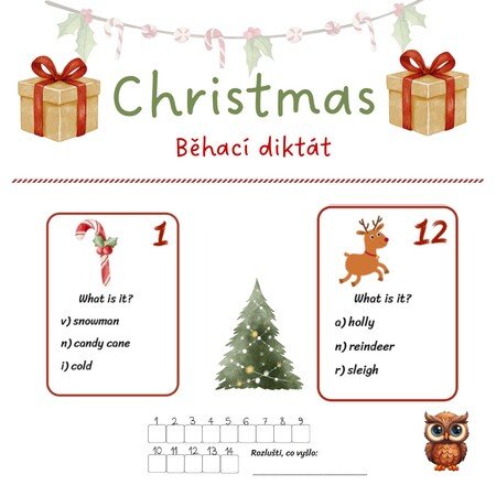 Běhací diktát na téma Christmas, včetně záznamového archu. Aktivita je vhodná pro výuku angličtiny, rozvíjí slovní zásobu, čtení, psaní i pohyb.