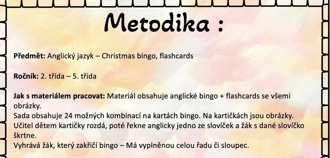 Sada obsahuje 24 možných kombinací na kartách bingo + 16 flashcards