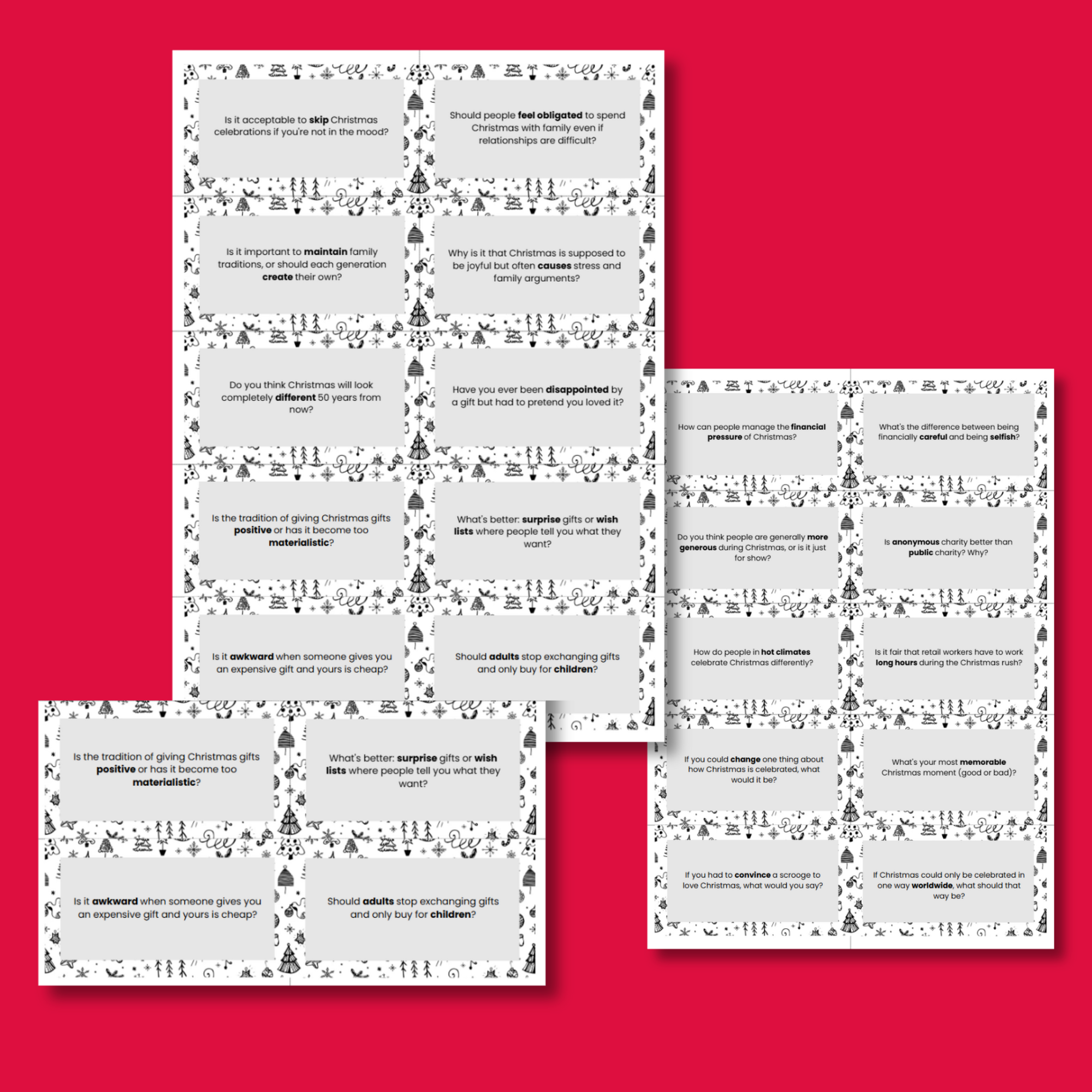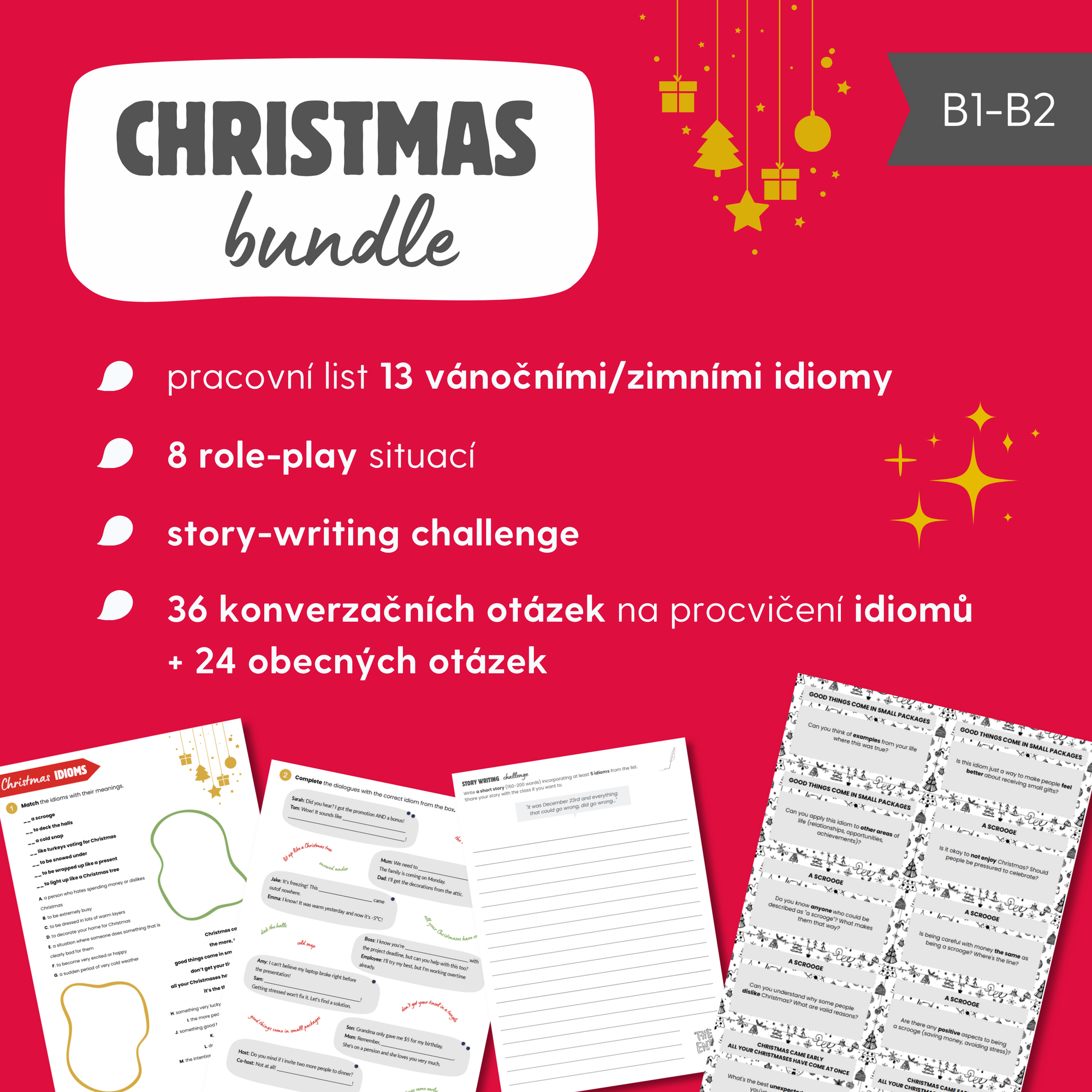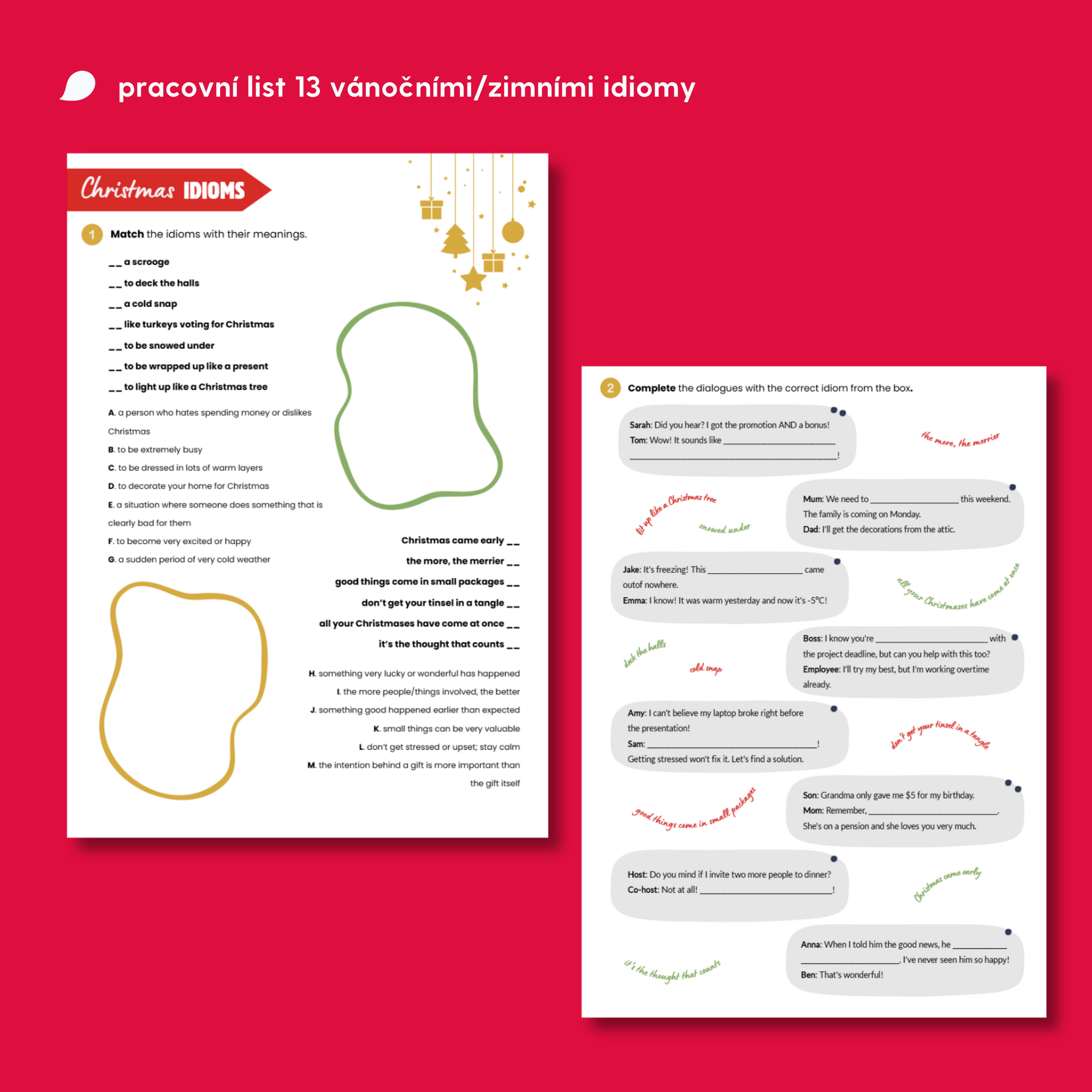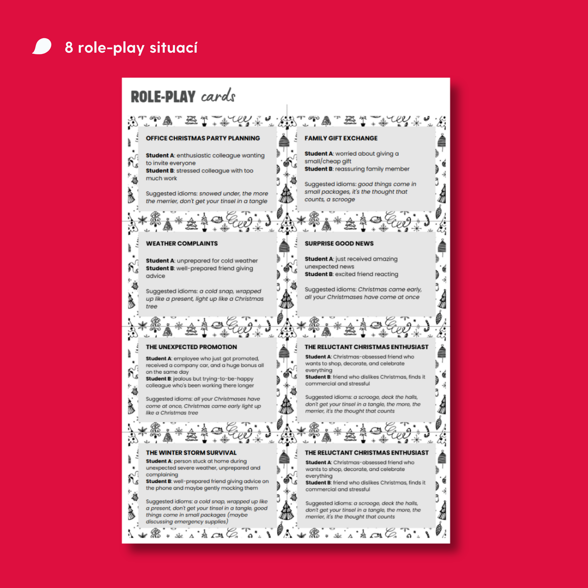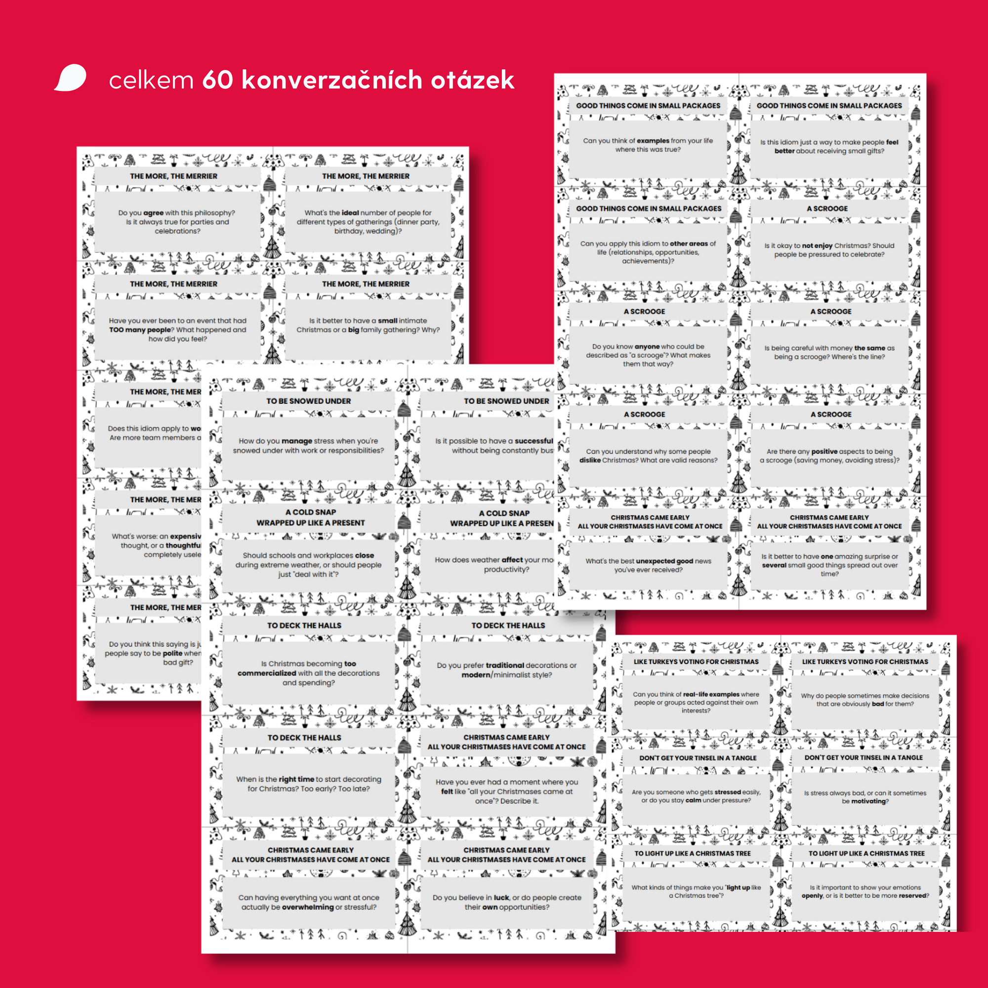 Konverzační otázky: 36 konverzačních otázek, které se přímo vztahují k idiomům a 24 dalších, obecnějších otázek, které se týkají Vánoc. Můžete využít k diskuzi ve skupině, jeden student může sbírat odpovědi na jednu otázku např. od 4 spolužáků a následně podat zpětnou vazbu v rámci celé třídy.