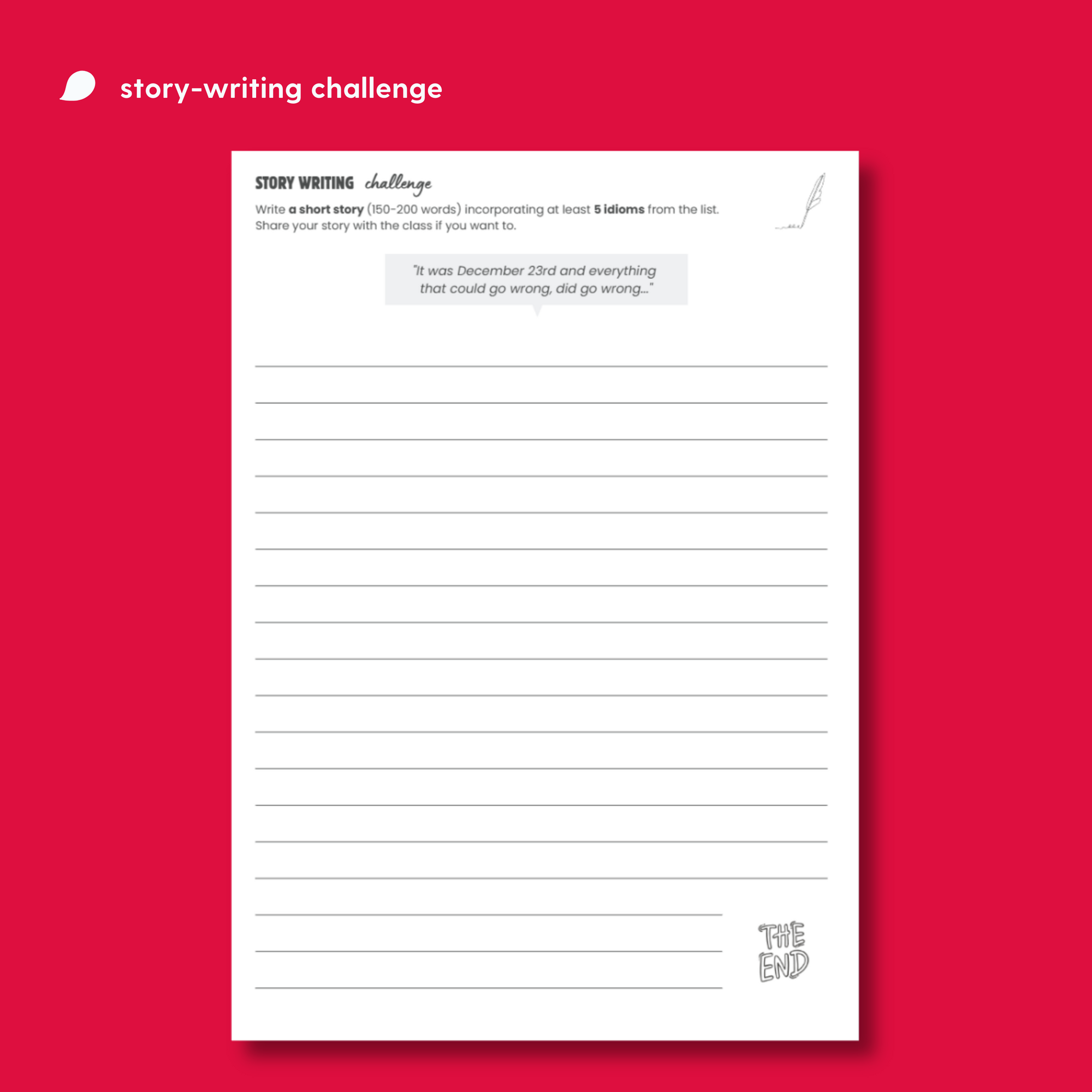 STORY WRITING challenge: studenti mají za úkol vytvořit příběh, který navazuje na úvodní větu a začlenit do něj idiomy, které se naučili.