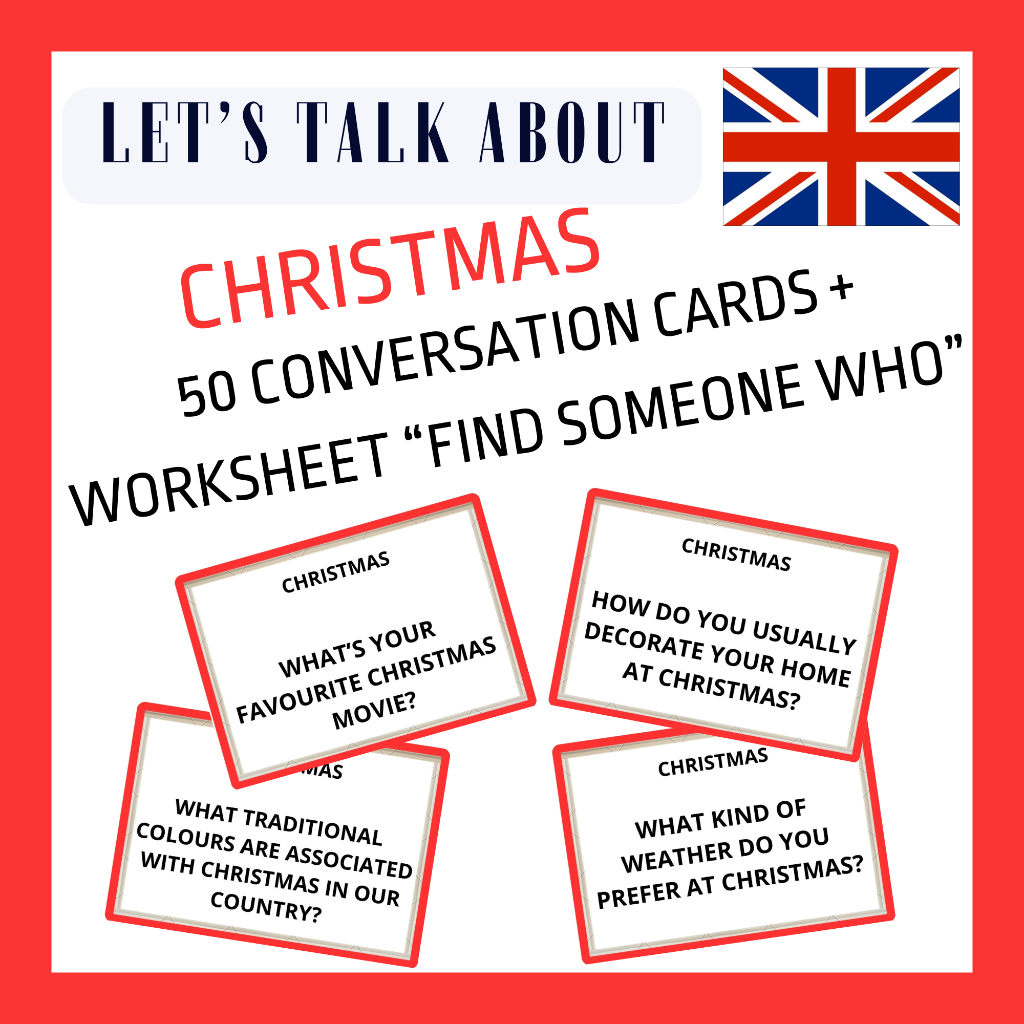 Na každé kartičce je uvedena jedna otázka k tématu CHRISTMAS. Kartičky je možno využít při hodinách konverzace pro samostatnou či skupinovou práci od mírně pokročilých až po pokročilé studenty.