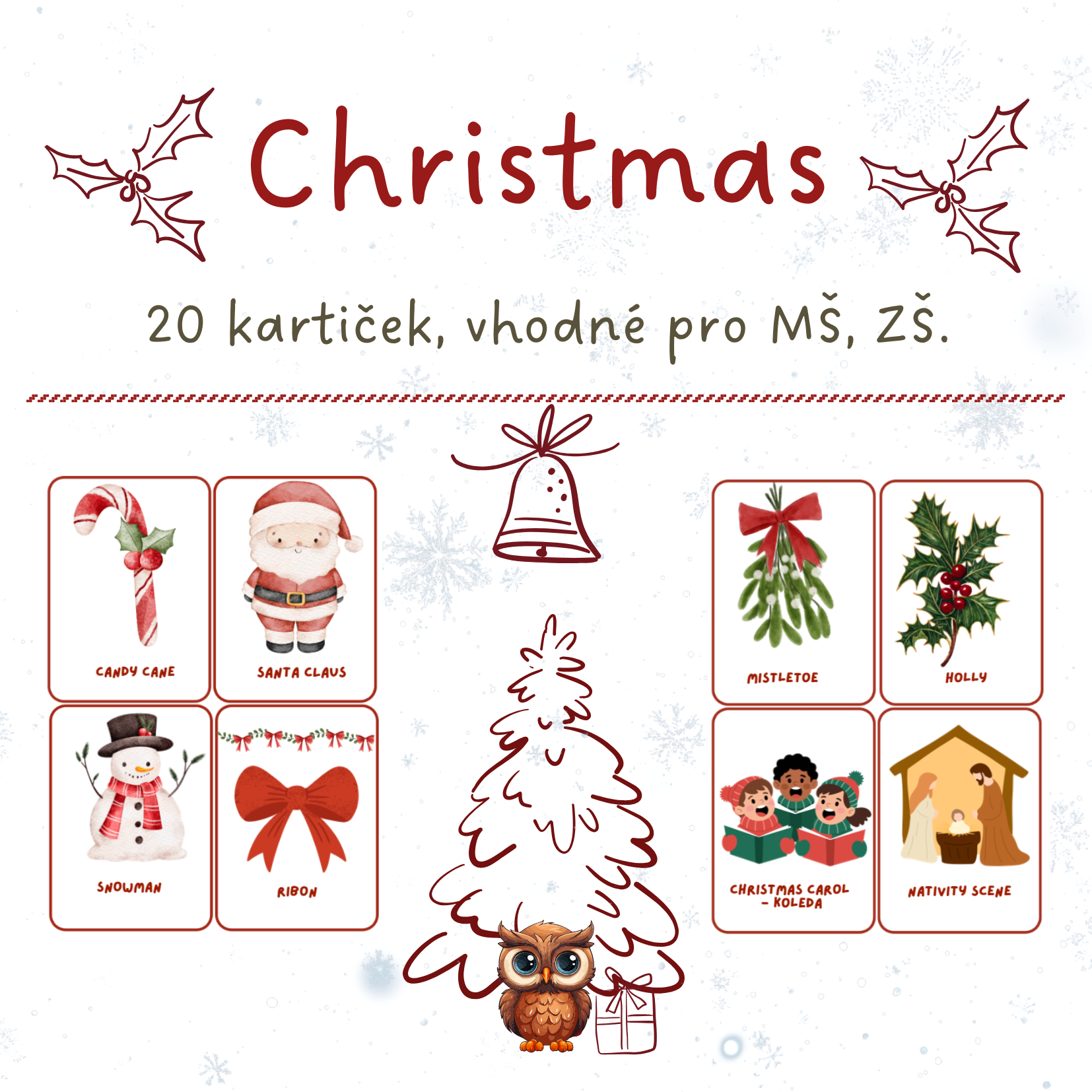 🎄 Sada 20 vánočních karet – ideální do výuky nebo jako kouzelná dekorace třídy! Vneste do třídy kouzlo Vánoc plné radosti, světýlek a pohody. Karty s vánoční tematikou rozzáří každou školní místnost a podpoří tvořivost i sváteční náladu.