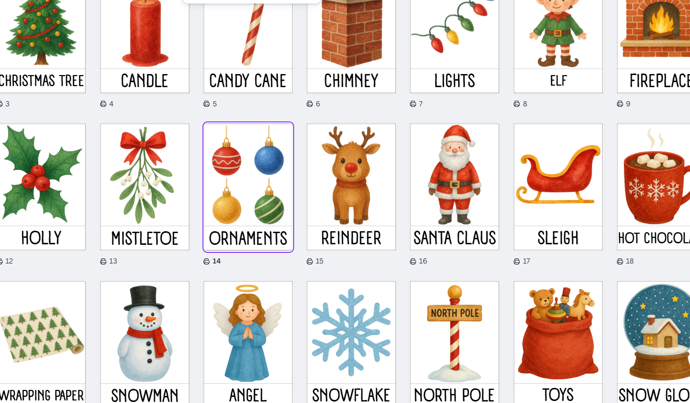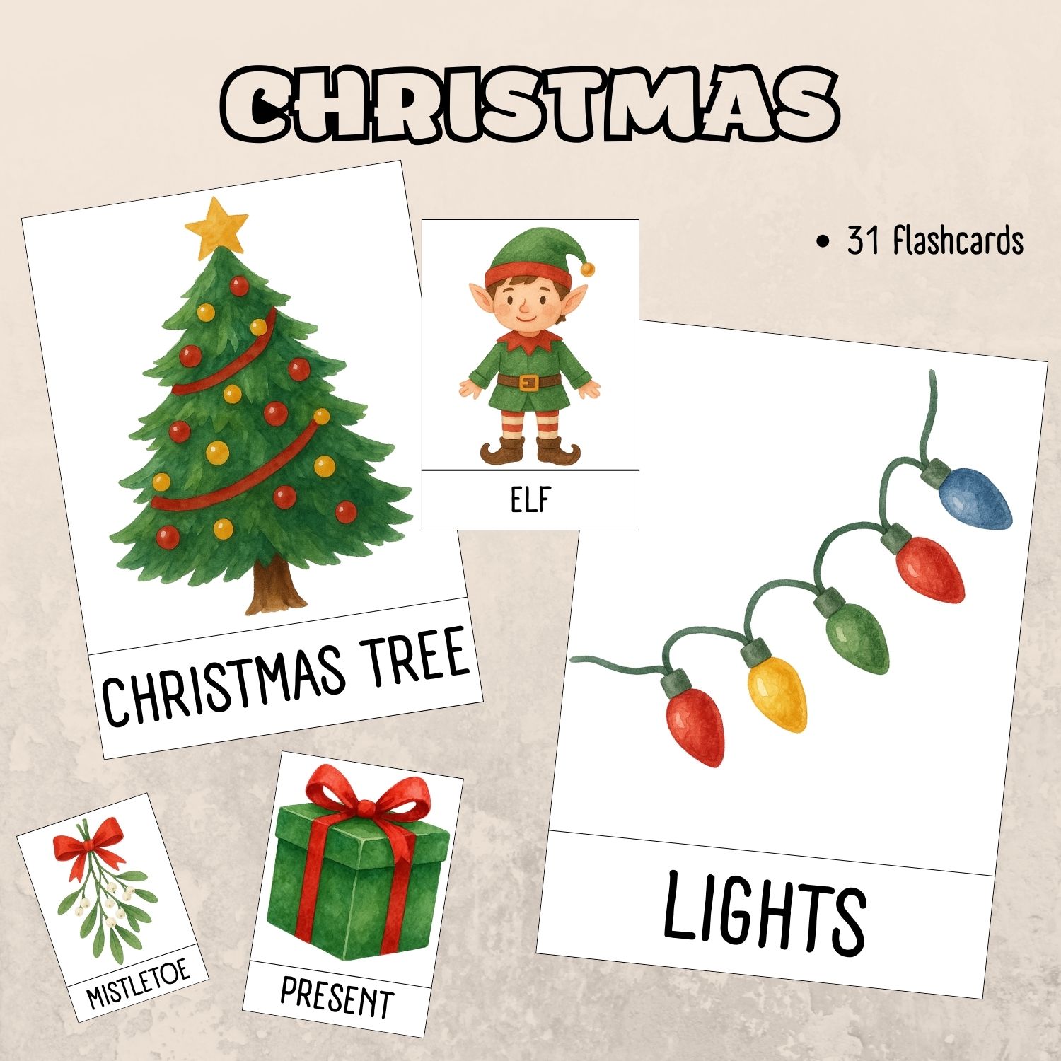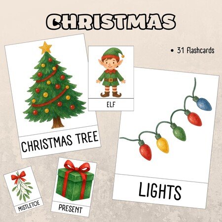 - 31 flashcards na téma Christmas (Christmas tree, candle, candy cane, chimney, lights, elf, fireplace, mistletoe, ornaments, reindeer, Santa Claus, sleigh, stocking, snowman, hot chocolate, gingerbread house, wrapping paper, present, star, wreath, bells, angel, snowflake, North Pole, toys, snow globe, crackers, carols, ribbon, gingerbread, holly)