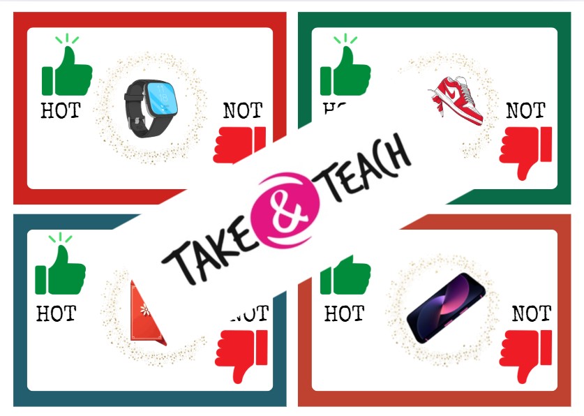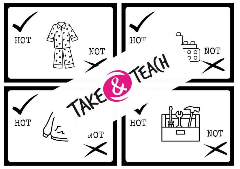 - 24 barevných a 24 černobílých kartiček s vhodnými i nevhodnými vánočními dárky, které mohou děti dostat pod stromečkem. Je na nich rozhodnout, zda je dárek pro ně HOT nebo NOT a obhájit se.