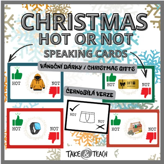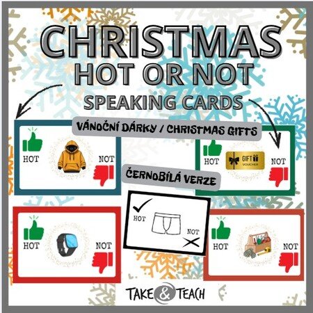 Nechte žáky obhájit vánoční dárky. Žáci si tahají kartičky s náhodnými dárky a argumentují, zda je dárek in -(HOT) nebo out (NOT). Lze využít předdefinované šablony na procvičení first a second conditional. Materiál je i v černobílé verzi.