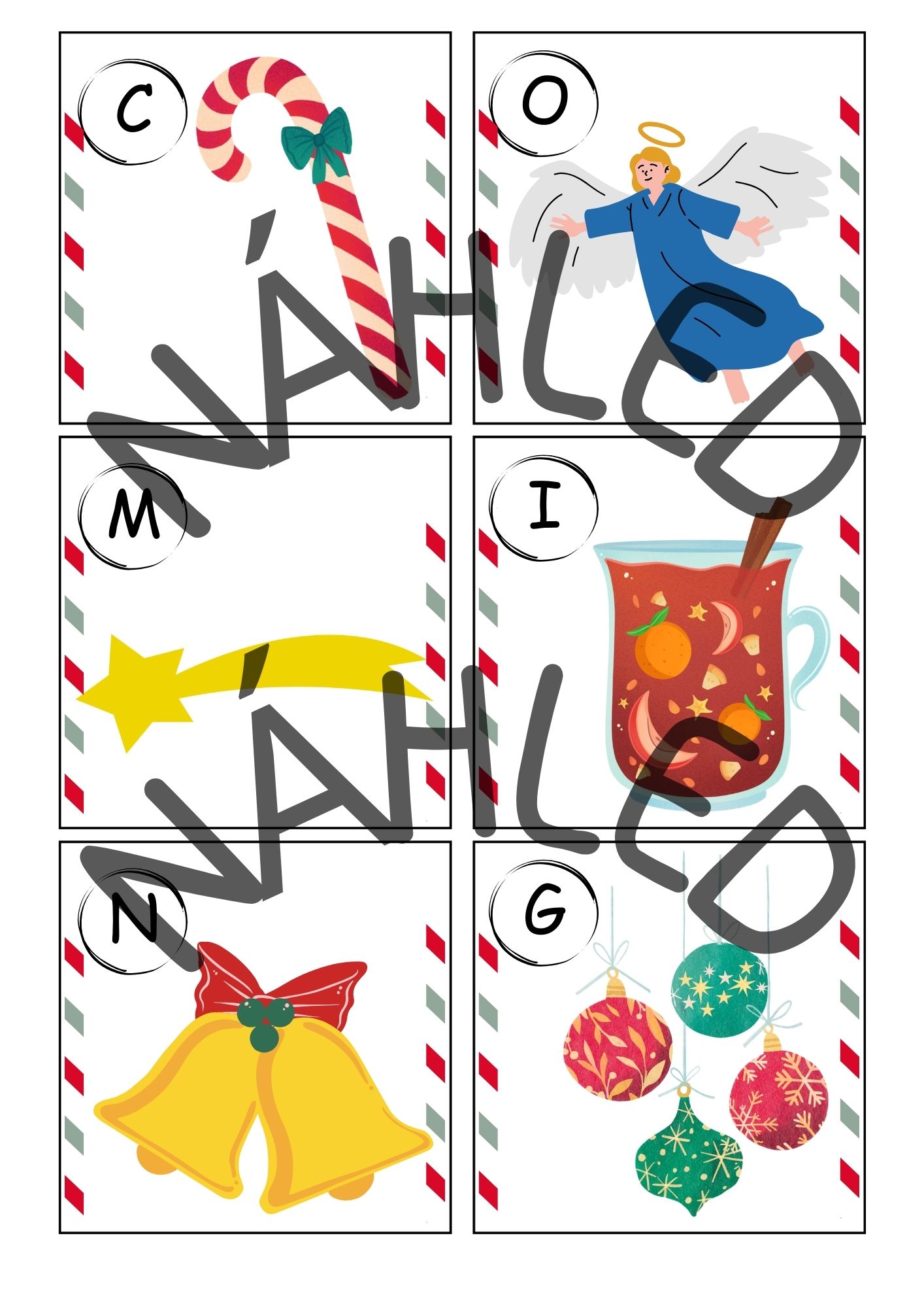 Žáci pomocí nápovědy hádají vánoční slovíčko, které je v pracovním listu popsáno. Poté musí najít odpovídající obrázkovou kartičku a zapamatovat si písmeno označené u daného obrázku. Toto písmeno si následně zapíší do tabulky.