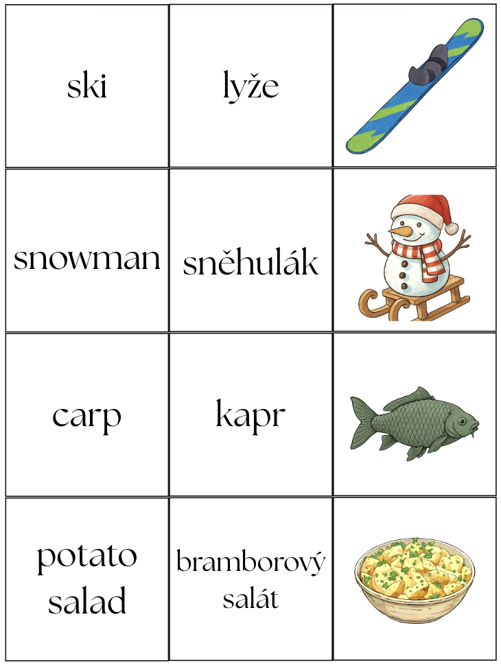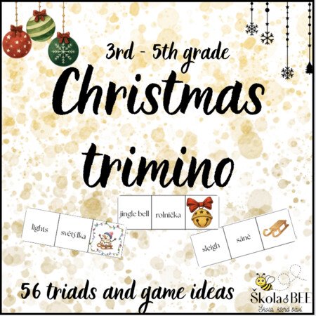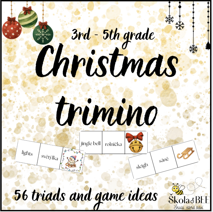 Hledáte zábavný a zároveň efektivní způsob, jak s dětmi procvičit vánoční slovní zásobu? Christmas Trimino je ideální volba! Materiál obsahuje 56 trojic (anglické slovíčko – český překlad – obrázek), ze kterých žáci skládají velké tematické trimino nebo menší dílčí celky.