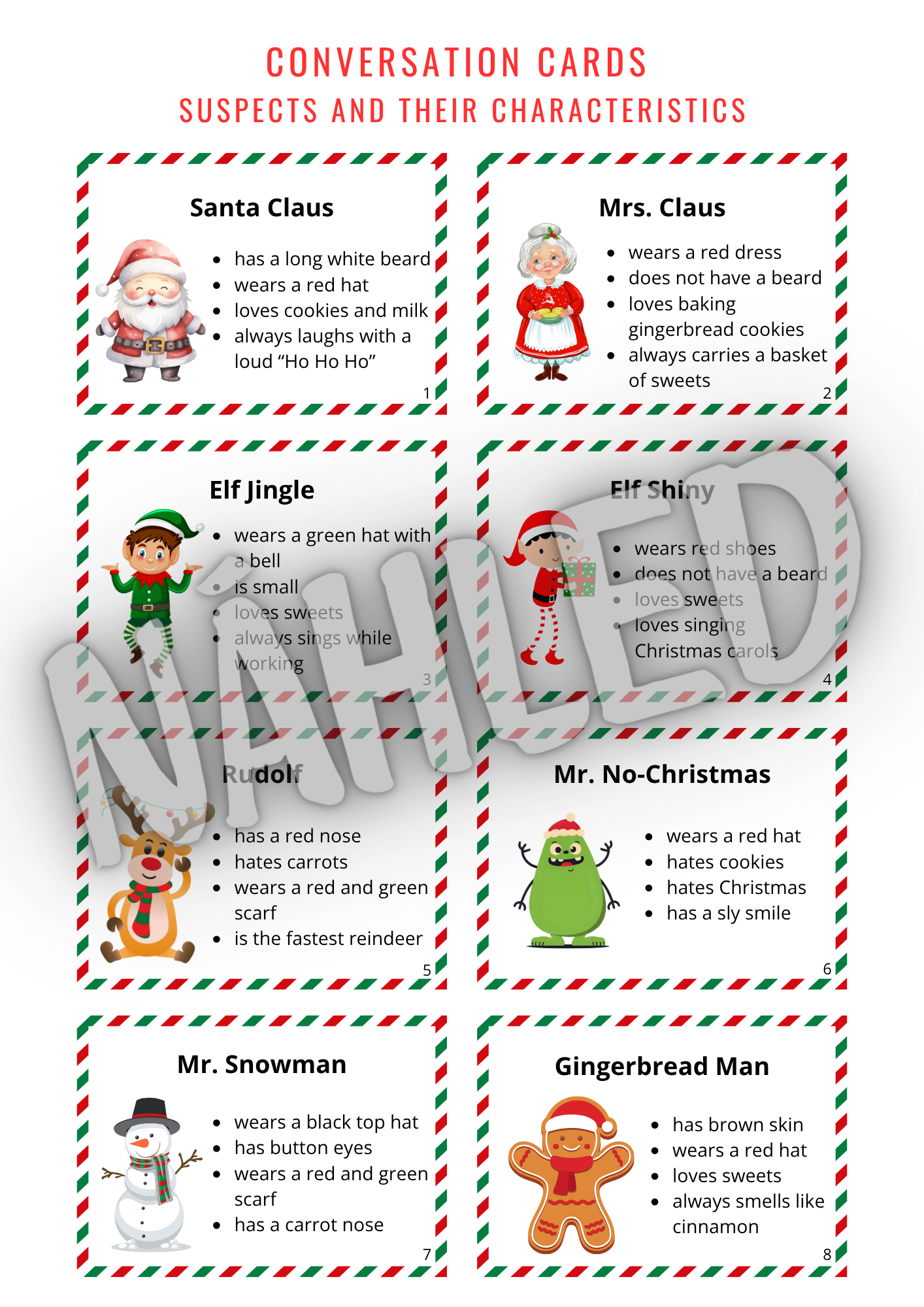Santa Claus připravil všechny dárky, ale někdo mu je ukradl! Úkolem žáků bude pomocí kladení otázek a odhalování stop zjistit, kdo je zloděj. Detektivní hra na motivy hry “Who is the burglar?” s vánoční tématikou.