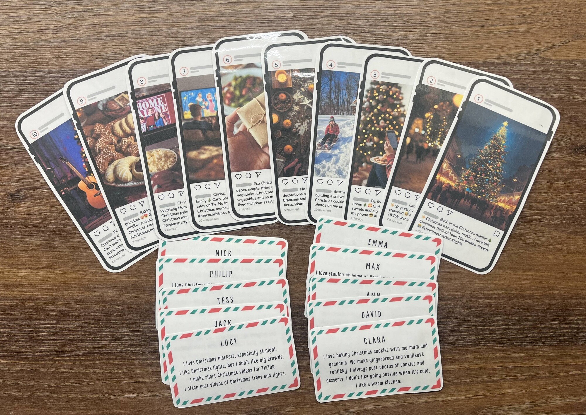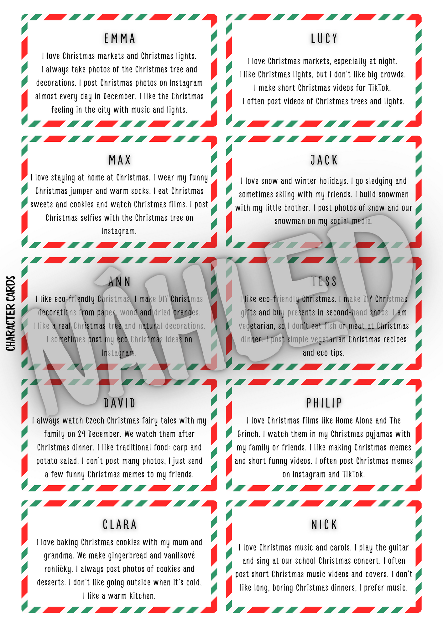 - 10 Christmas posts - krátké vánoční posty na Instagramu (každý post odpovídá jednomu profilu z character cards, ale některé postavy mají podobné charakteristiky, takže žáci musí hledat detailní rozdíly)