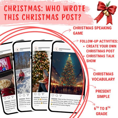 Nechte děti stát se detektivy a odhalit, kdo napsal který vánoční post na Instagramu. Zábavná a komunikační hra, která propojuje svět sociálních sítí s jednoduchou angličtinou A1-A2.