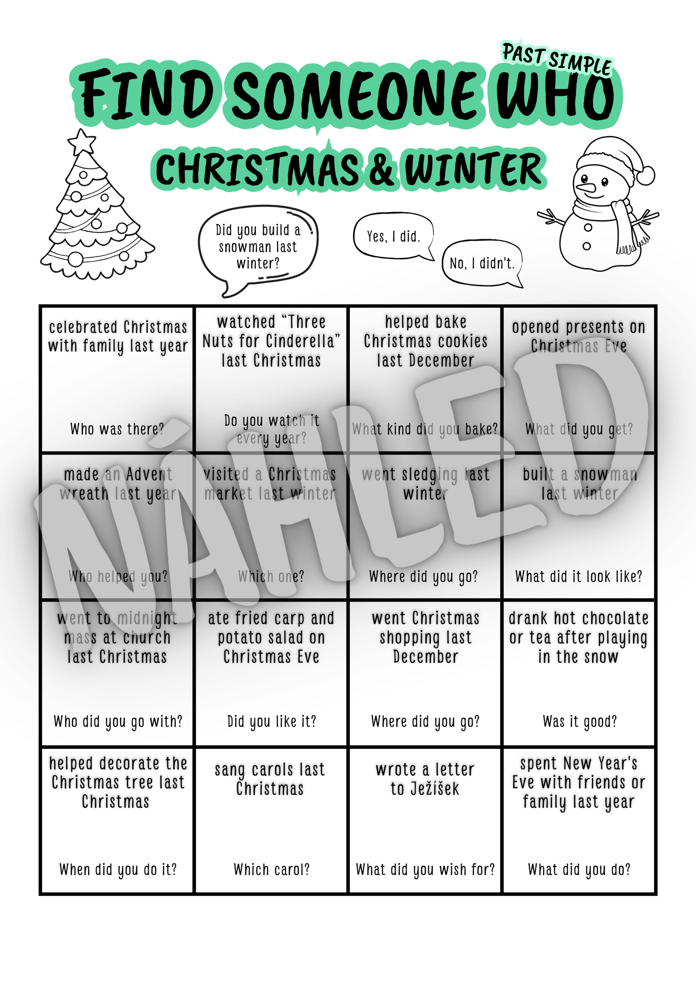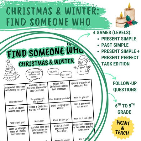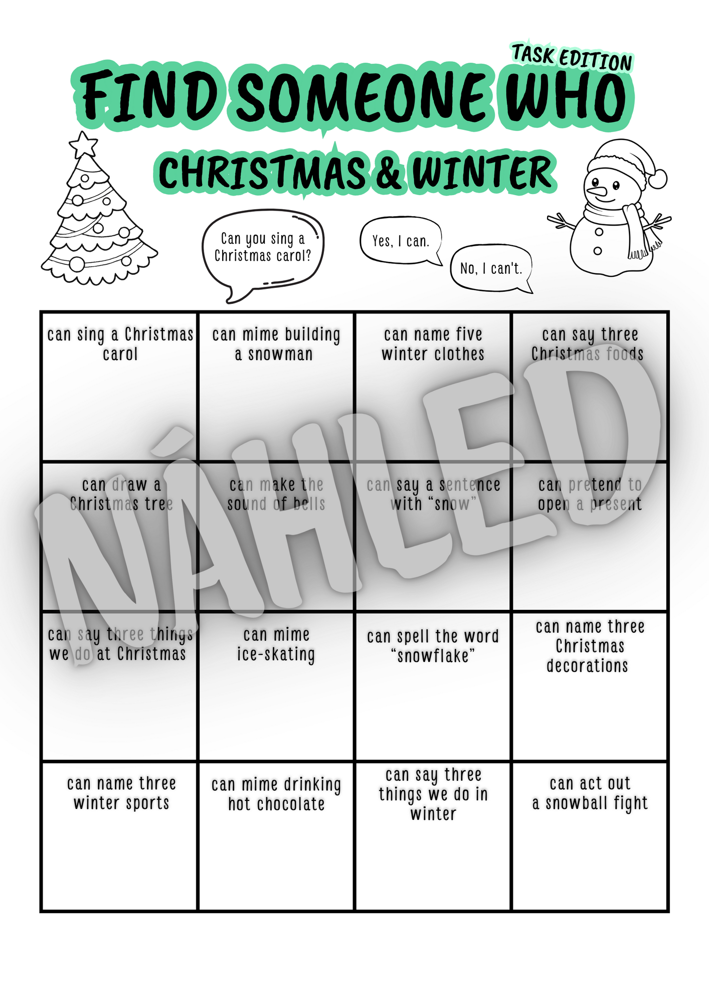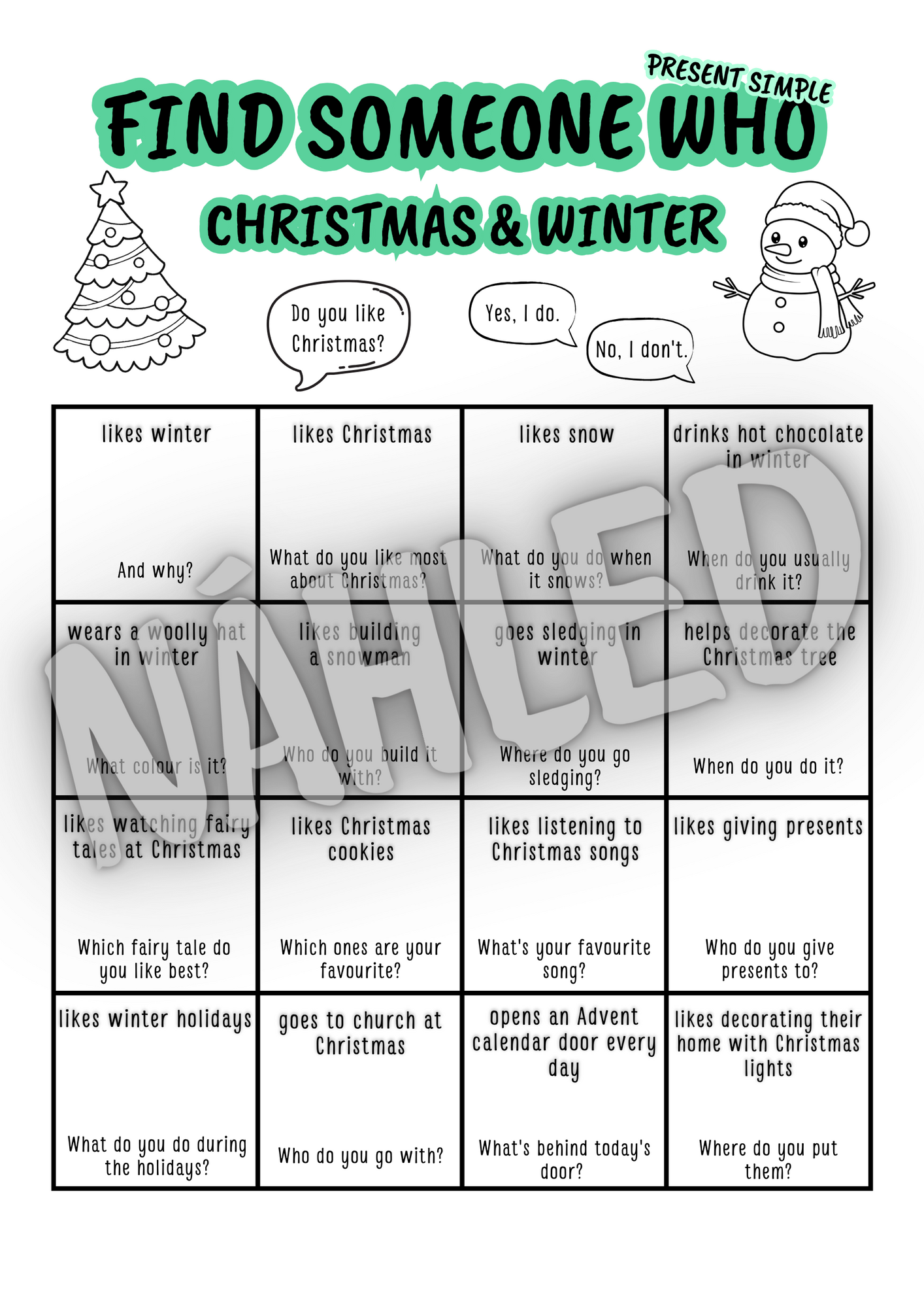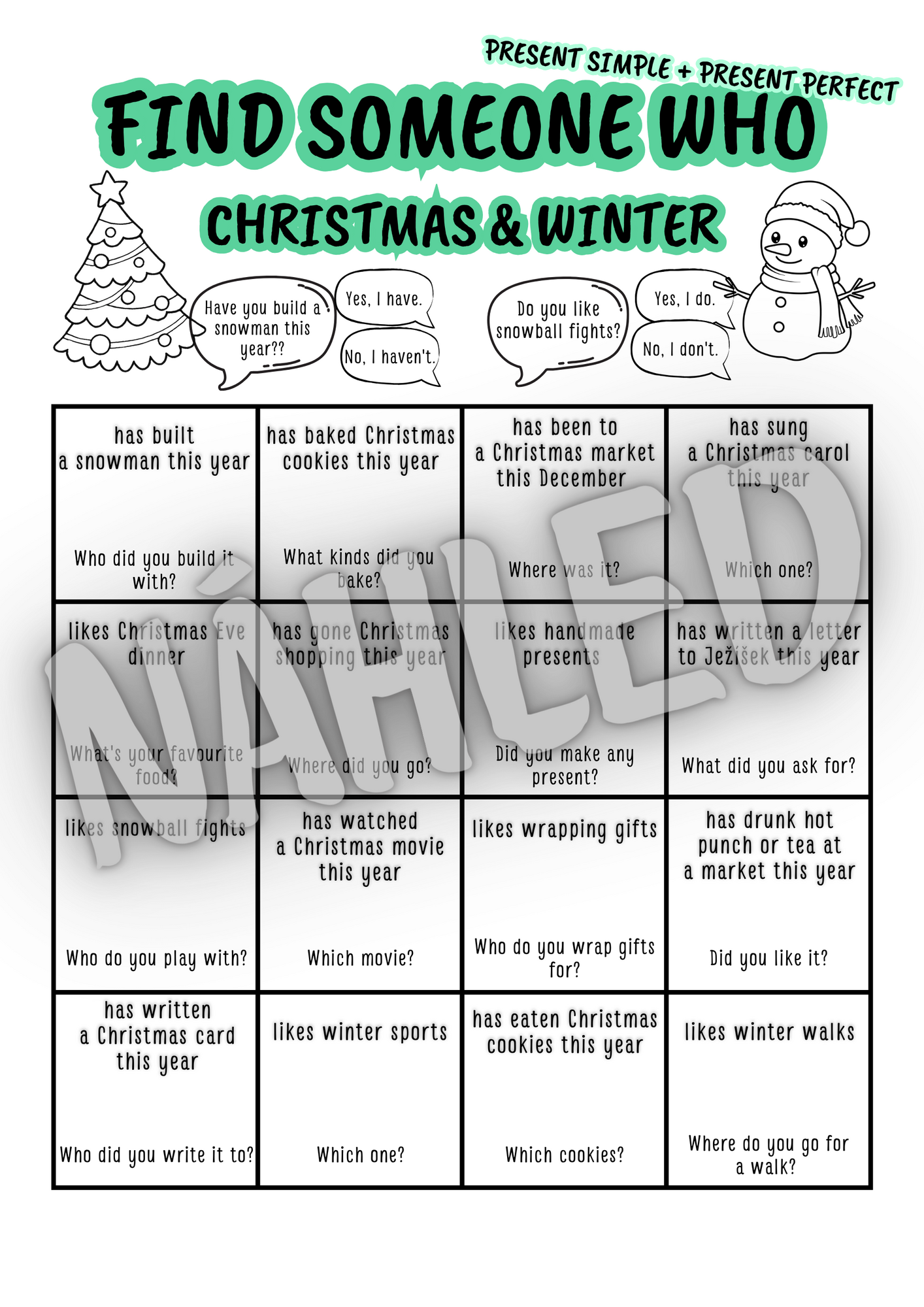 Konverzační aktivita Find someone who... zaměřená na procvičování slovní zásoby na téma Christmas a winter. Aktivita obsahuje navazující otázky, aby se z ní stalo více konverzační cvičení a ne jen “Yes/No game”.