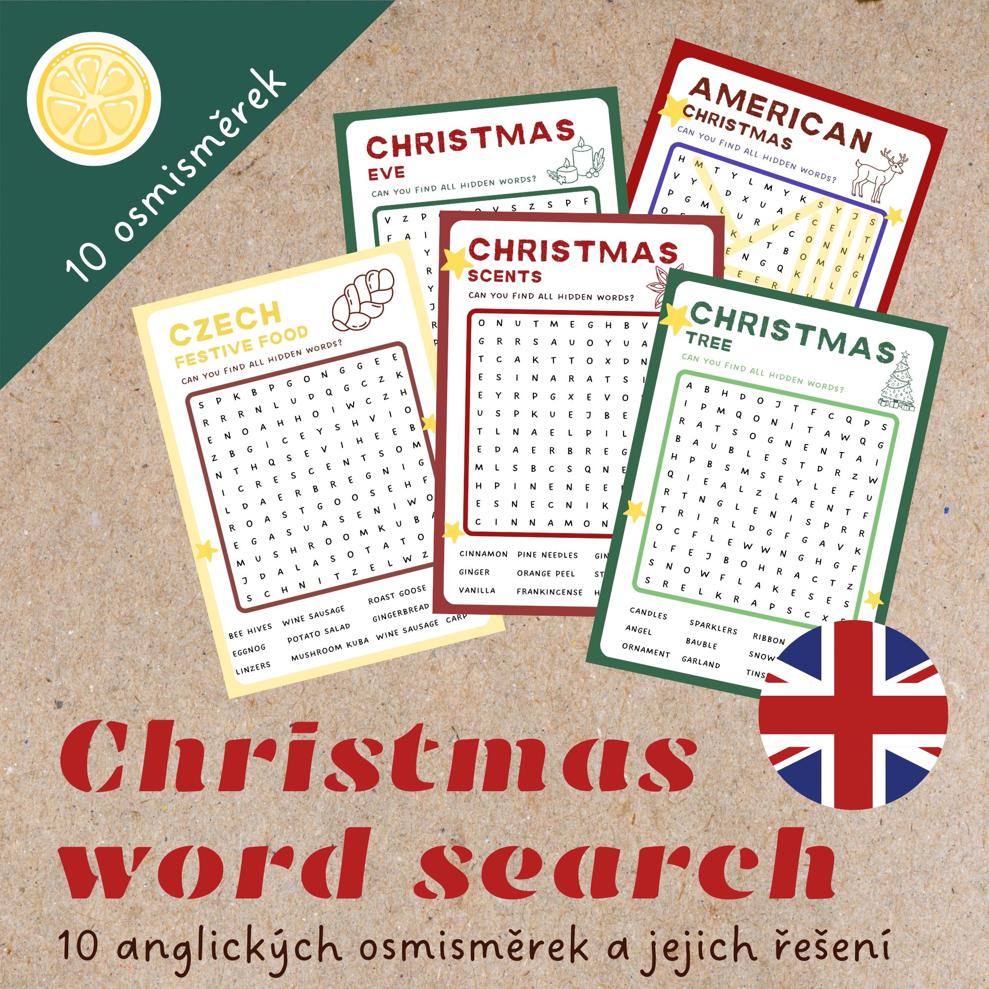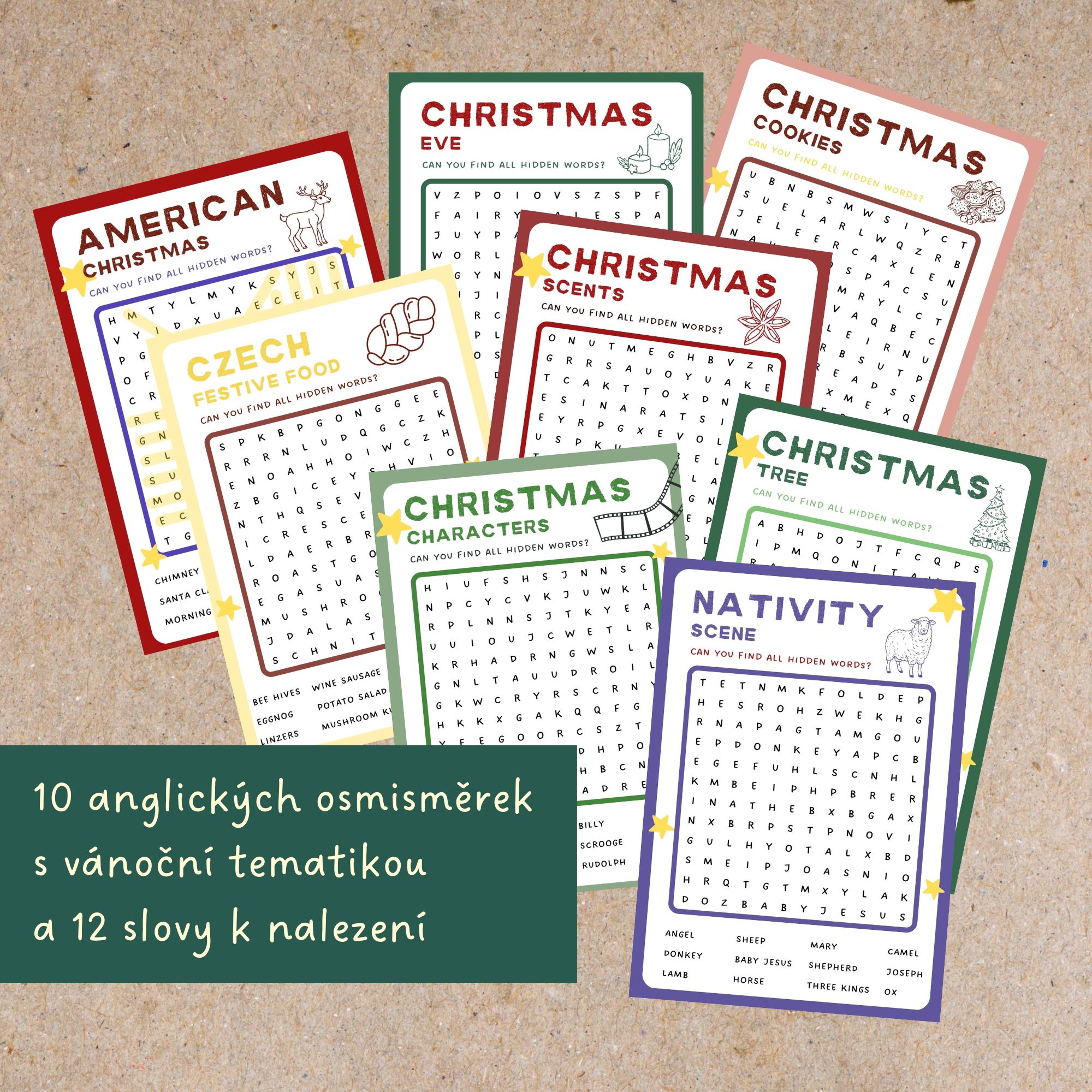 ⭐Témata: Christmas tree, Christmas Eve, Christmas cookies, Czech festive food, Christmas decorations, Nativity scene, Christmas scents, Christmas characters, American Christmas, Christmas activities