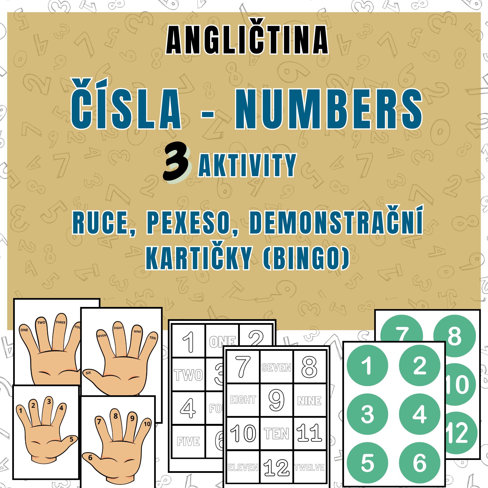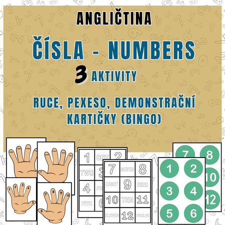 Obsah materiálu ČÍSLA - NUMBERSToto PDF obsahuje 10 stran.4 stránky s rukama ( 2 stránky s čísly, 2 s nápisy)2 stránky s čísly2 stránky pexesa s 2 stránkami na oboustranné vytisknutÍ