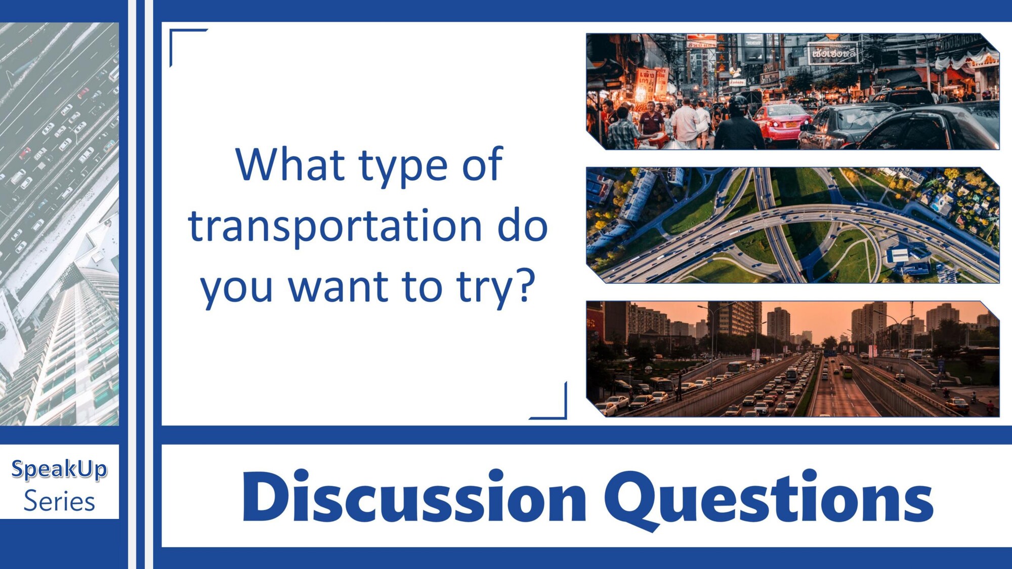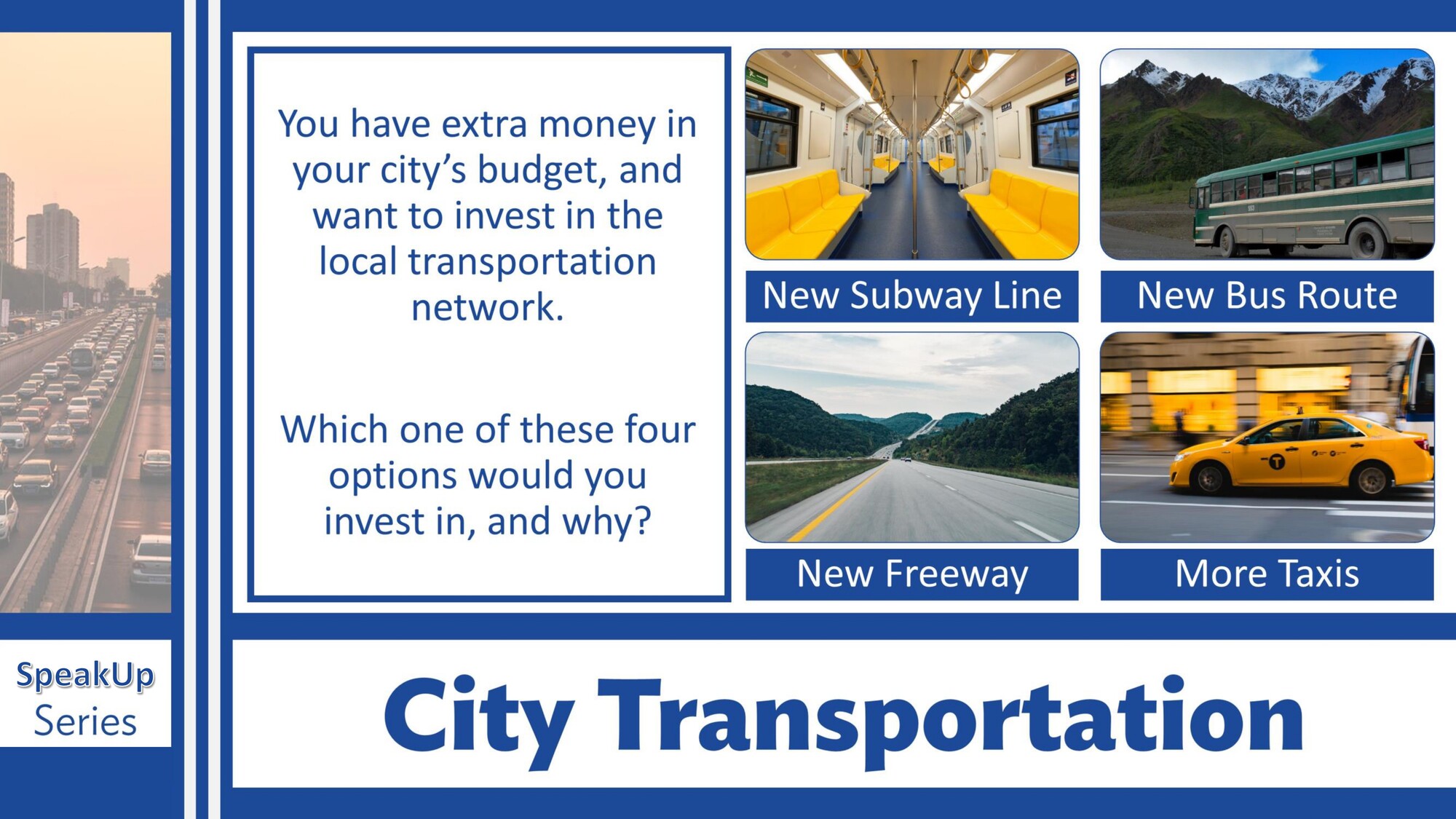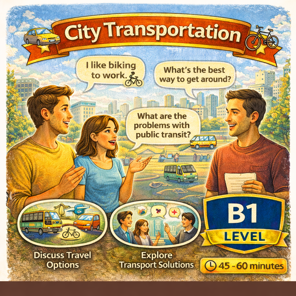 Materiál SpeakUp 12 – City Transportation se zaměřuje na dopravu ve městě. Studenti mluví o způsobech cestování, preferencích, problémech v dopravě a navrhují řešení pro městskou mobilitu.