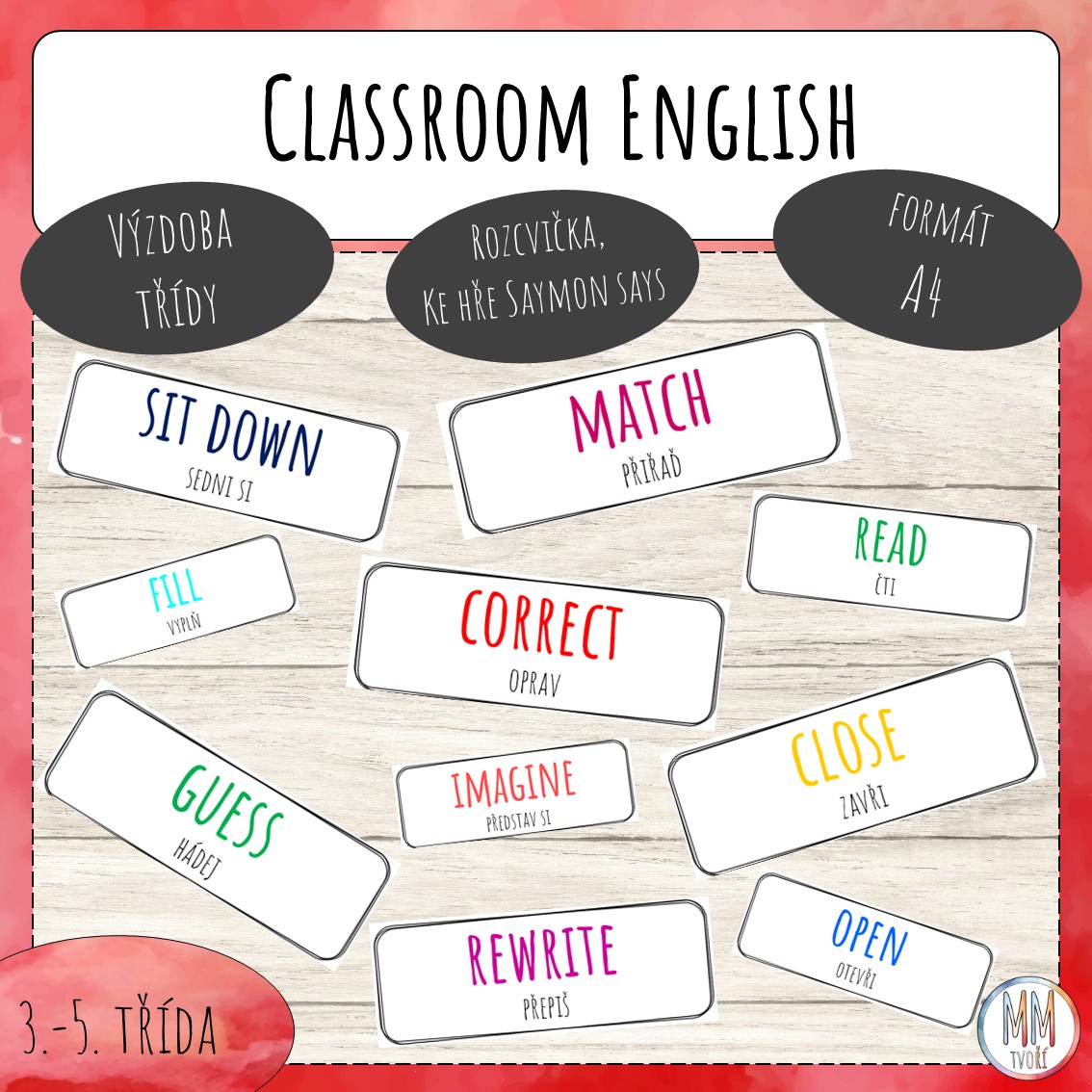 Soubor obsahuje 28 karet s anglickými pokyny, které se běžně využívají ve třídě. Karty je možné rozvěsit ve třídě či je používat při hře Saymon says.