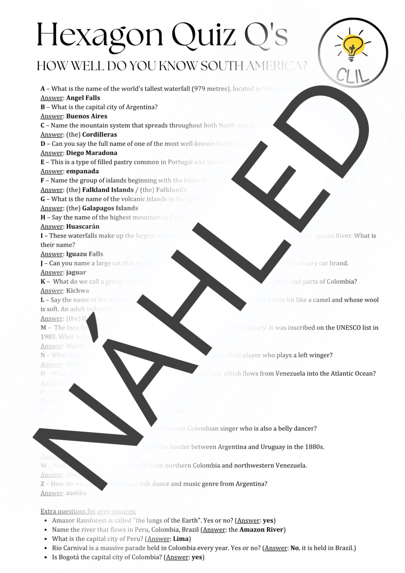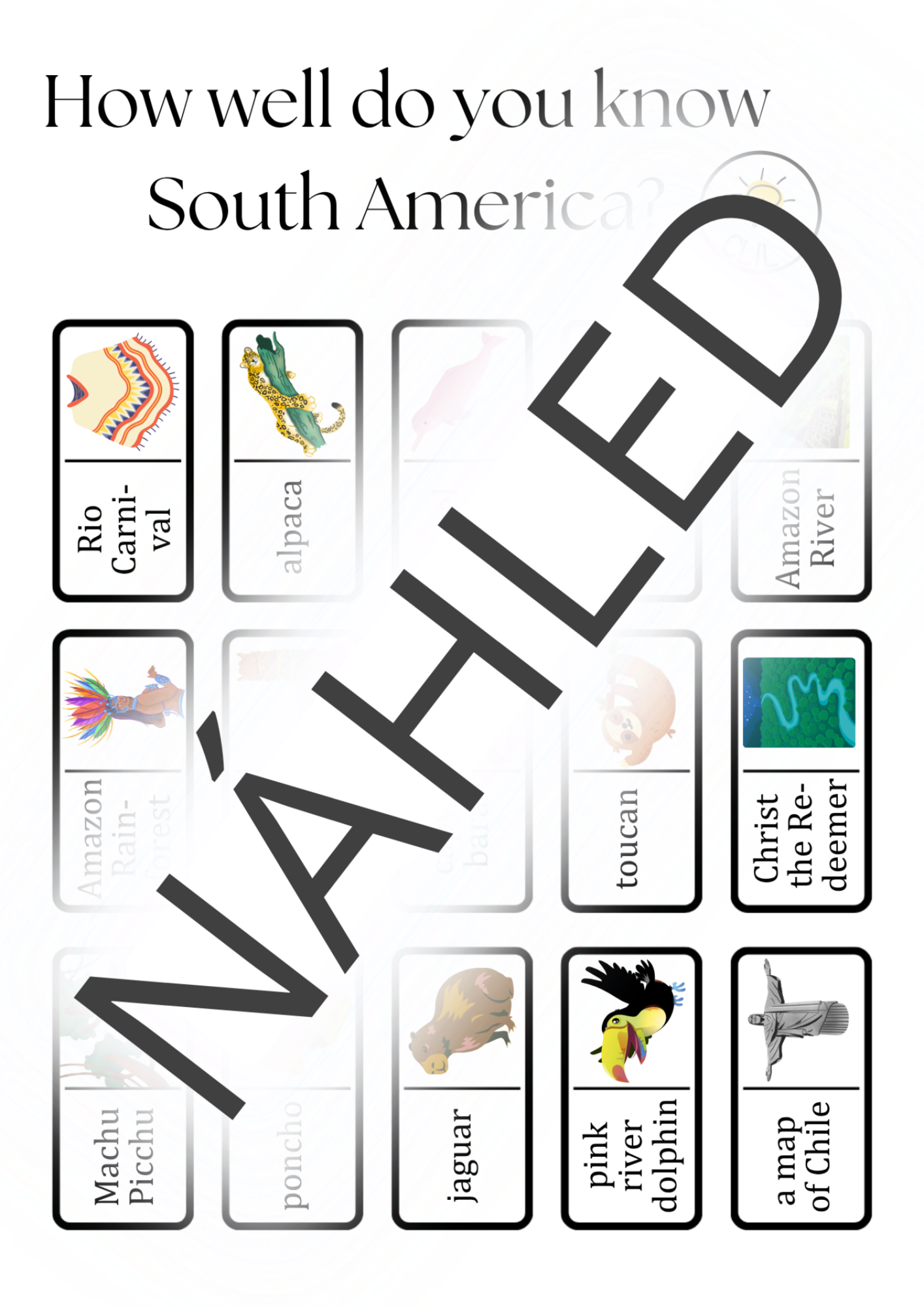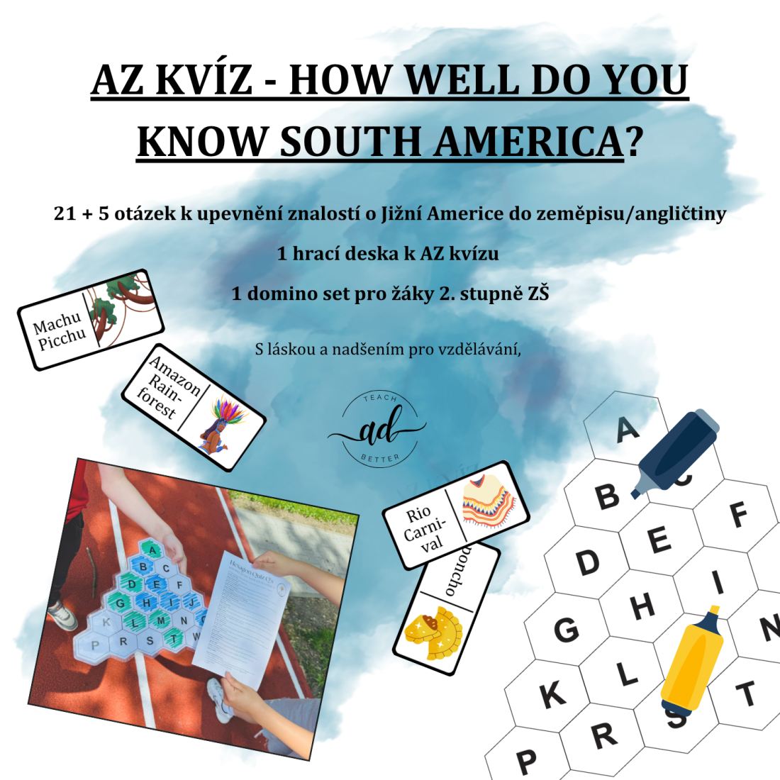 materiál, který jsem pro Vás připravila, je zábavným kvízem uzpůsobeným k procvičení znalostí o Jižní Americe pro žáky 2. stupně ZŠ. Hru lze použít jako motivační element v CLIL hodinách zeměpisu popřípadě lze využít v hodinách anglického jazyka.