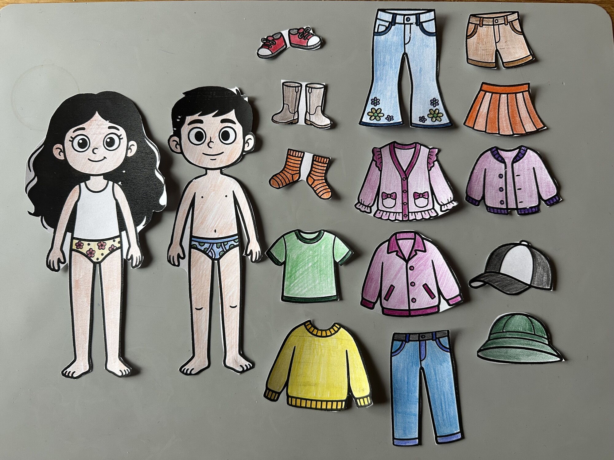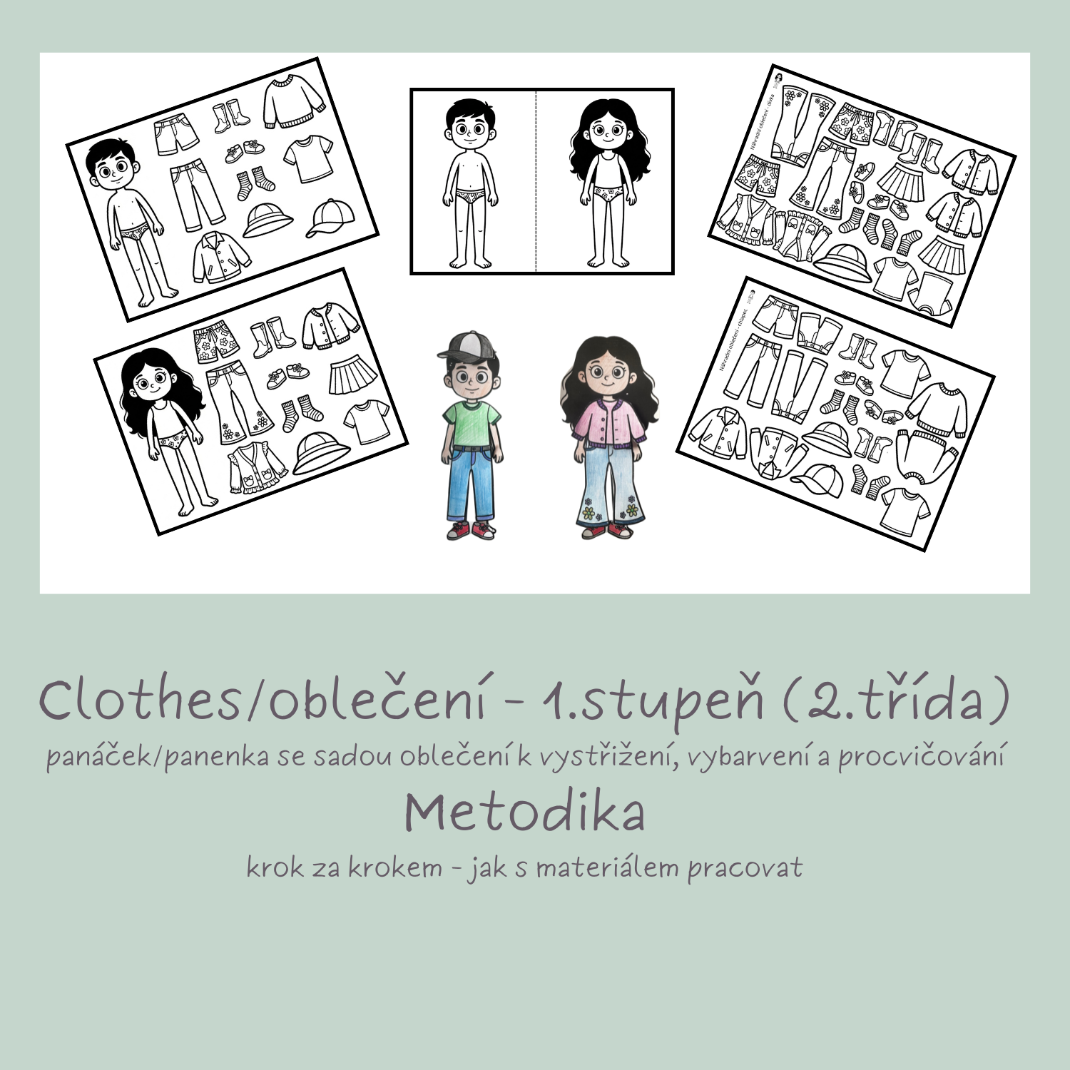 Tento didaktický materiál slouží k audio-orálnímu procvičování slovní zásoby na téma Clothes (oblečení), zejména ve 2. třídě, případně i v 1. třídě, tedy v prostředí, kde se žáci ještě primárně nesoustředí na psaný projev. Využít jej mohou i žáci vyšších ročníků 1. stupně. Žáci pracují s panáčkem/panenkou a sadou oblečení, které si vybarví, vystřihnou a následně využívají při řízených i párových aktivitách.