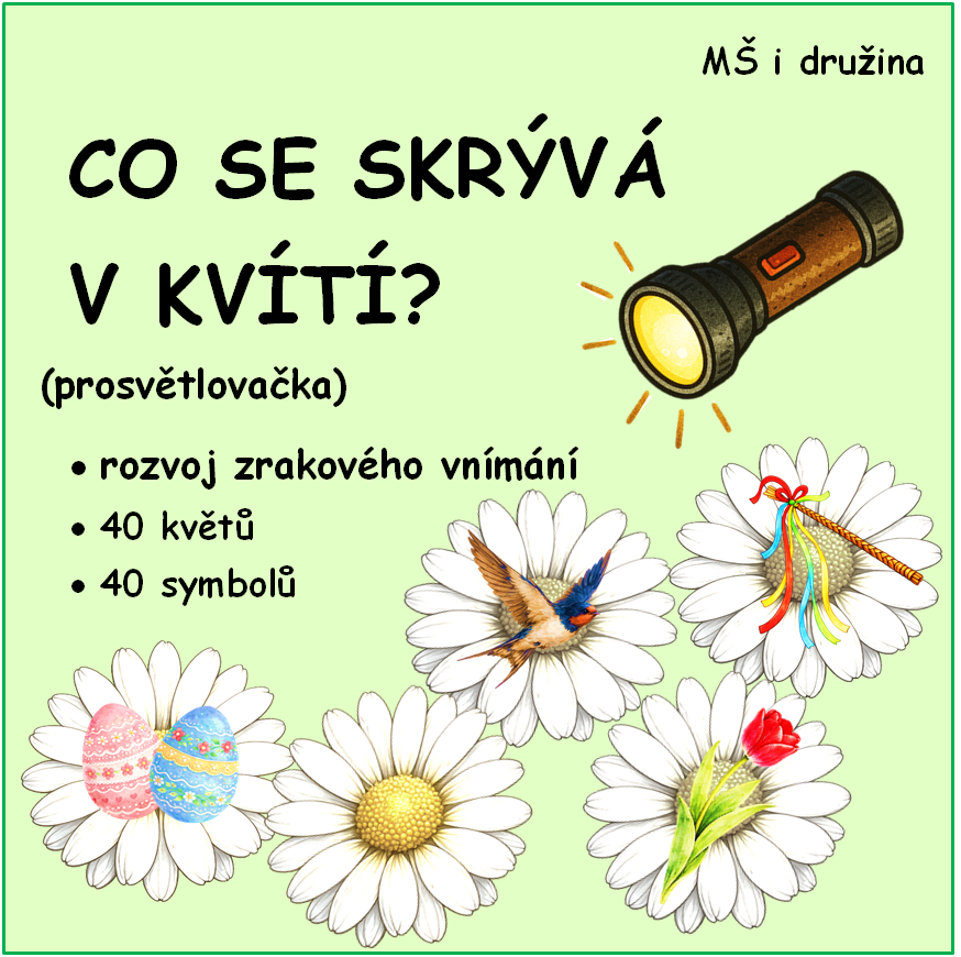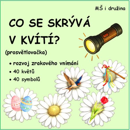 Materiál je vhodný pro malé i velké děti, které budou baterkou prosvěcovat vločky, zkoumat, co se v nich ukrývá a rozvíjet zrakovou percepci. Obsahuje jednu stranu květů a další strany s celkem 40 symboly, které souvisí s jarem a Velikonocemi.
