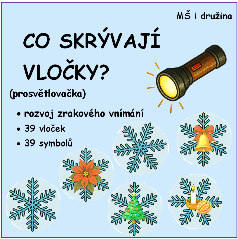 Materiál je vhodný pro malé i velké děti, které budou baterkou prosvěcovat vločky, zkoumat, co se v nich ukrývá a rozvíjet zrakovou percepci. Obsahuje jednu stranu vloček a další strany s celkem 39 symboly, které souvisí s vánoční a zimní tématikou.