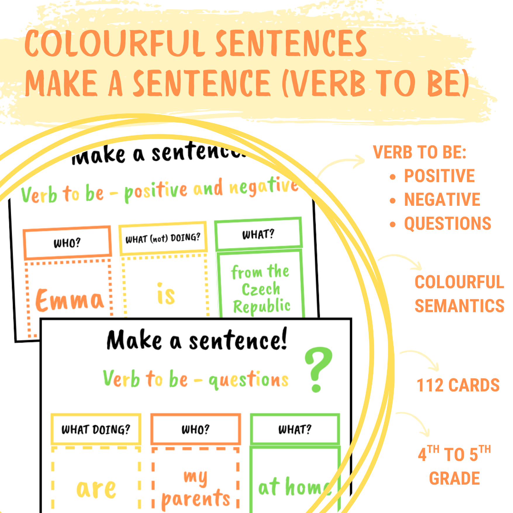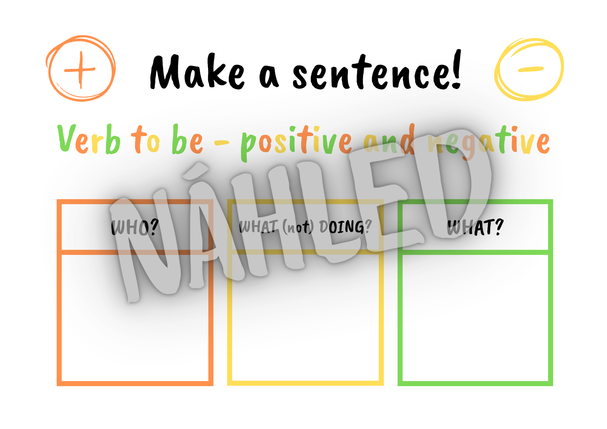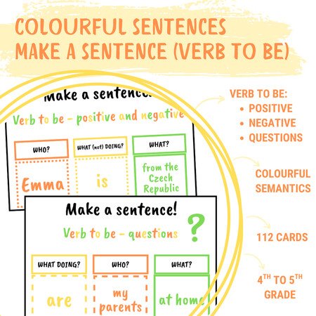 Aktivita zaměřená na sloveso to be, při které žáci s pomocí barevné předlohy a barevných kartiček vytvářejí věty a zároveň se tím učí anglický slovosled. Aktivita se týká kladných vět, záporných vět i otázek.