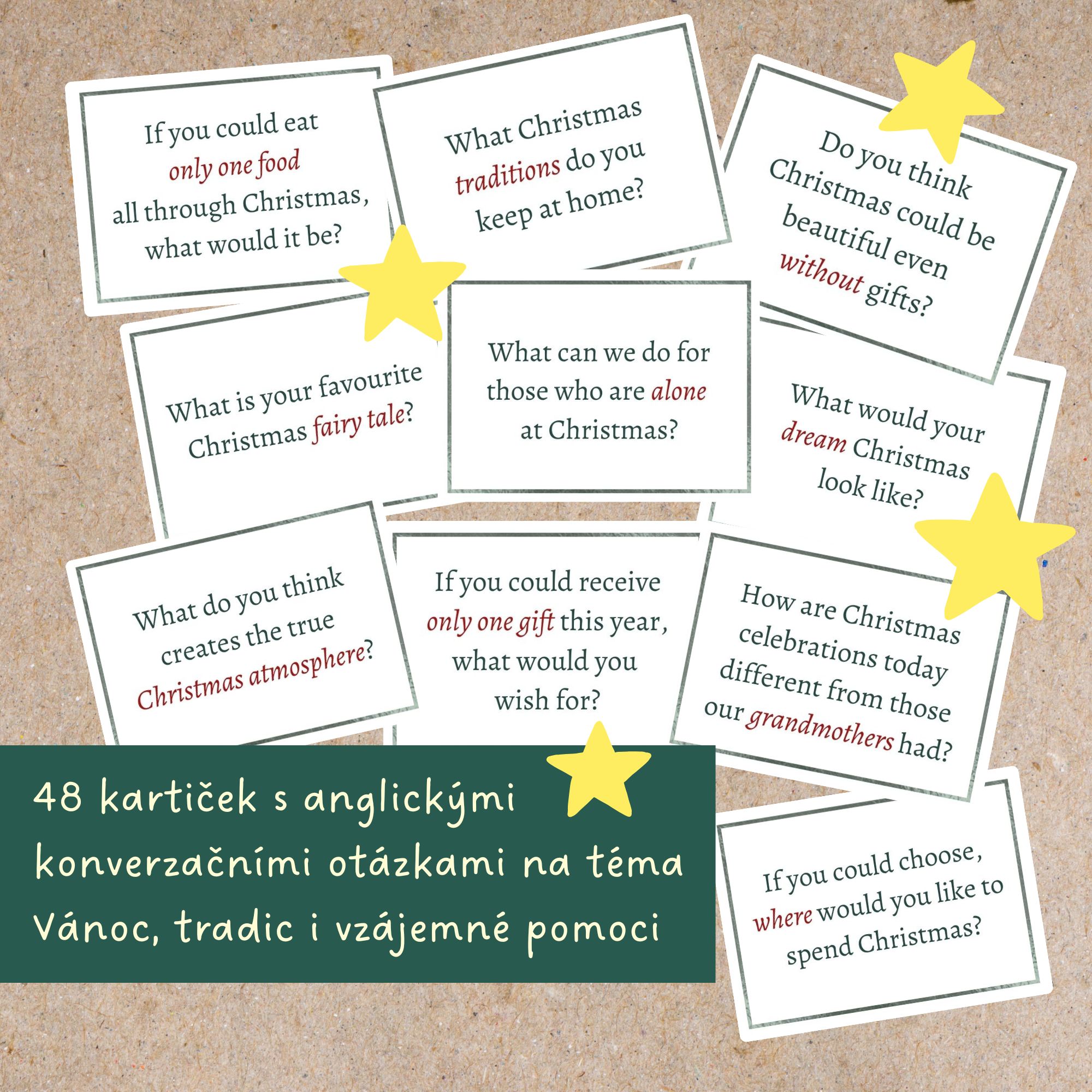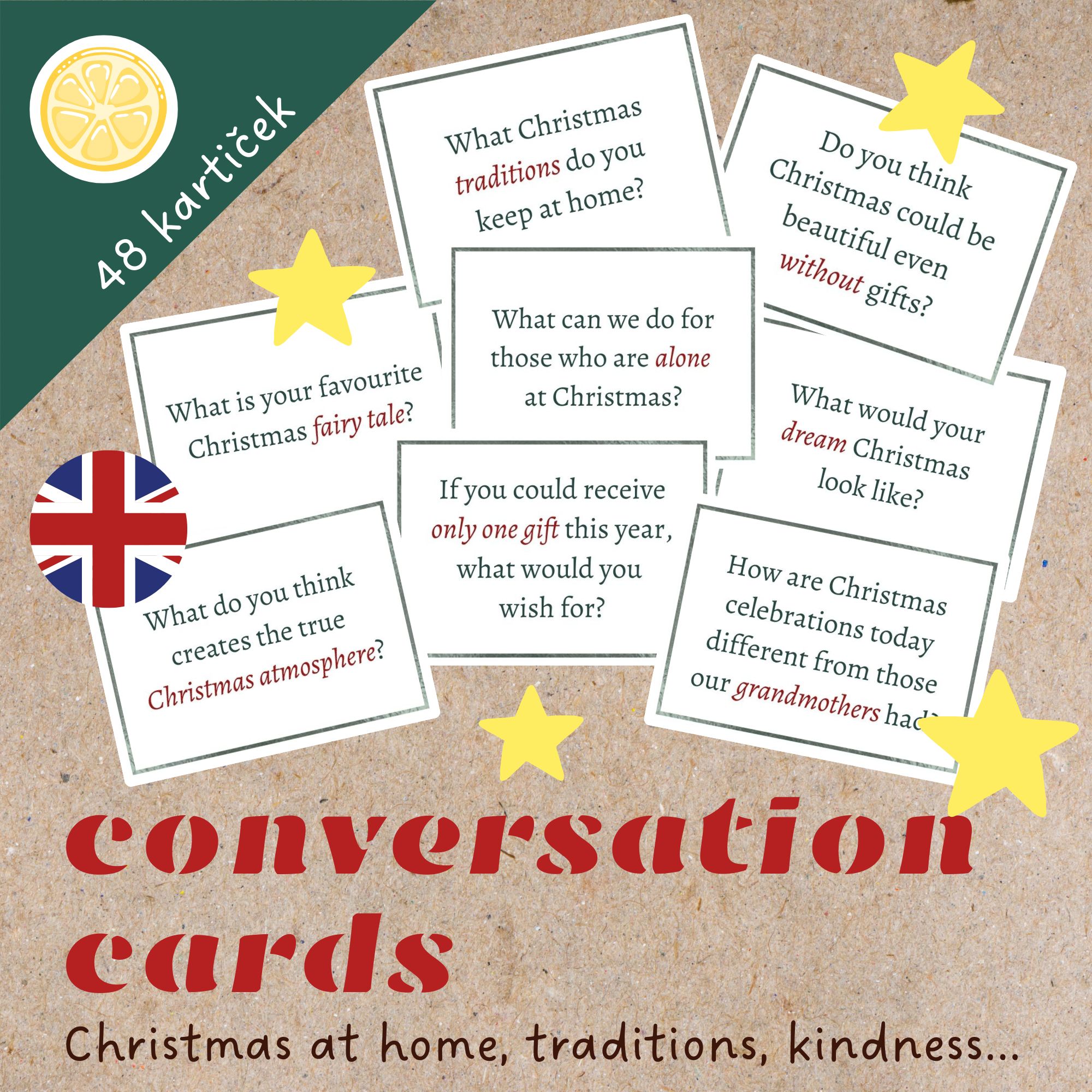 ⭐Soubor anglických konverzačních kartiček zaměřených na Vánoce vám ve třídě pomůže nastartovat diskuzi o tom, jak svátky slavíme doma, jak je prožíváme, jaké tradice dodržujeme nebo také o tom, jak bychom mohli pomoci těm, kdo je nemají tak šťastné a veselé jako my.