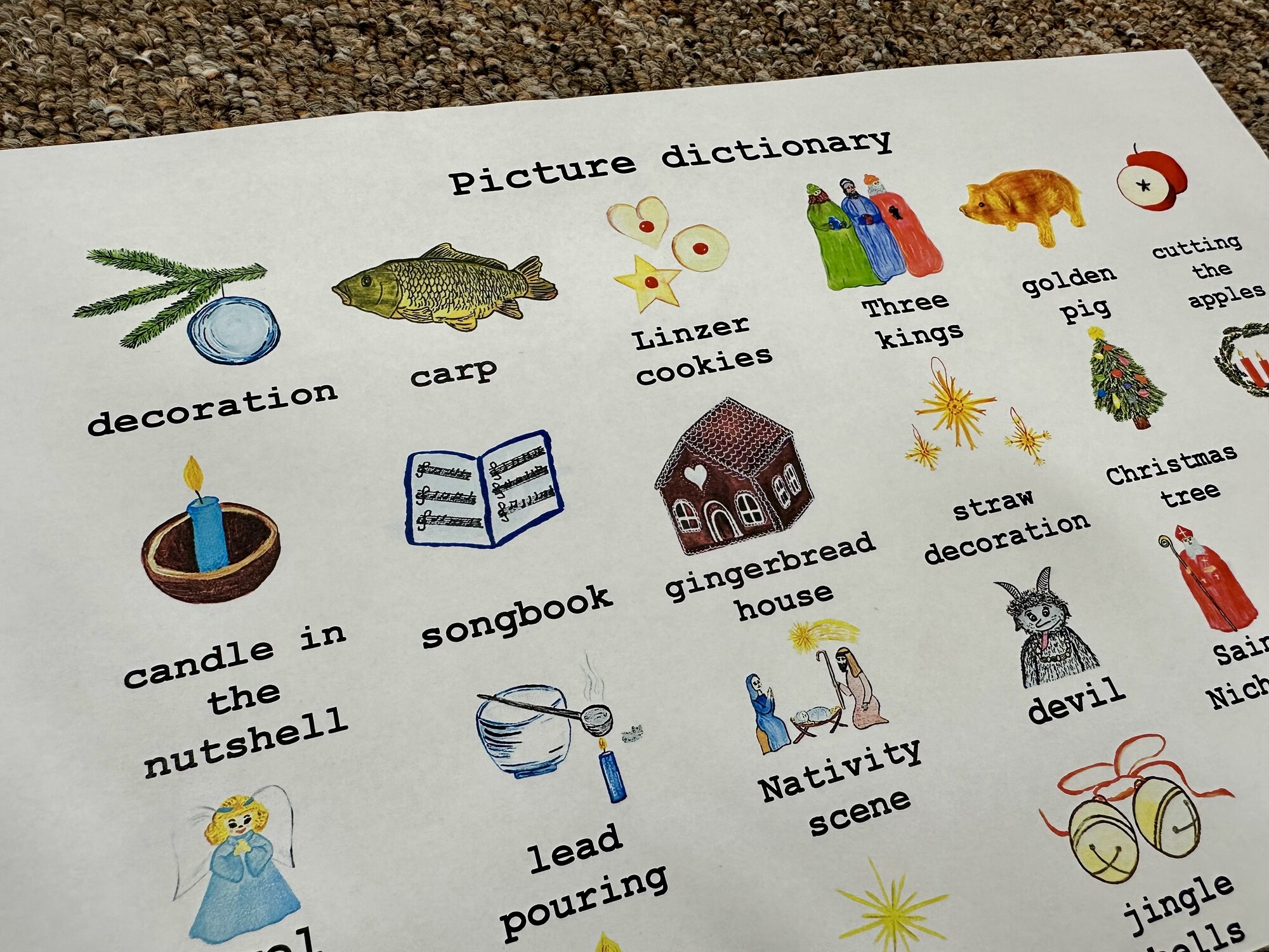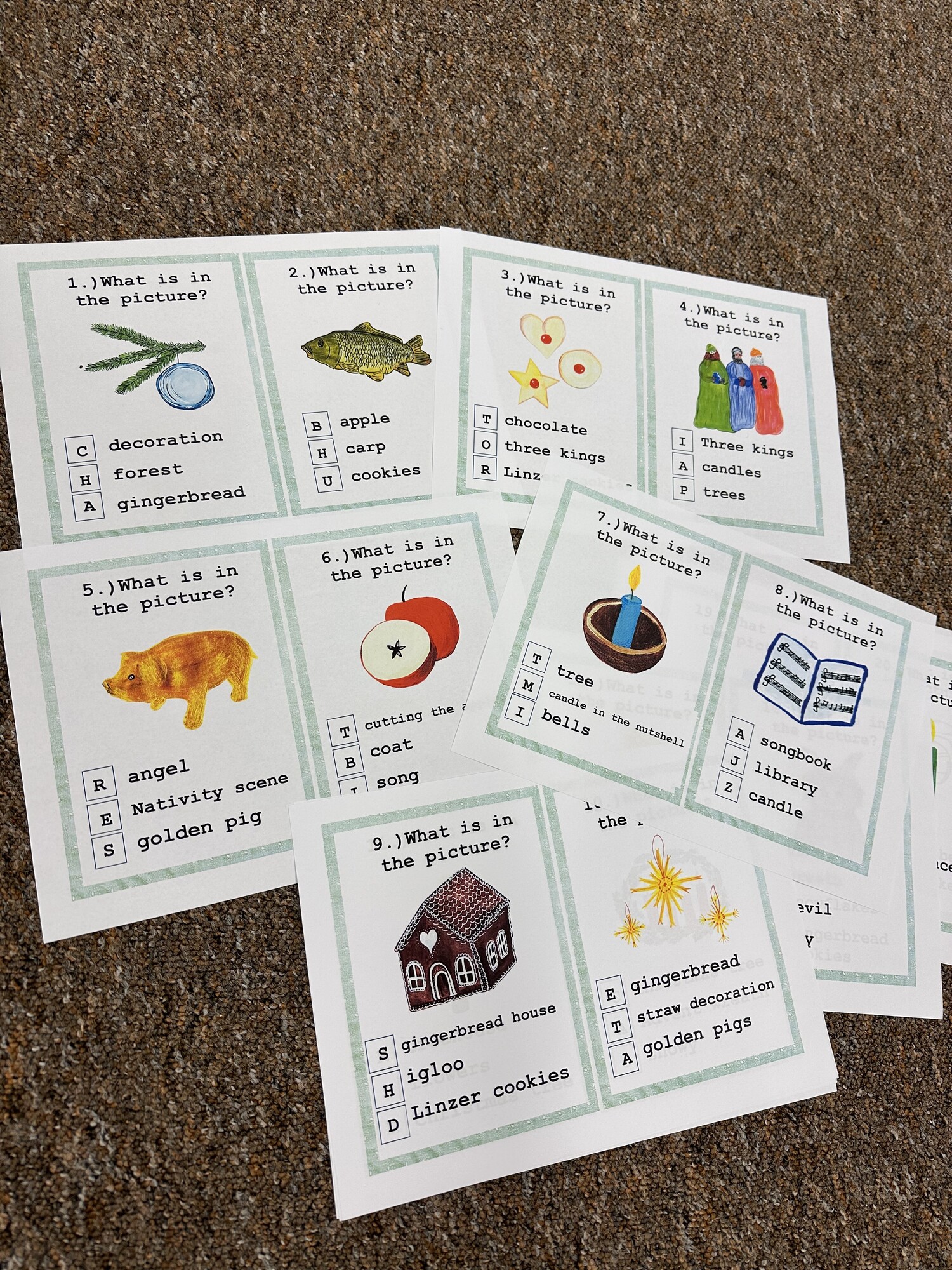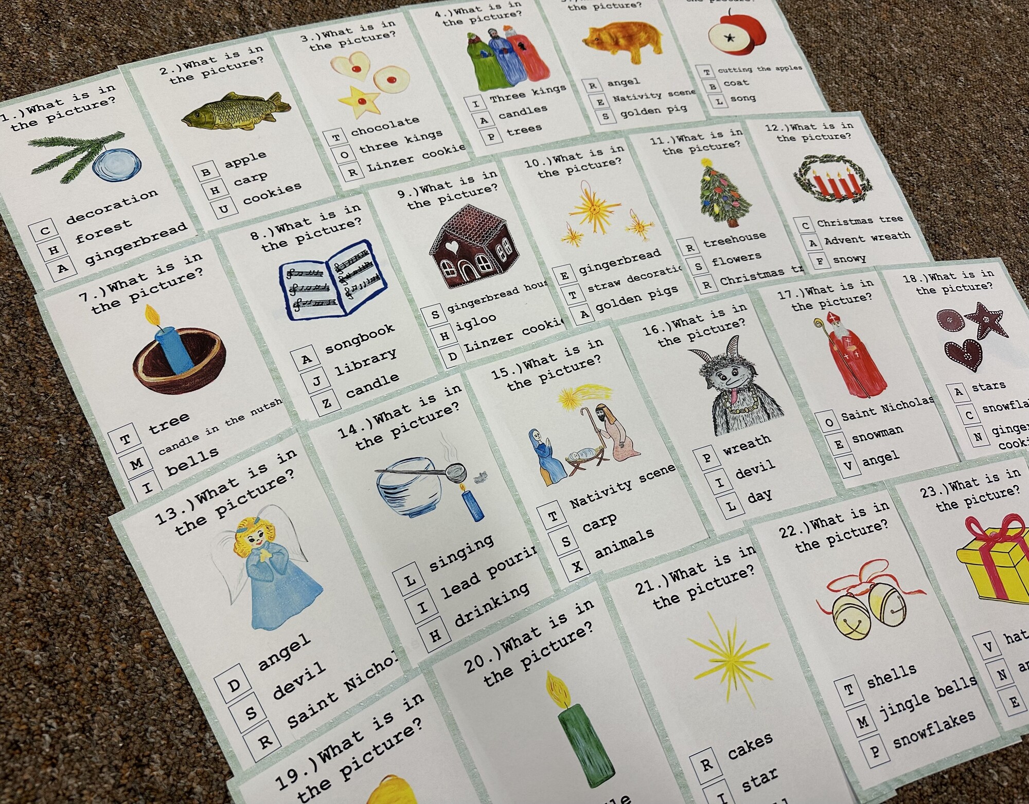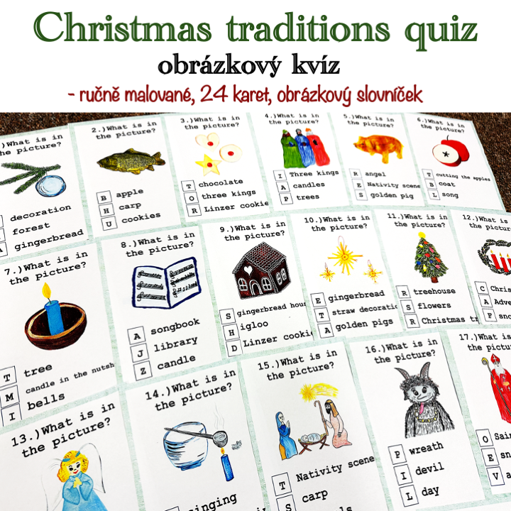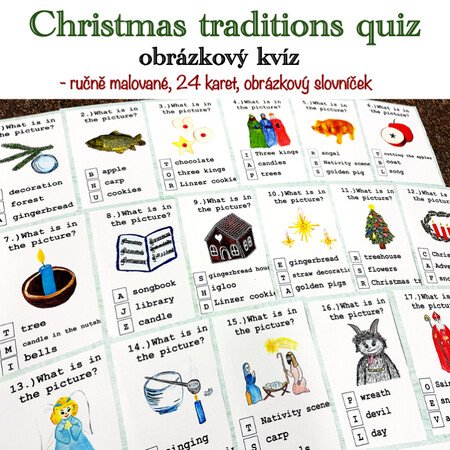 Materiál obsahuje 14 A4 stran – 24 karet s otázkami, list k zápisu odpovědí, obrázkový slovníček.