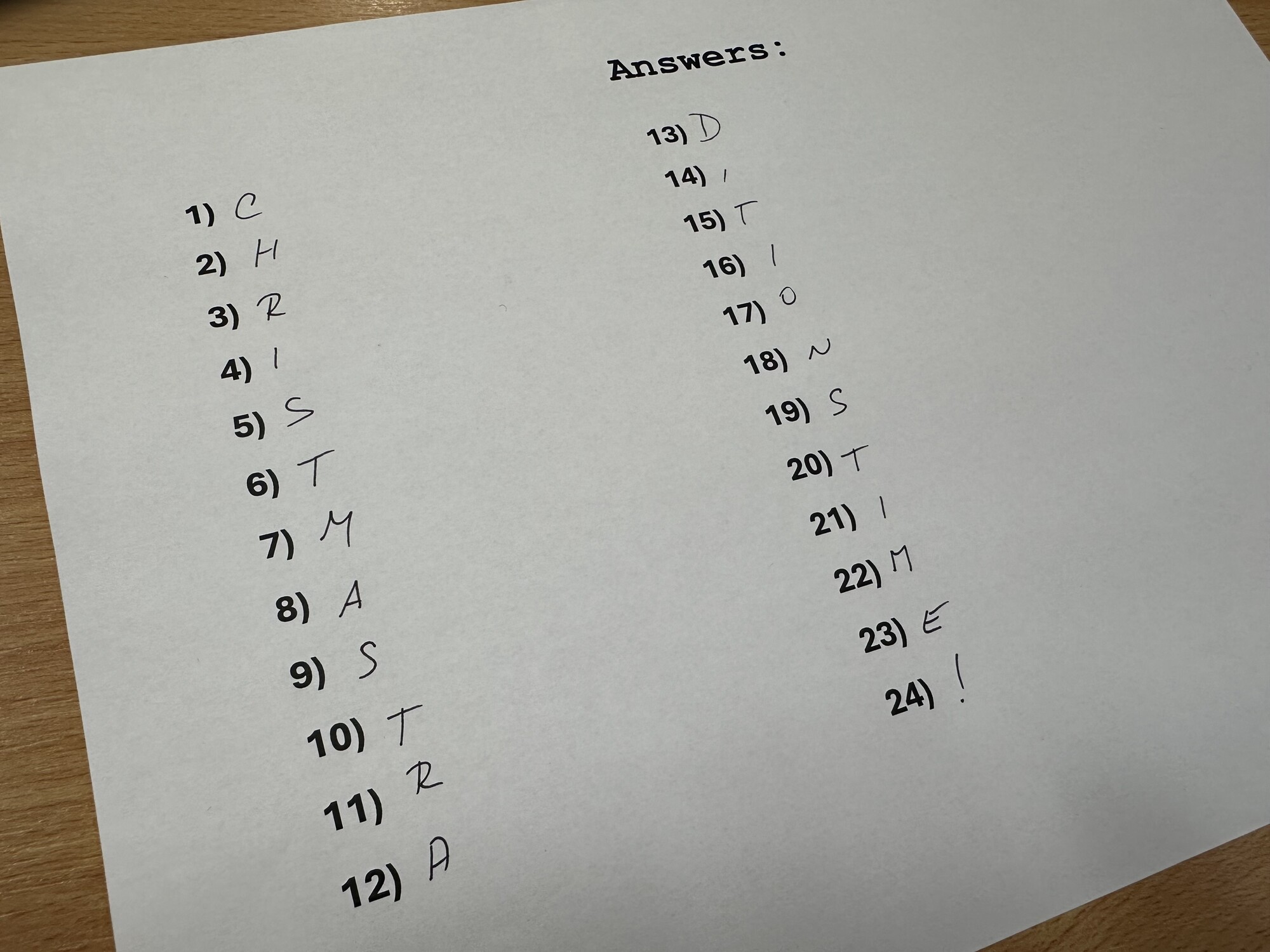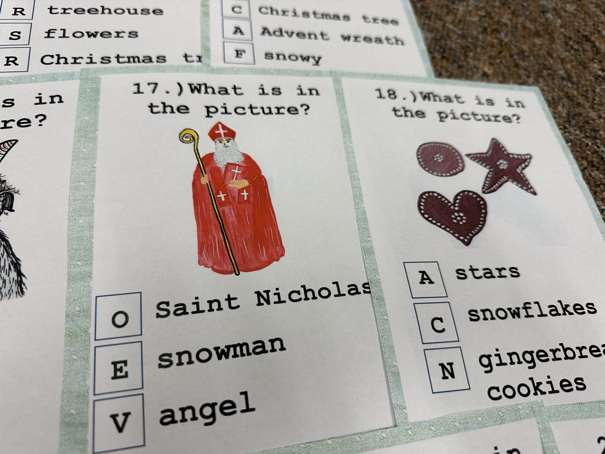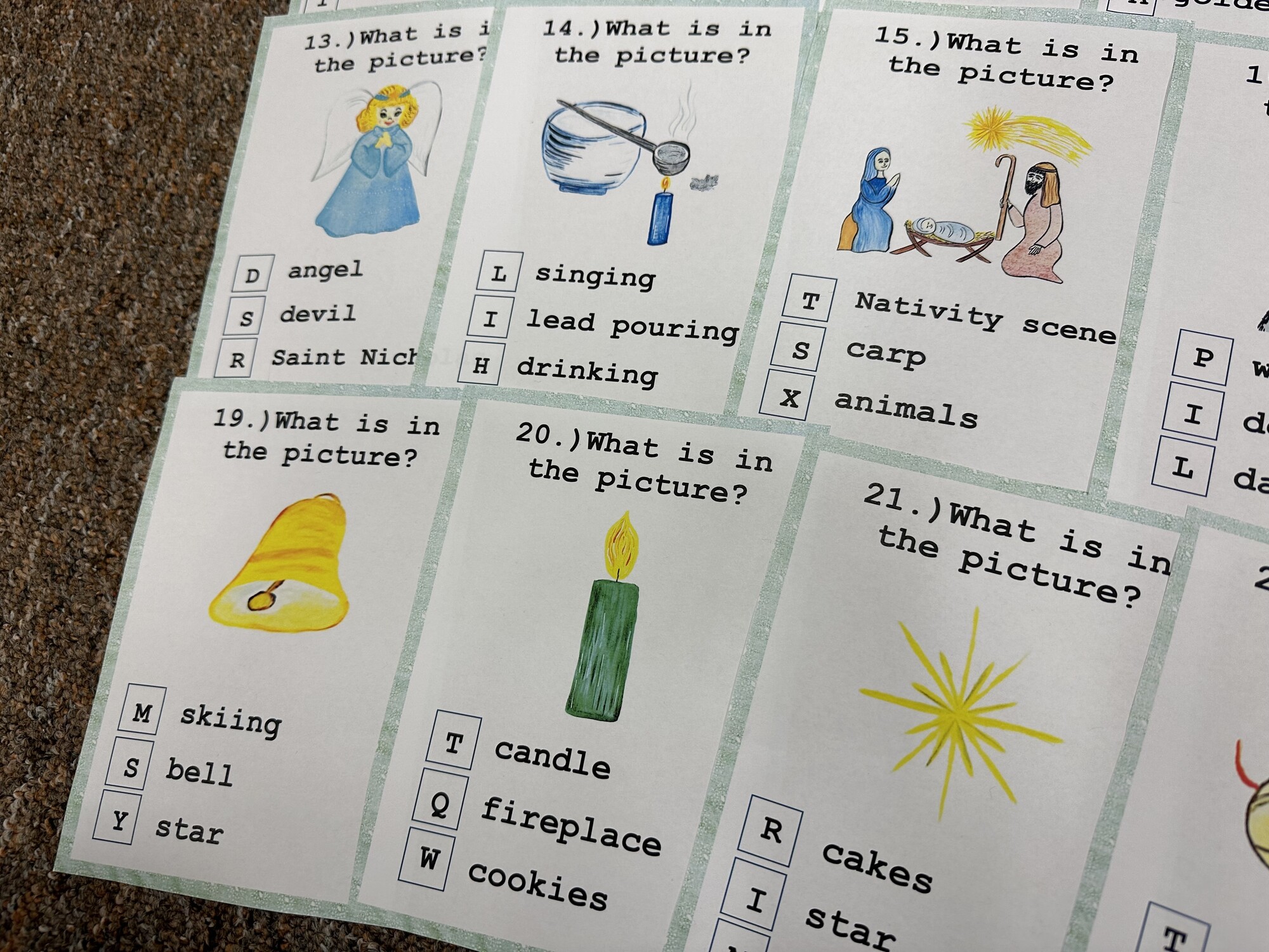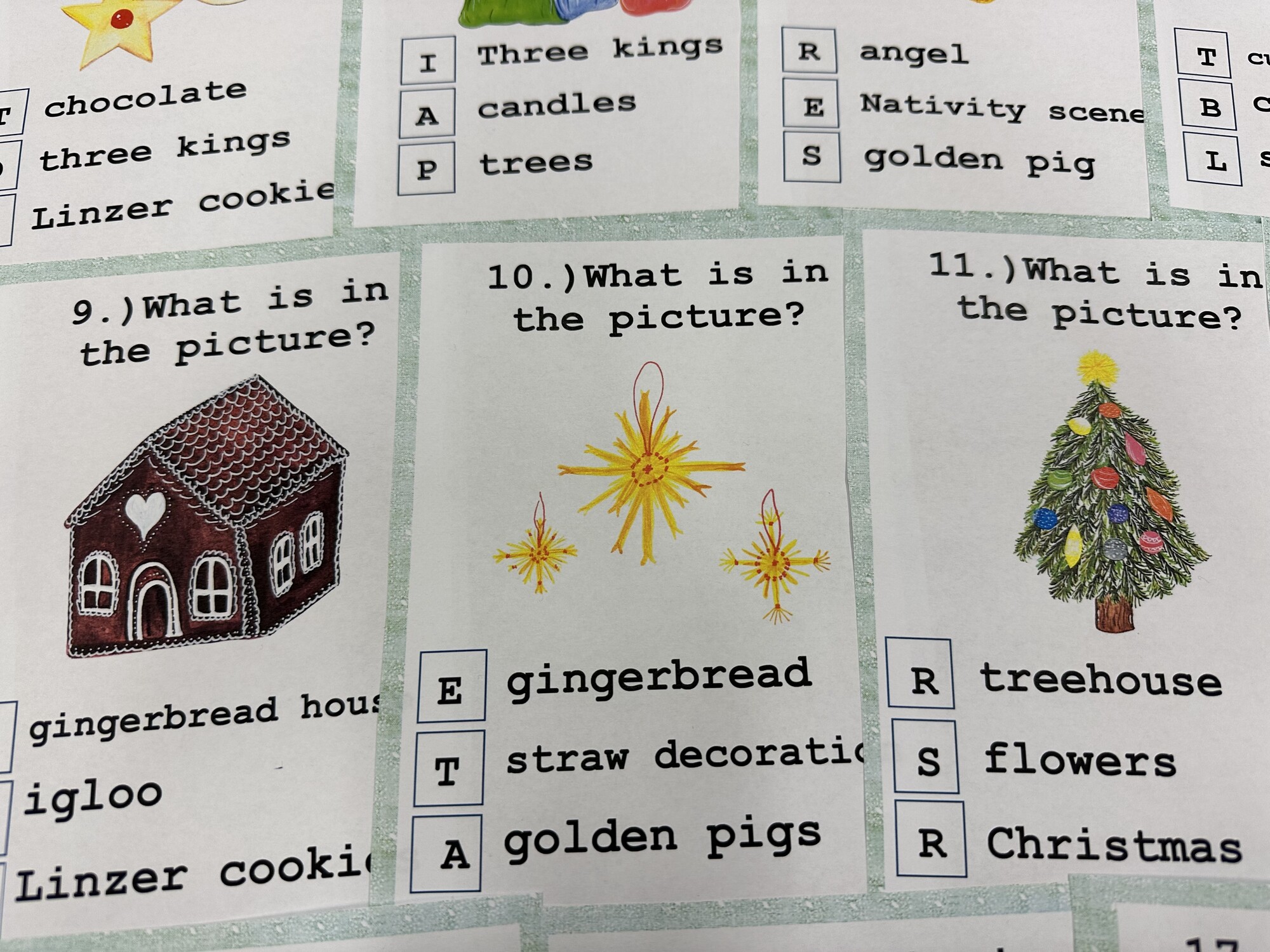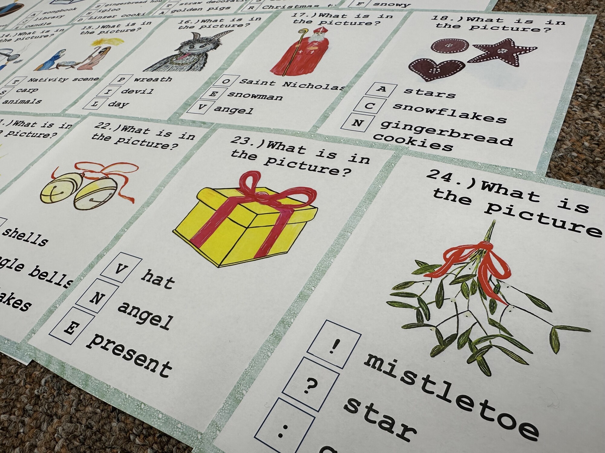 Otázky jsou očíslované. Děti zapíší příslušné písmeno u možnosti, kterou vybrali jako správnou. Správné řešení je CHRISTMAS TRADITIONS TIME!