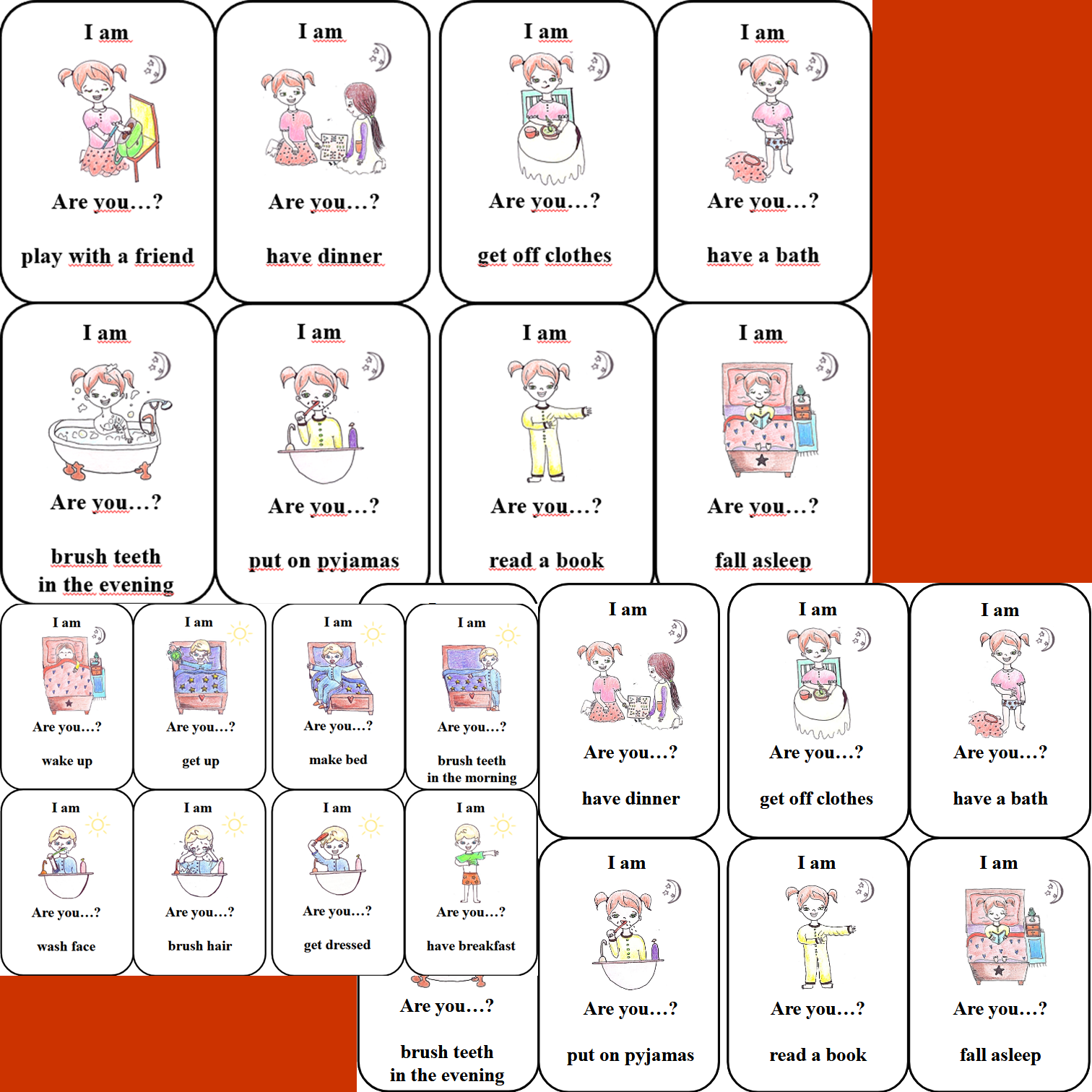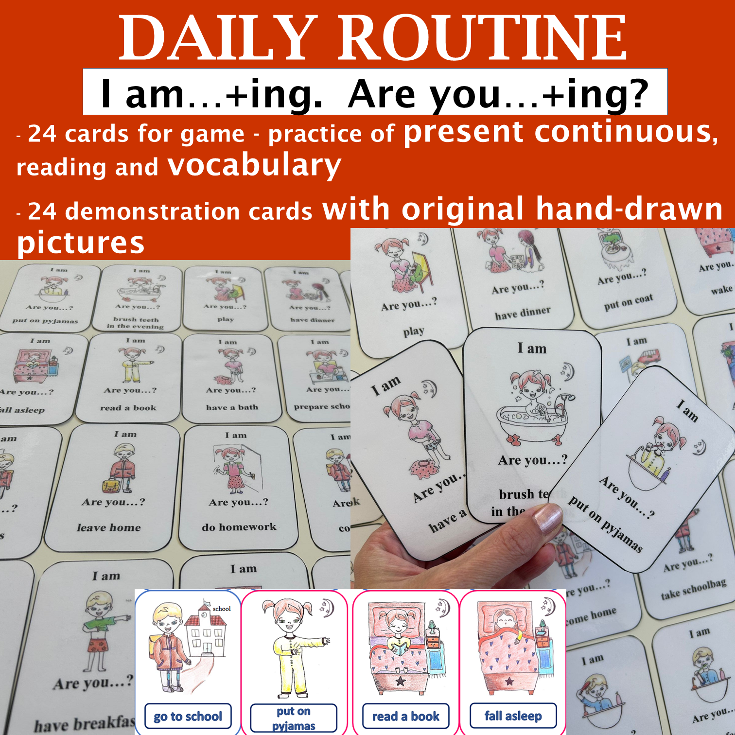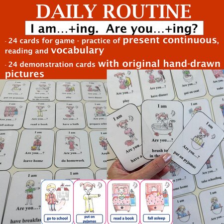 6 stran formátu A4, 24 herních karet „Já mám… Kdo má…?“ – tedy „I am ... -ing. Are you ... -ing?“ (tvoření věty, odpovědi a otázky v přítomném průběhovém čase) + 24 demonstračních obrázkových kartiček pro úvod nebo samostatné aktivity.