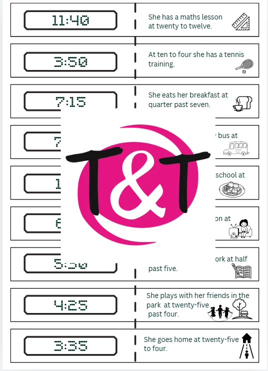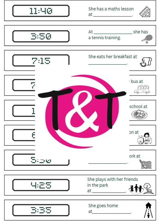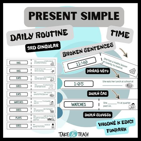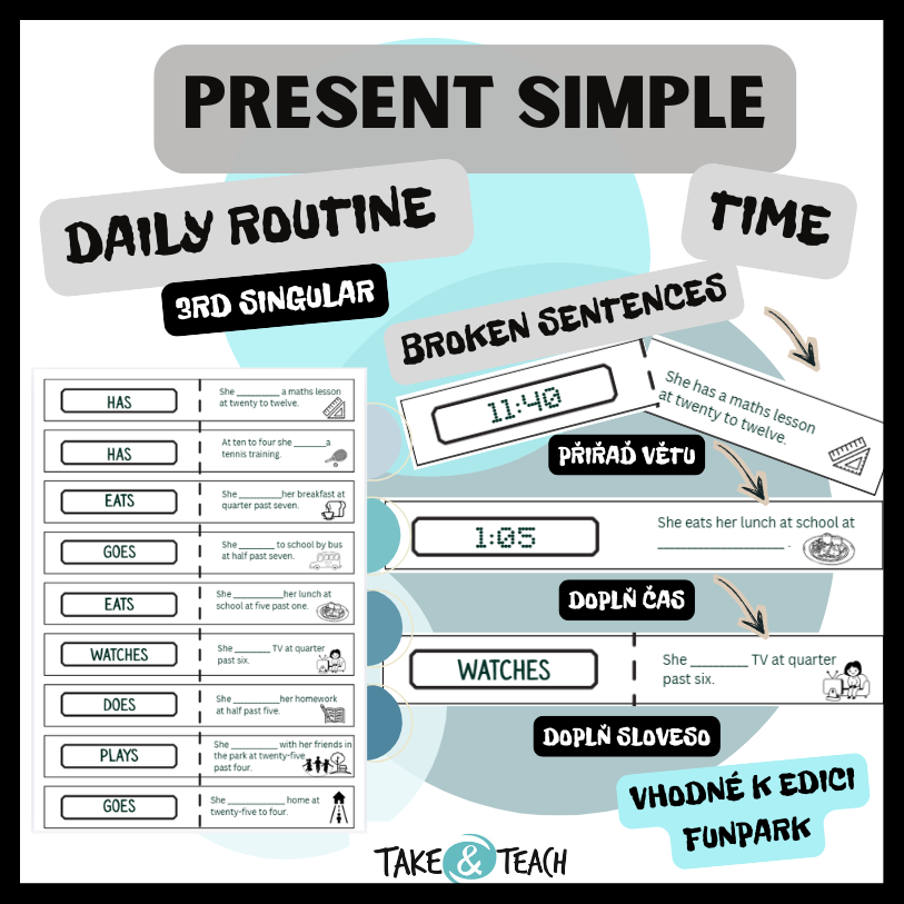 Procvičte s žáky denní režim a čas v aktivitě broken sentences. 3 varianty aktivit: spoj čas a větu, doplň časový údaj, doplň - přiřaď vhodné sloveso. Slovní zásoba je vhodná k edici FUNPARK. Černobílý tisk.