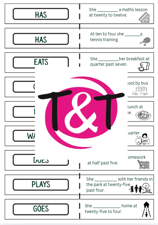 Materiál je zaměřený na slovní zásobu denního režimu + časové údaje + 3 osobu čísla jednotného s koncovkou -S.