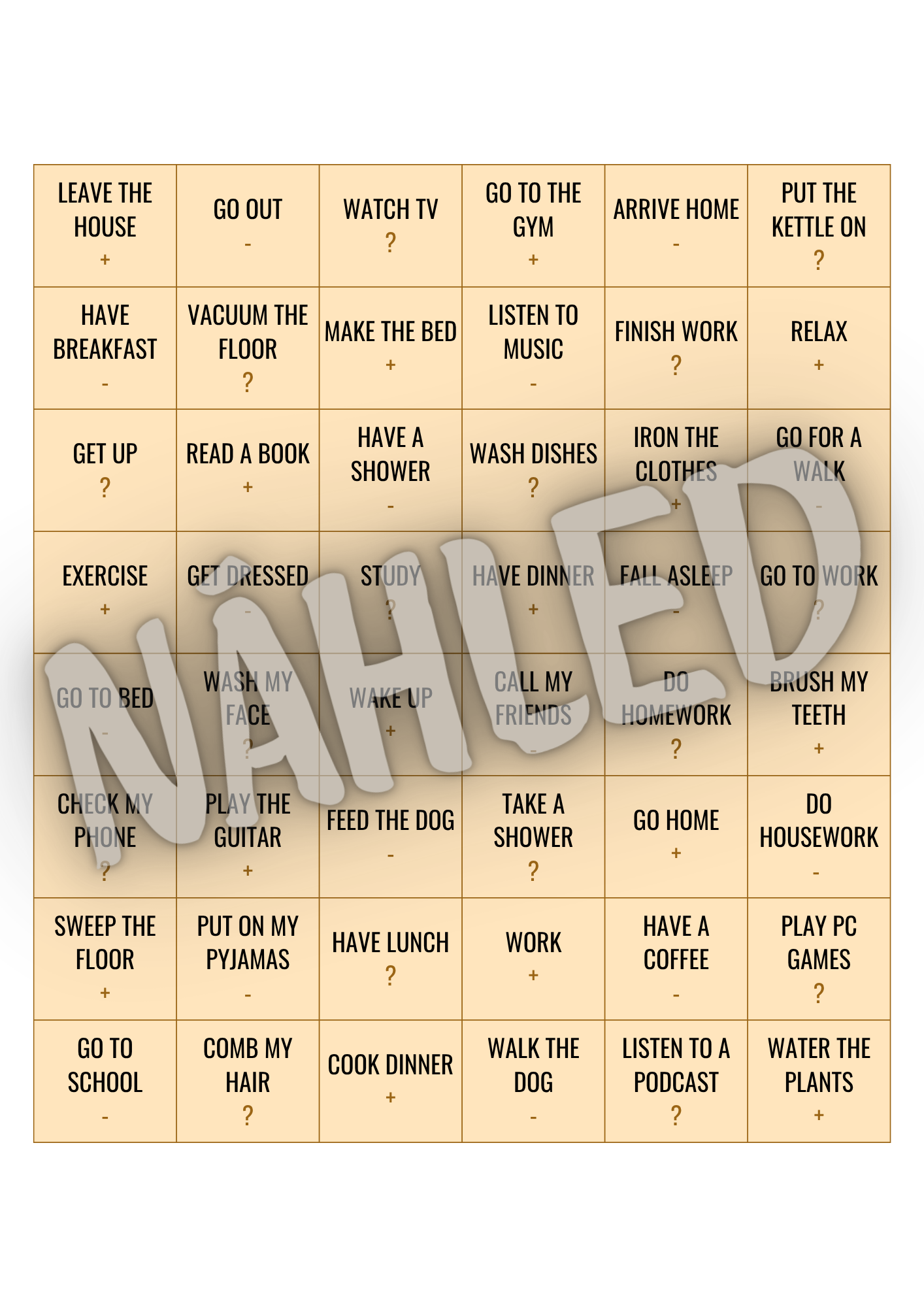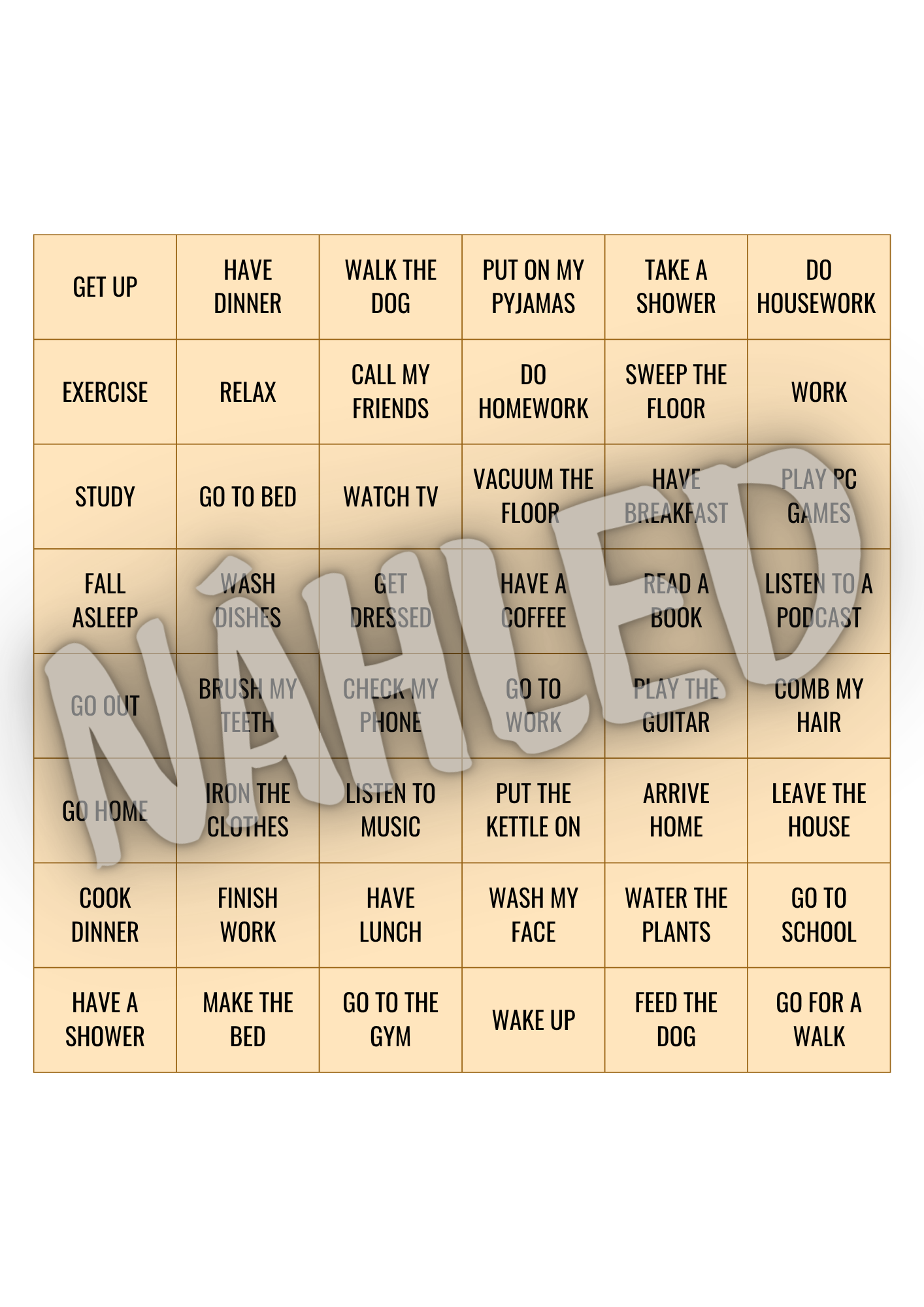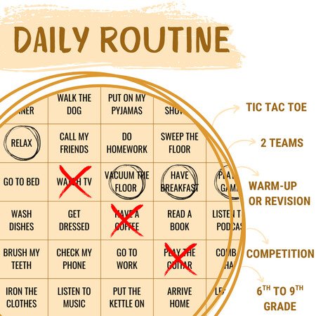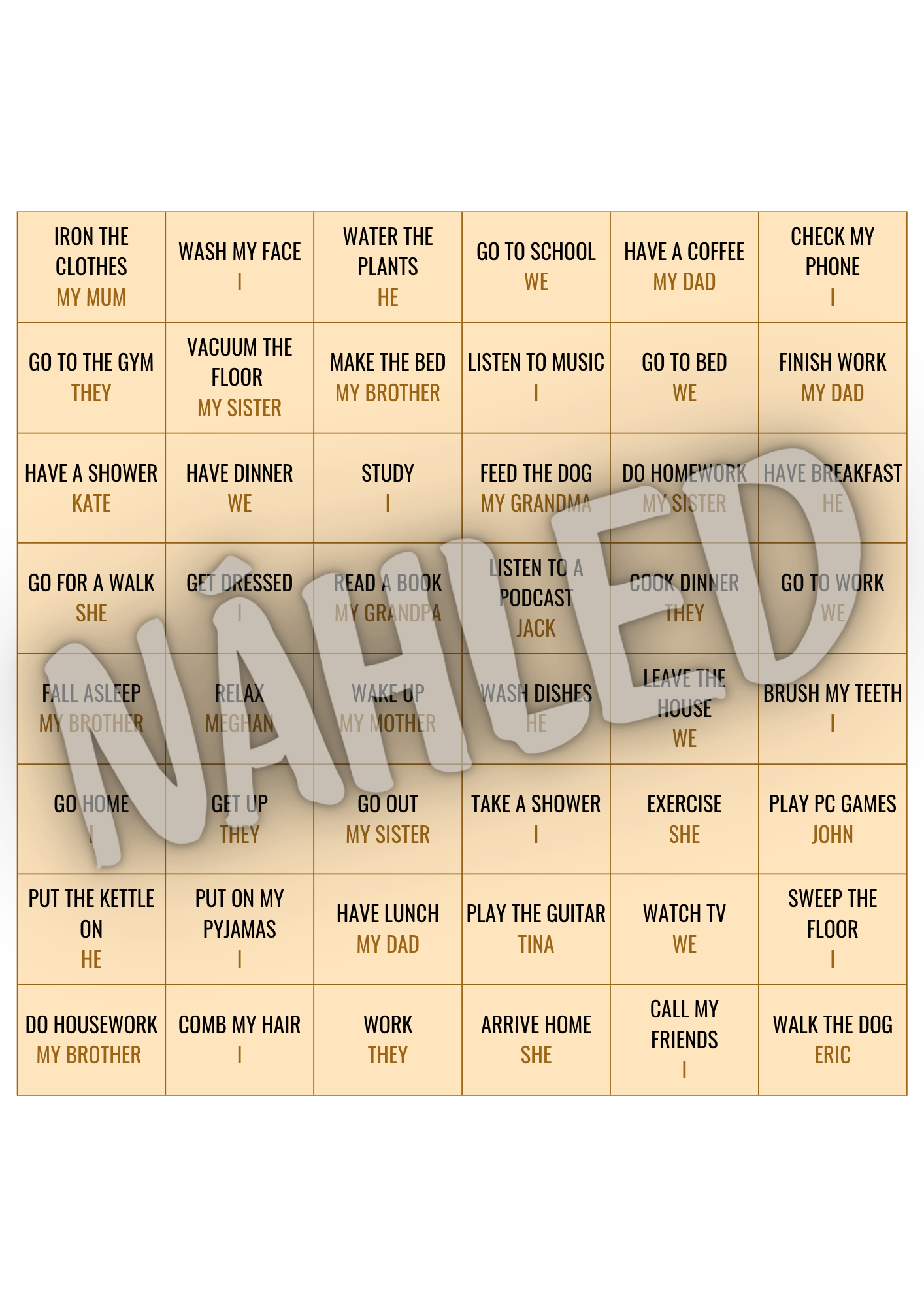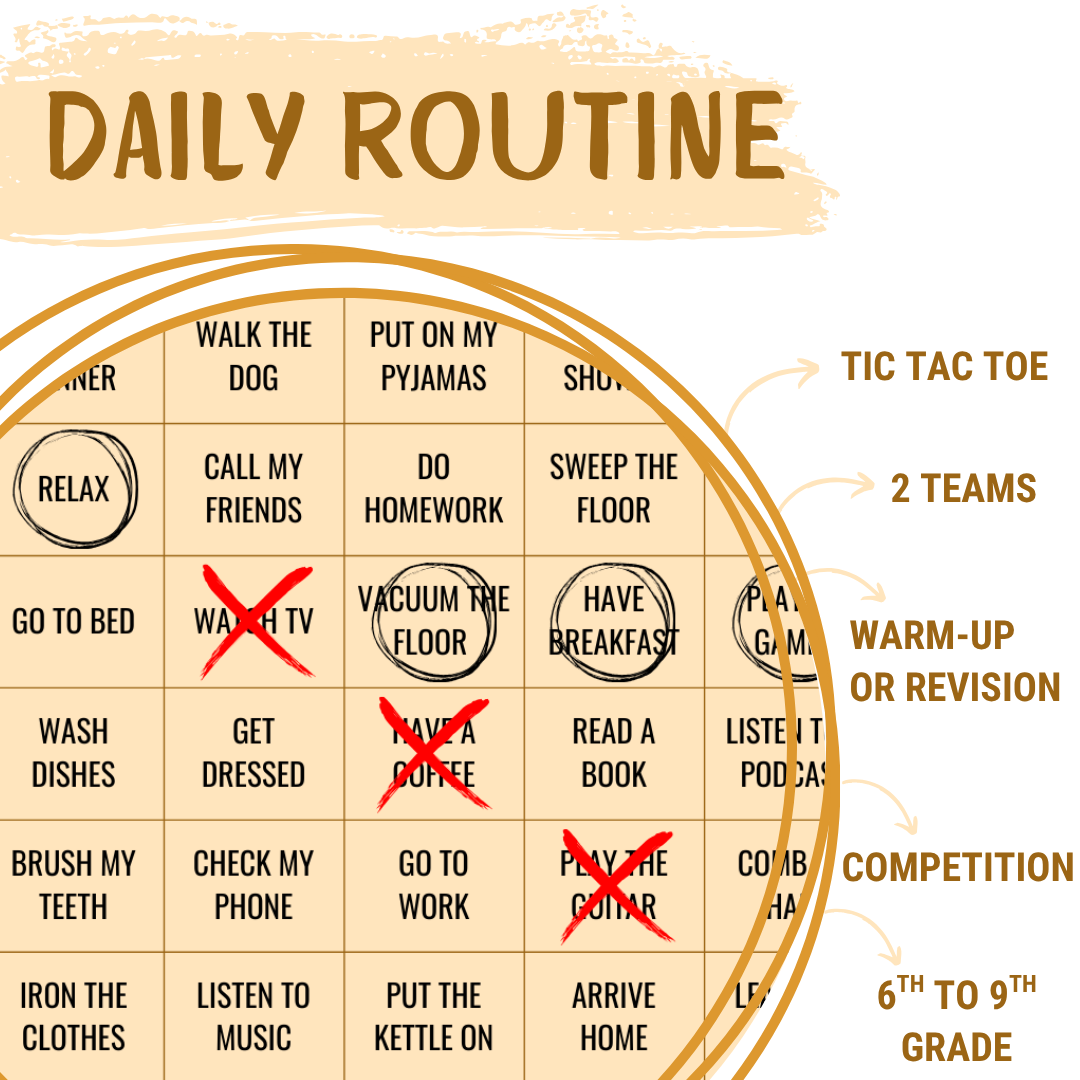 Soutěž pro 2 týmy na procvičení slovní zásoby na téma denní rutina a také přítomného času prostého. Aktivita je téměř bez přípravy - stačí promítnout na tabuli, není třeba nic tisknout.