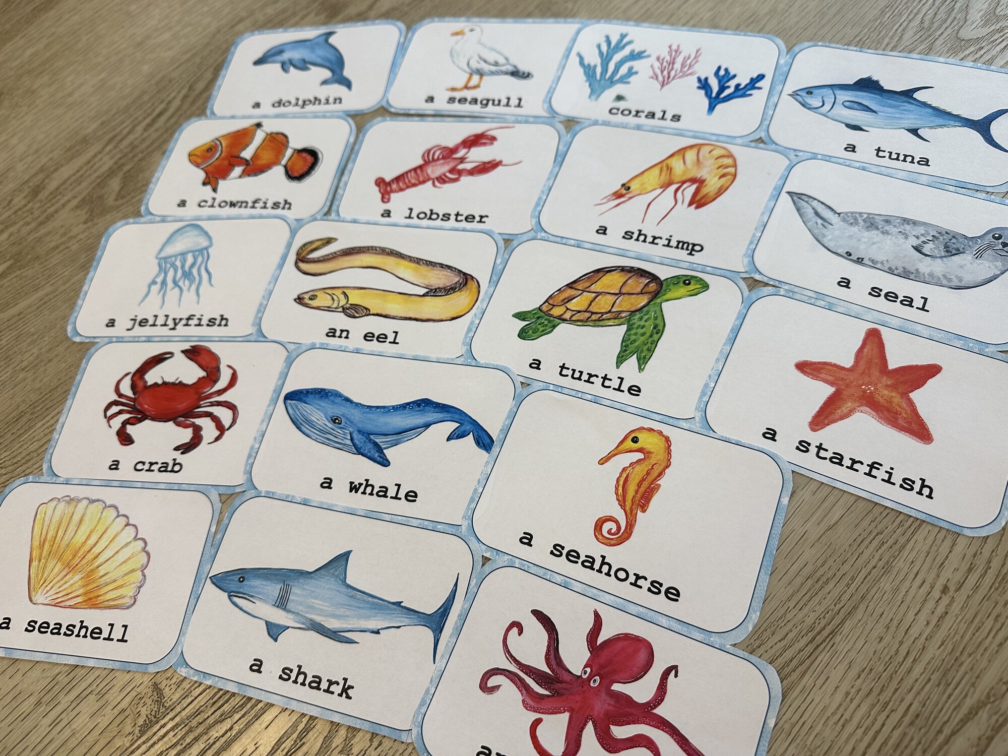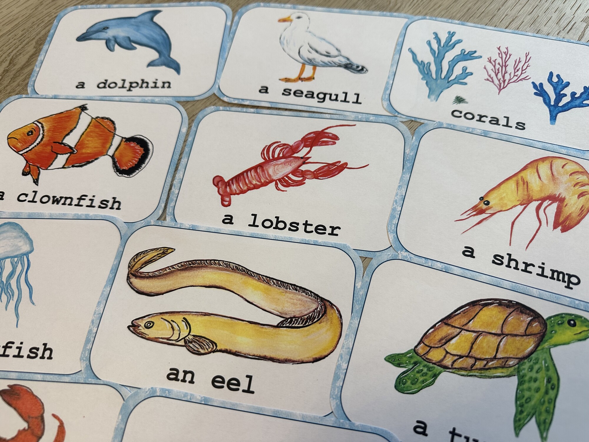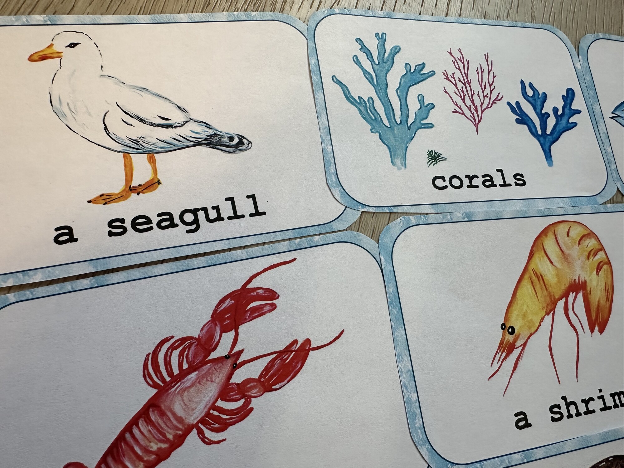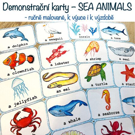 Materiál obsahuje 5 A4 stran – 18 karet velikosti A6. K výuce i k výzdobě. Ručně malované obrázky k tématu sea animals. Tipy na aktivity s kartami.