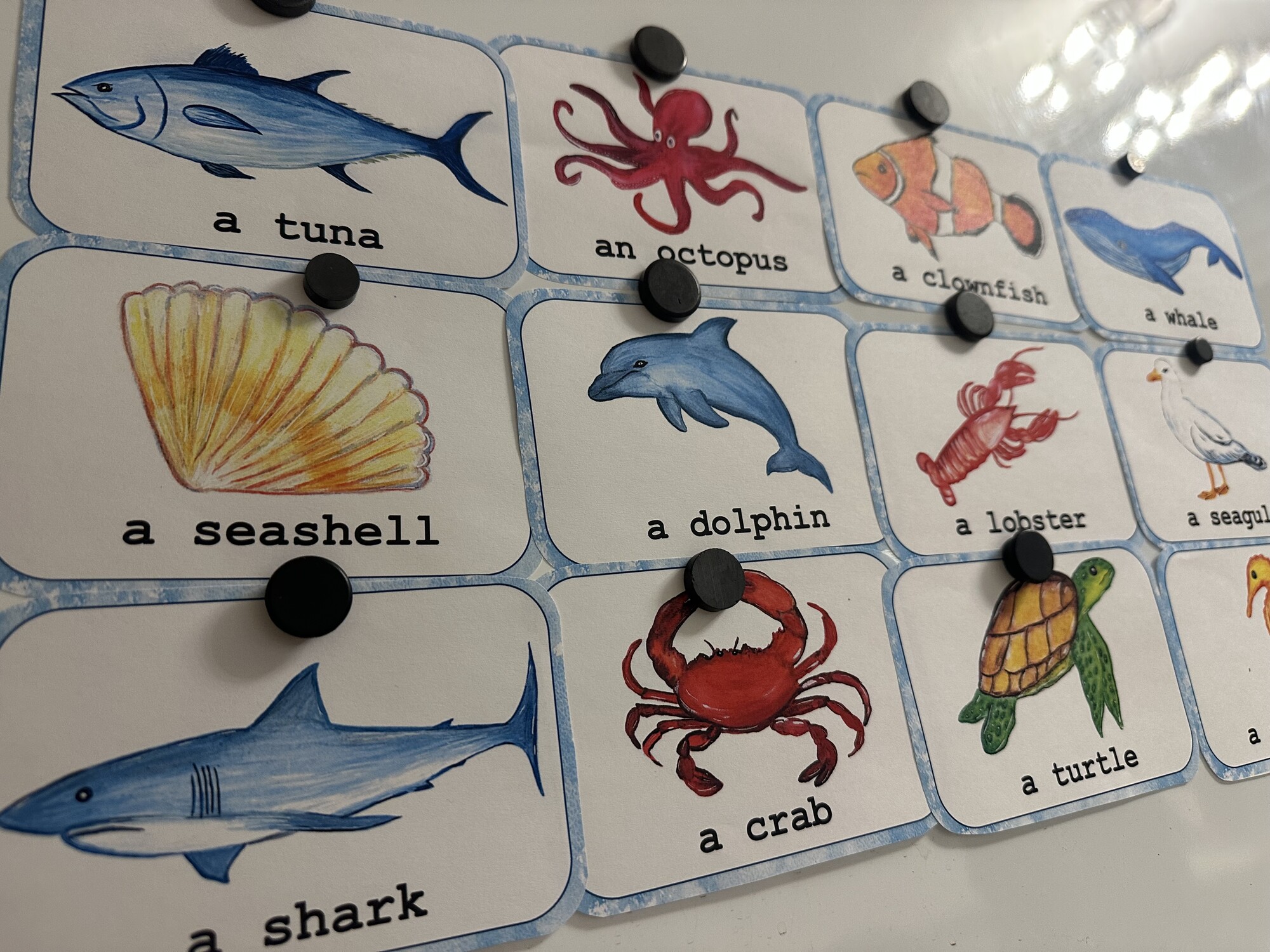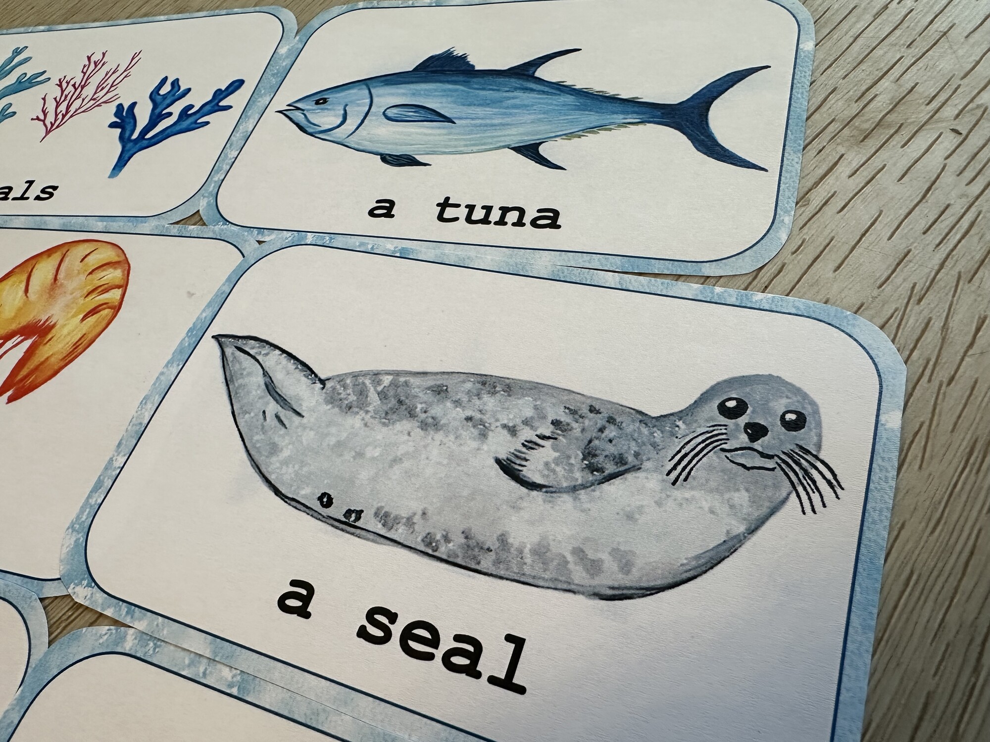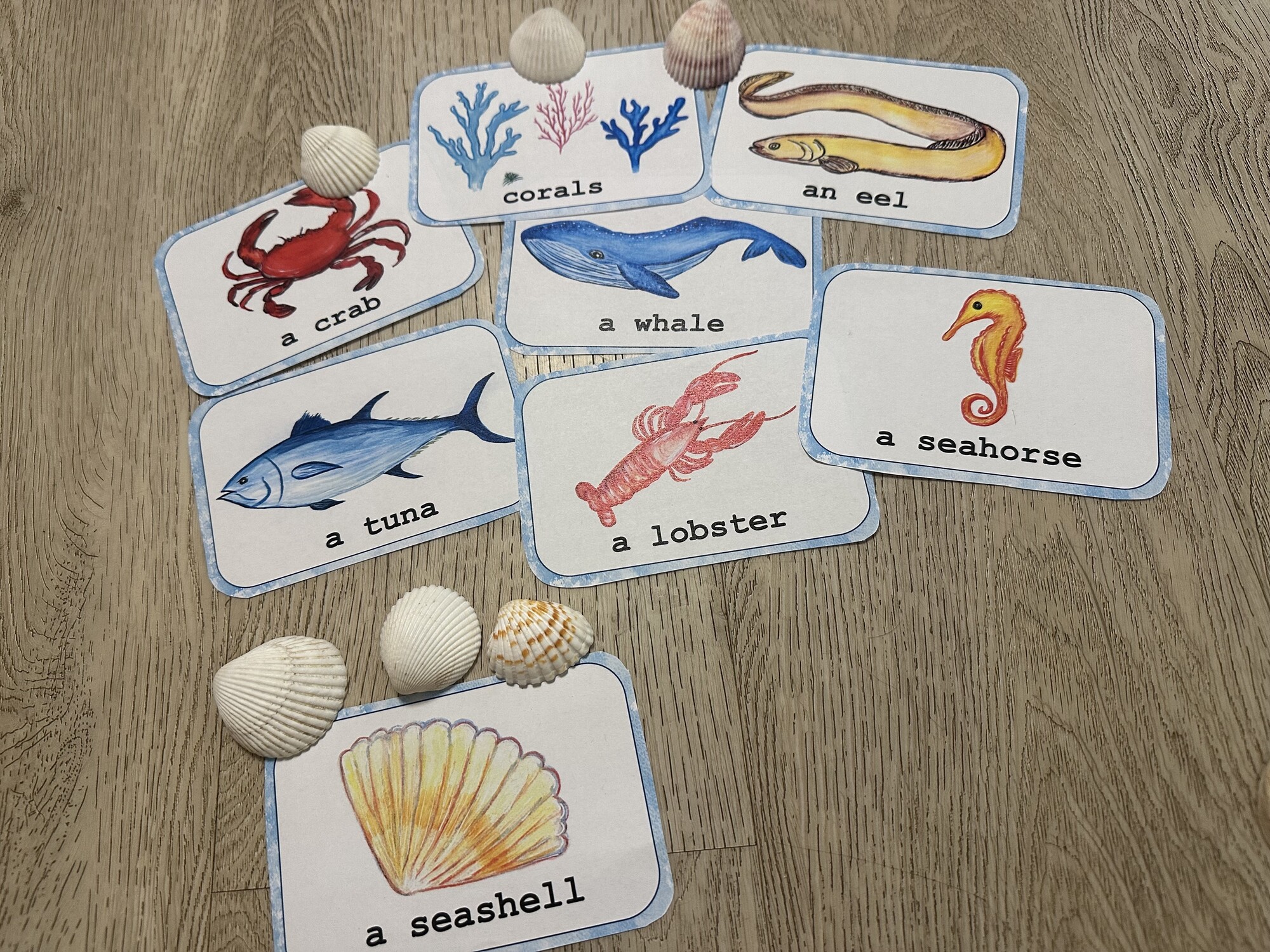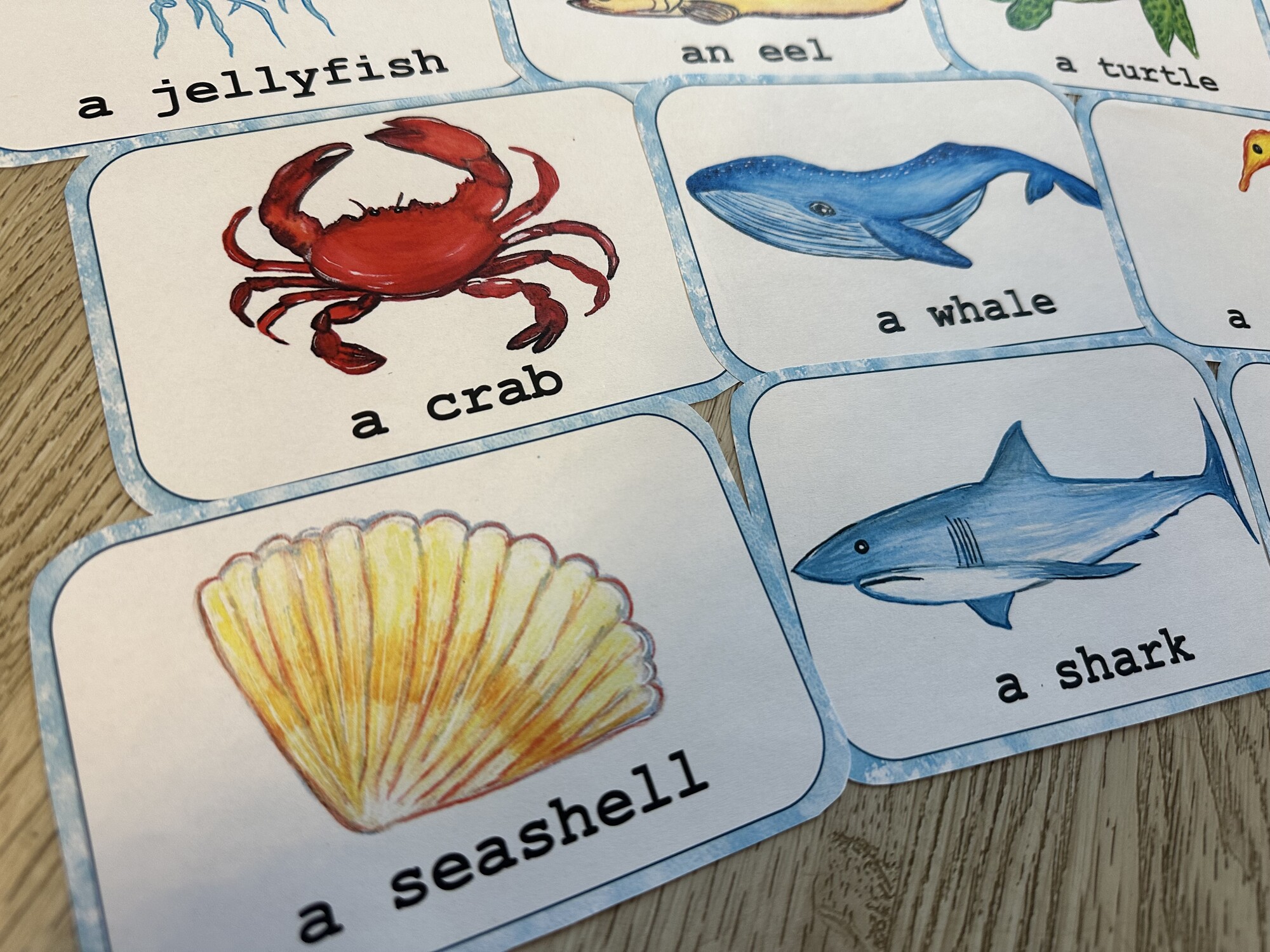 Materiál obsahuje 5 A4 stran – 18 karet velikosti A6. K výuce i k výzdobě. Ručně malované obrázky k tématu sea animals. Tipy na aktivity s kartami.