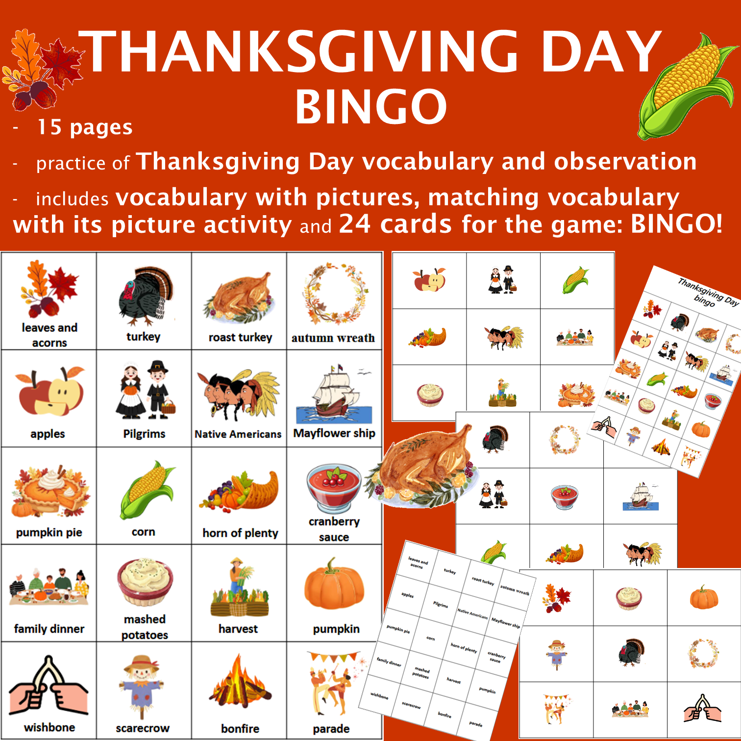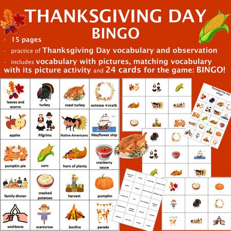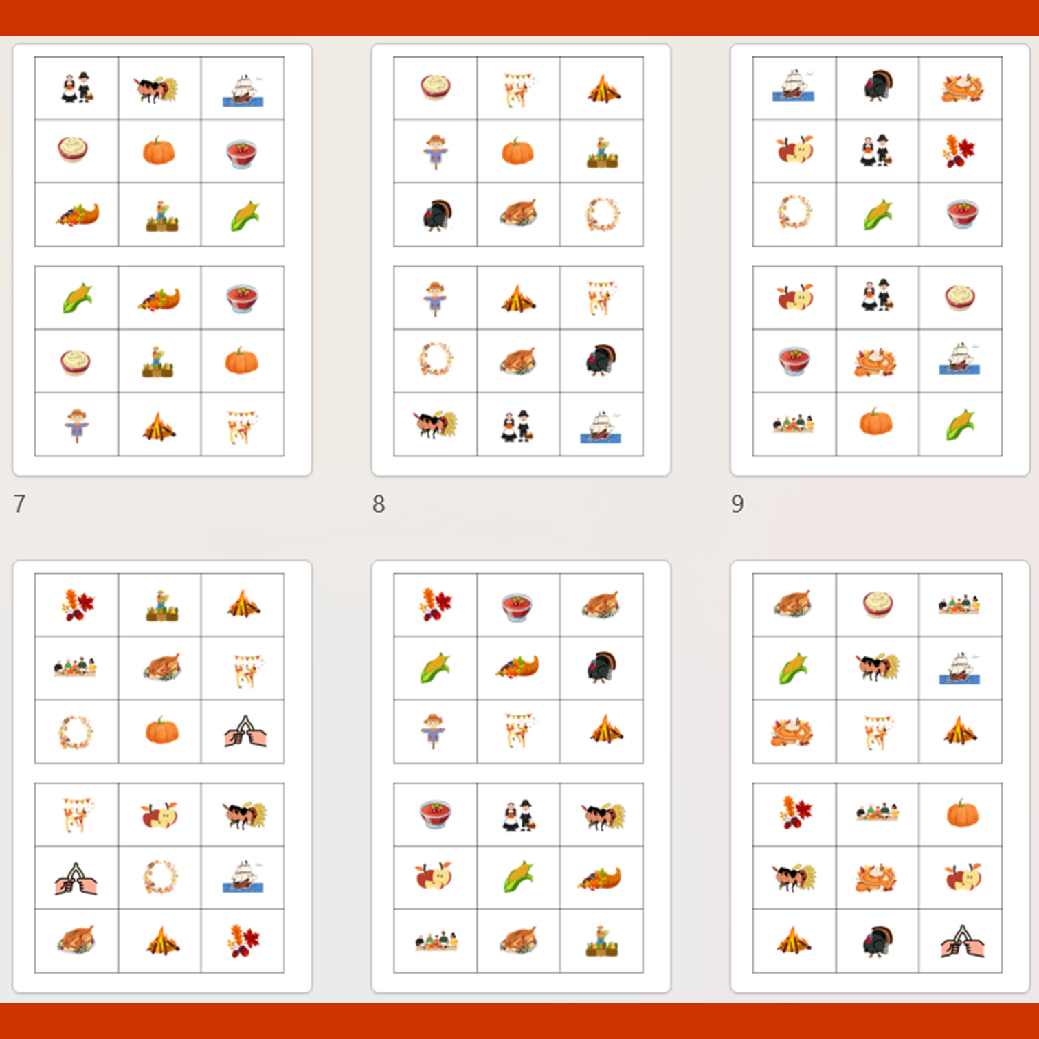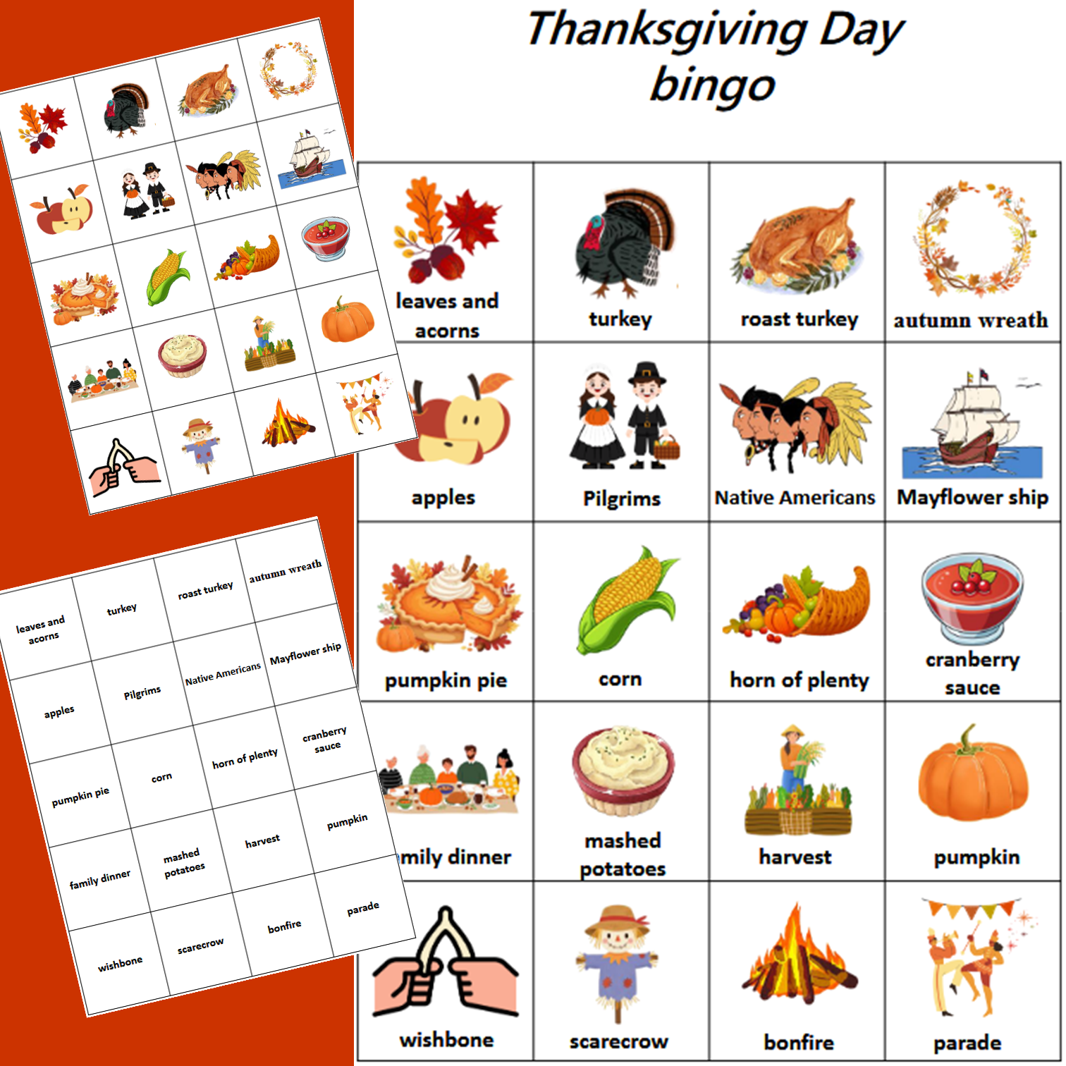 - 24 hracích karet (2 karty na jednom listu) s obrázky na téma Thanksgiving Day