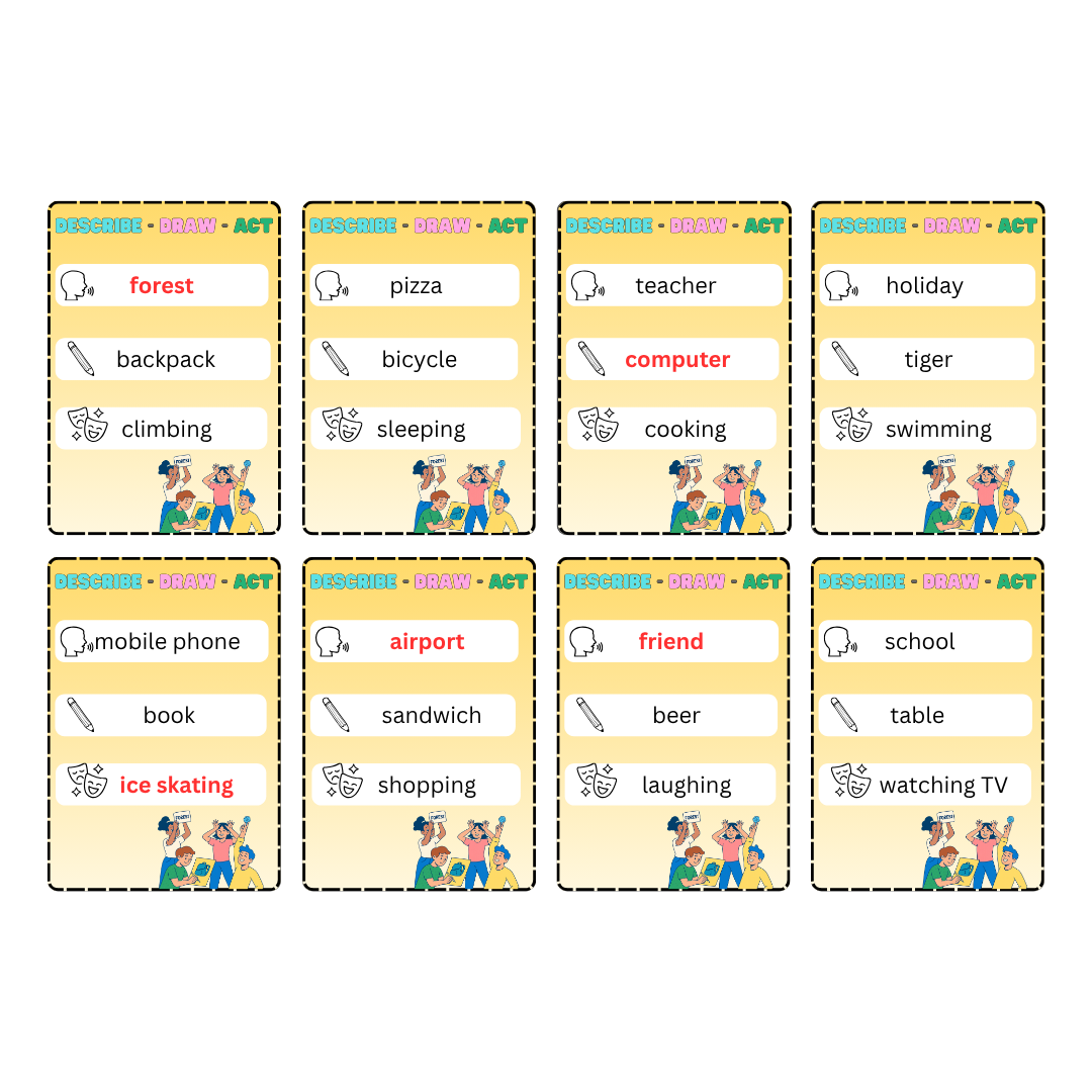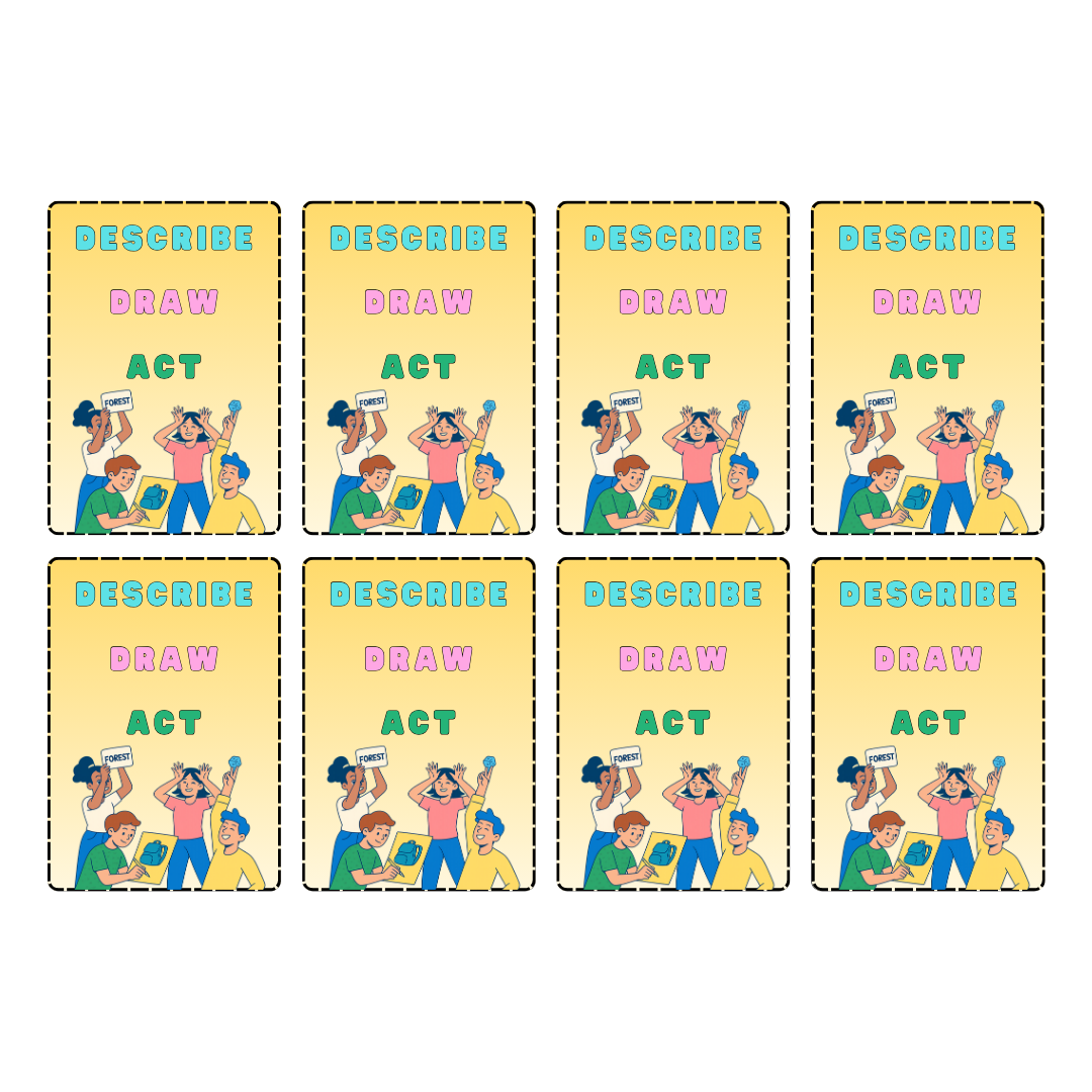 Žáci popisují, kreslí nebo předvádějí slova ze svých karet a ostatní hádají — jednoduché, zábavné a velmi efektivní na procvičení jazyka.