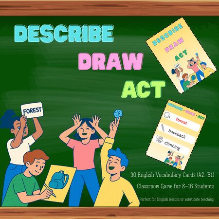 Tento materiál přináší zábavnou a dynamickou hru Describe – Draw – Act, která rozvíjí mluvení, slovní zásobu a spolupráci v hodinách angličtiny. Obsahuje 30 kartiček v úrovni A2–B1, díky kterým hravě vyplníte celou vyučovací hodinu nebo využijete aktivitu jako krátkou rozcvičku.