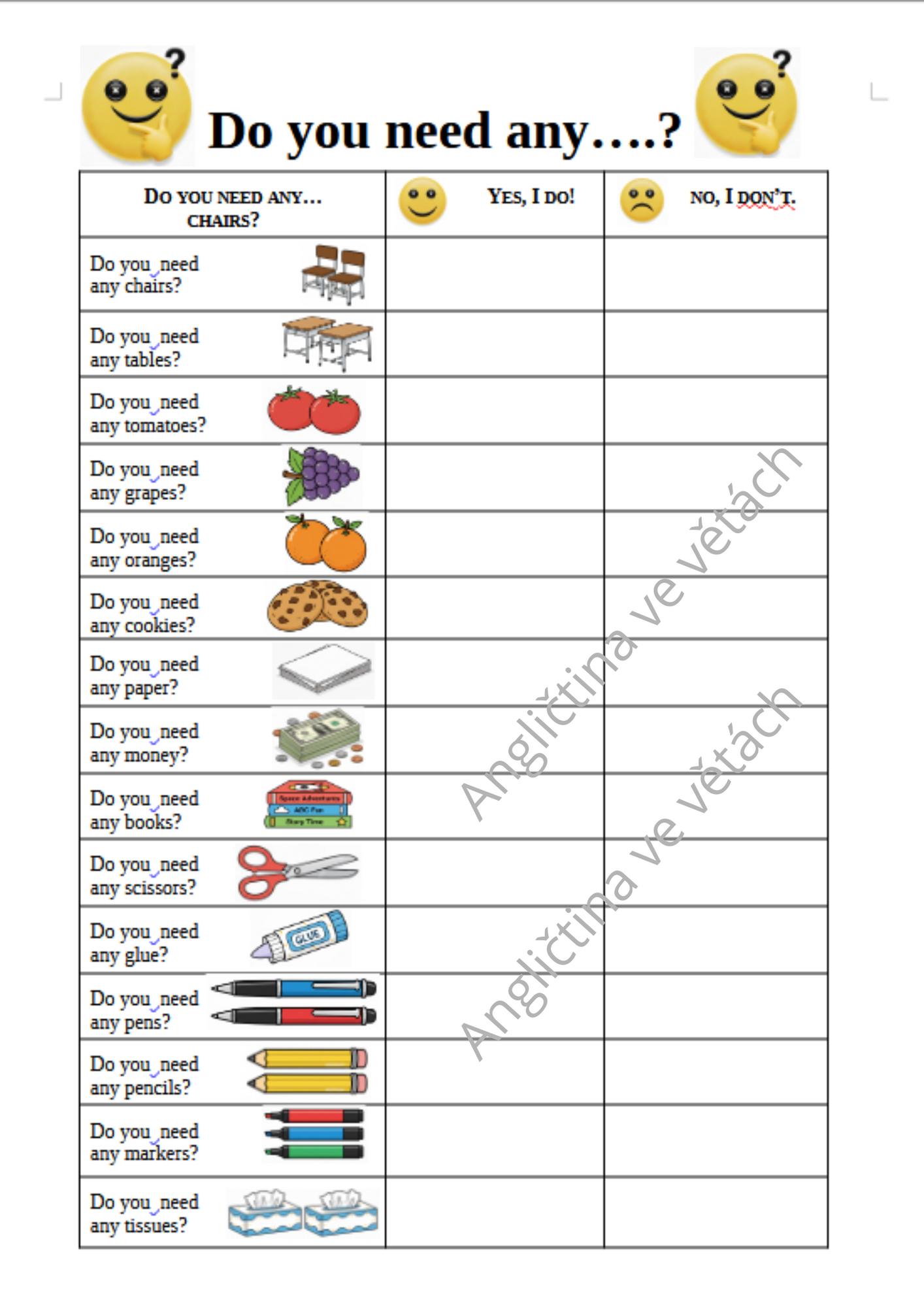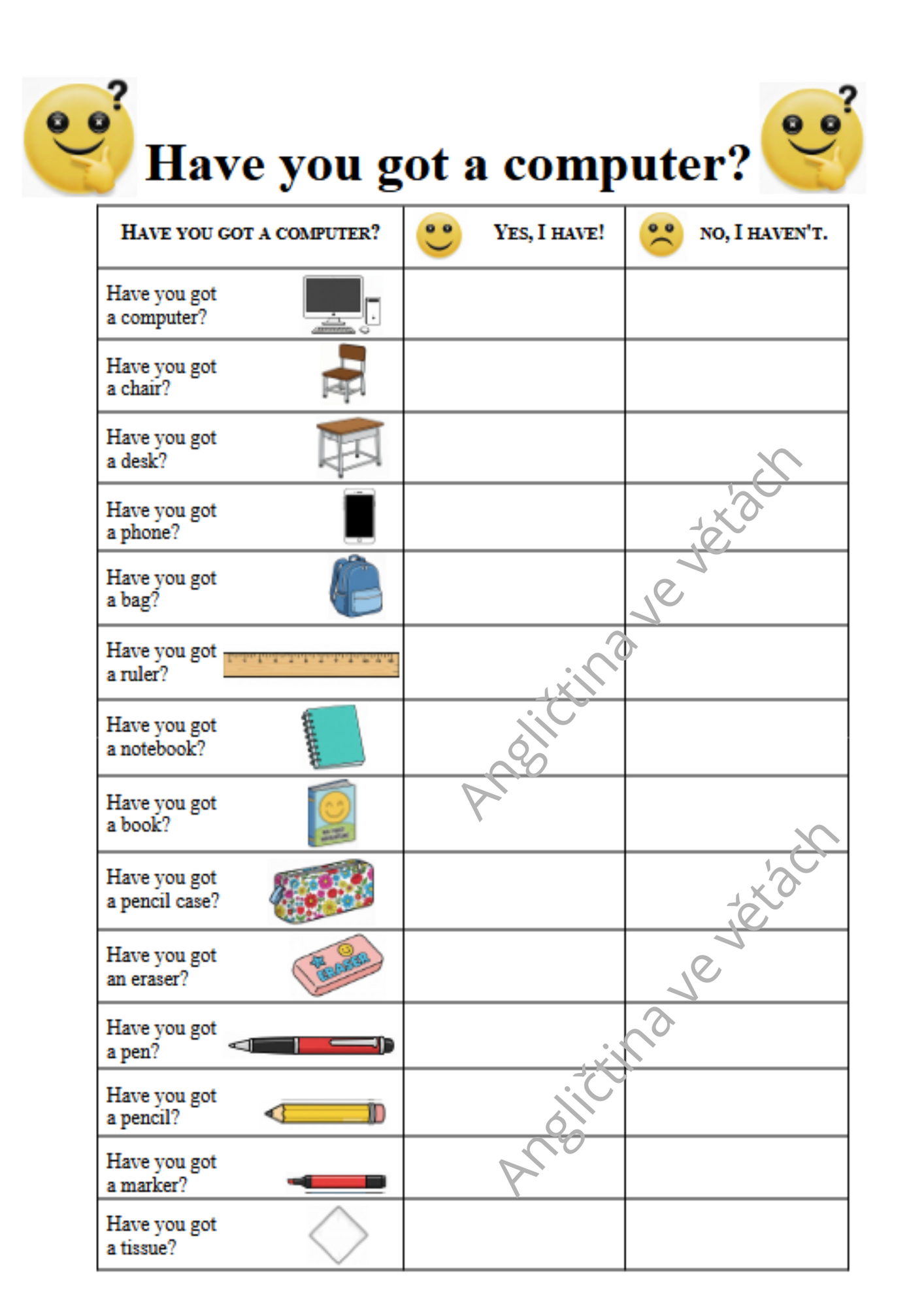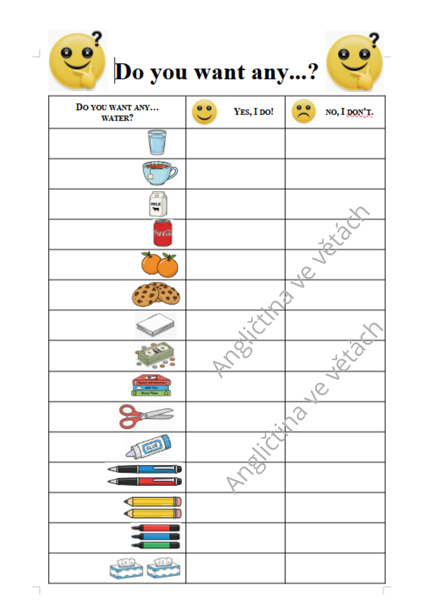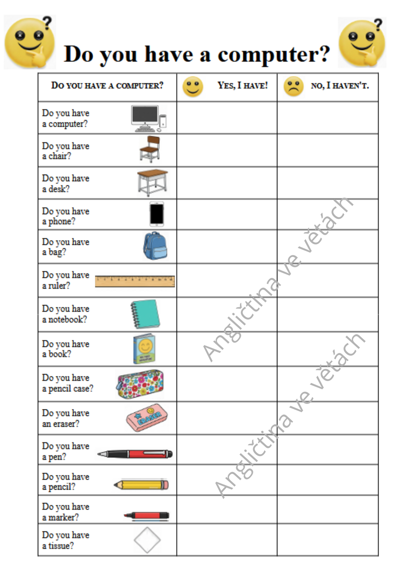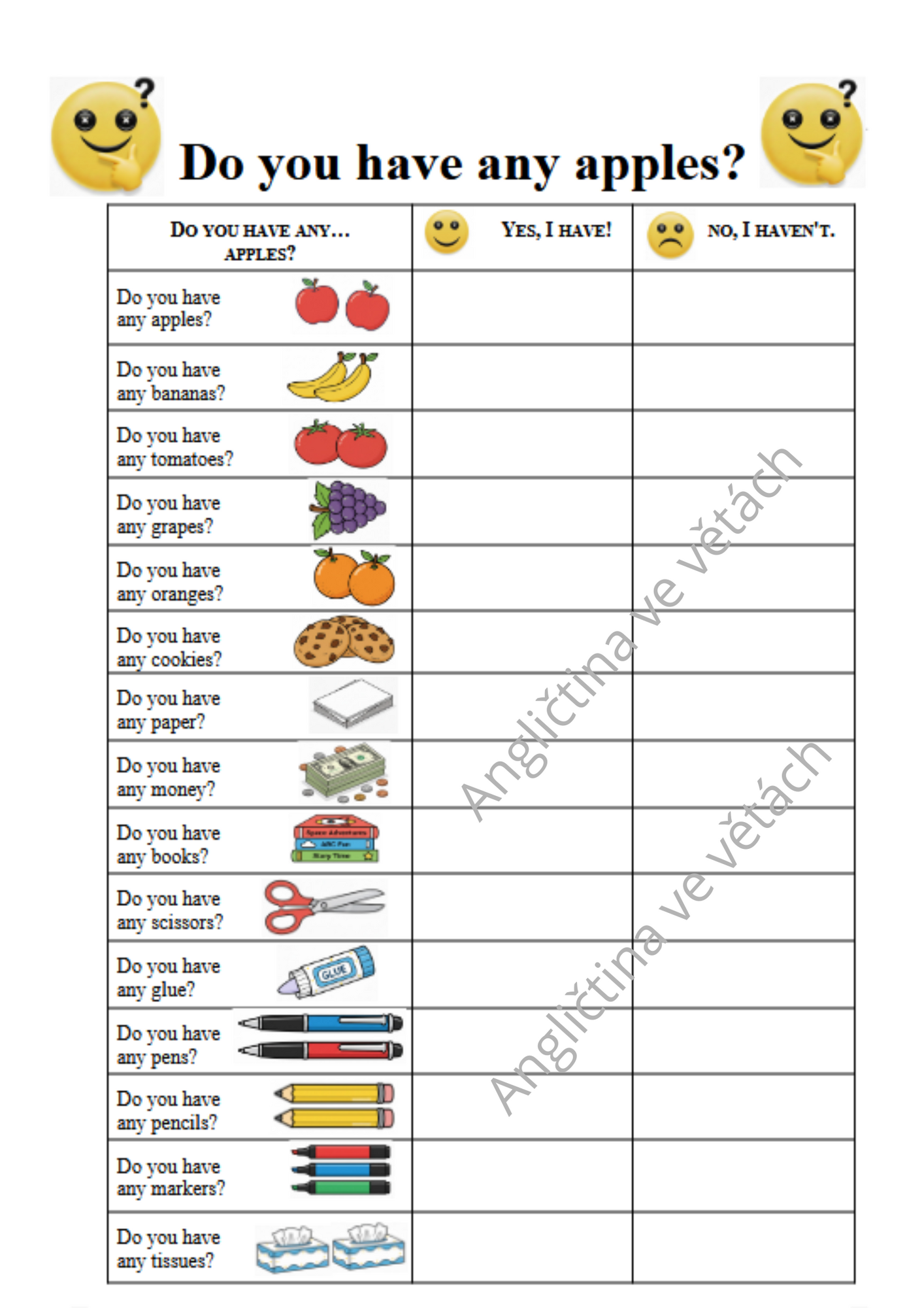 S dětmi jsme každý dotazník využívali opakovaně - jak šly dny po sobě a až volná políčka na odpovědi zcela zaplnila. Odpovědi jsme jednoduše zaznamenali jako první písmeno jména dítěte, které odpovídalo. Děti se ptaly o sto šest a otázku Do you ..? si zabetonovaly do hlaviček na vždy.