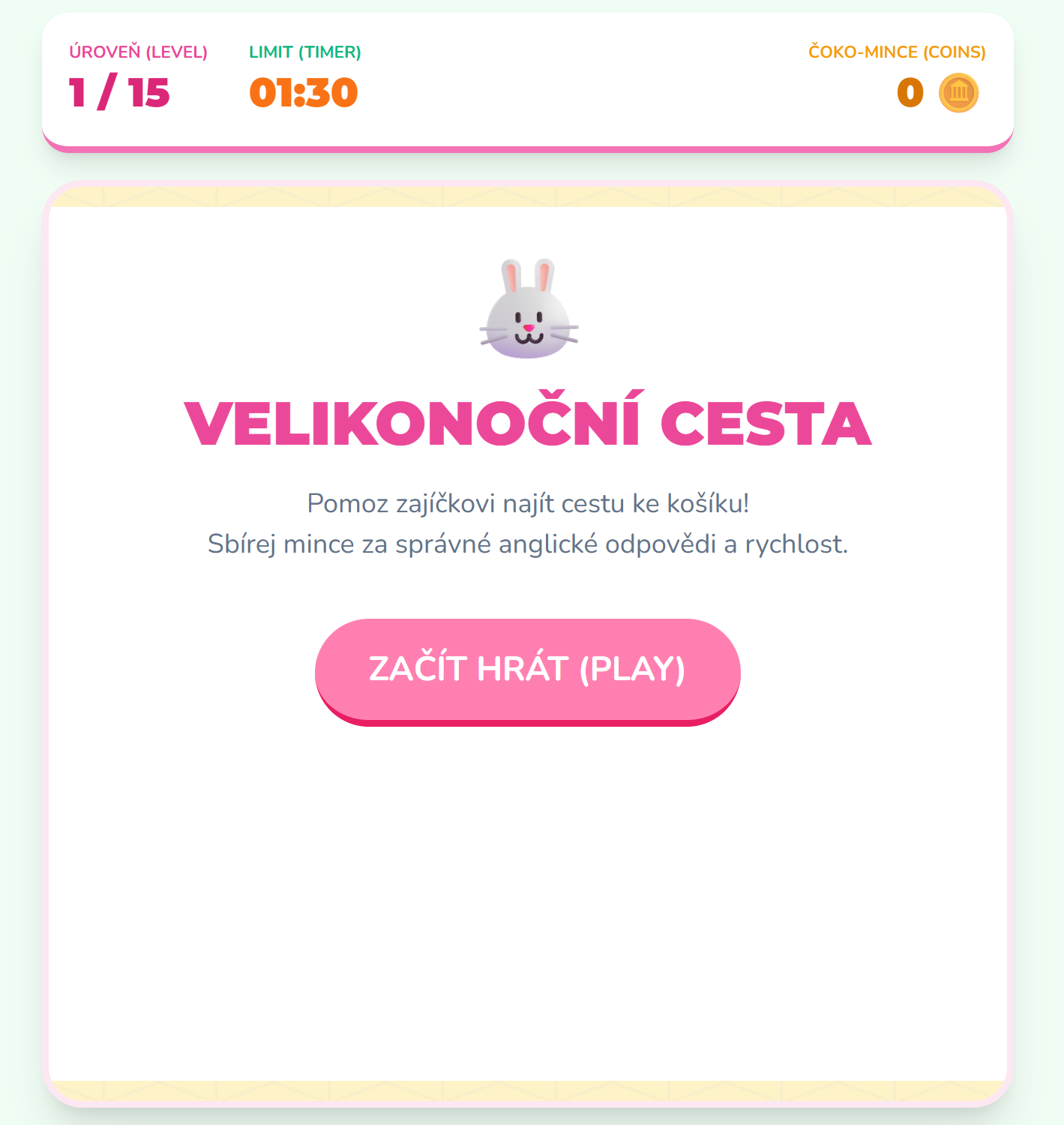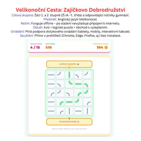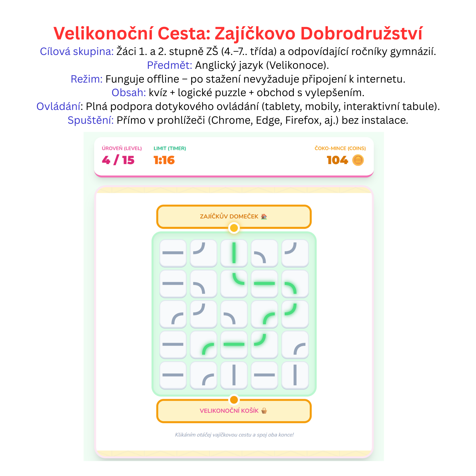 Velikonoční Dobrodružství: Zajíčkova Cesta je interaktivní webová hra, která kombinuje prvky logického puzzle a výukového kvízu v angličtině. Je navržena v hravém „velikonočním“ stylu s jarní tematikou. Snadné spuštění. Návod součástí souboru. Možnost hrát Off-line. Kompatibilní s PC, mobilem i tabletem.
