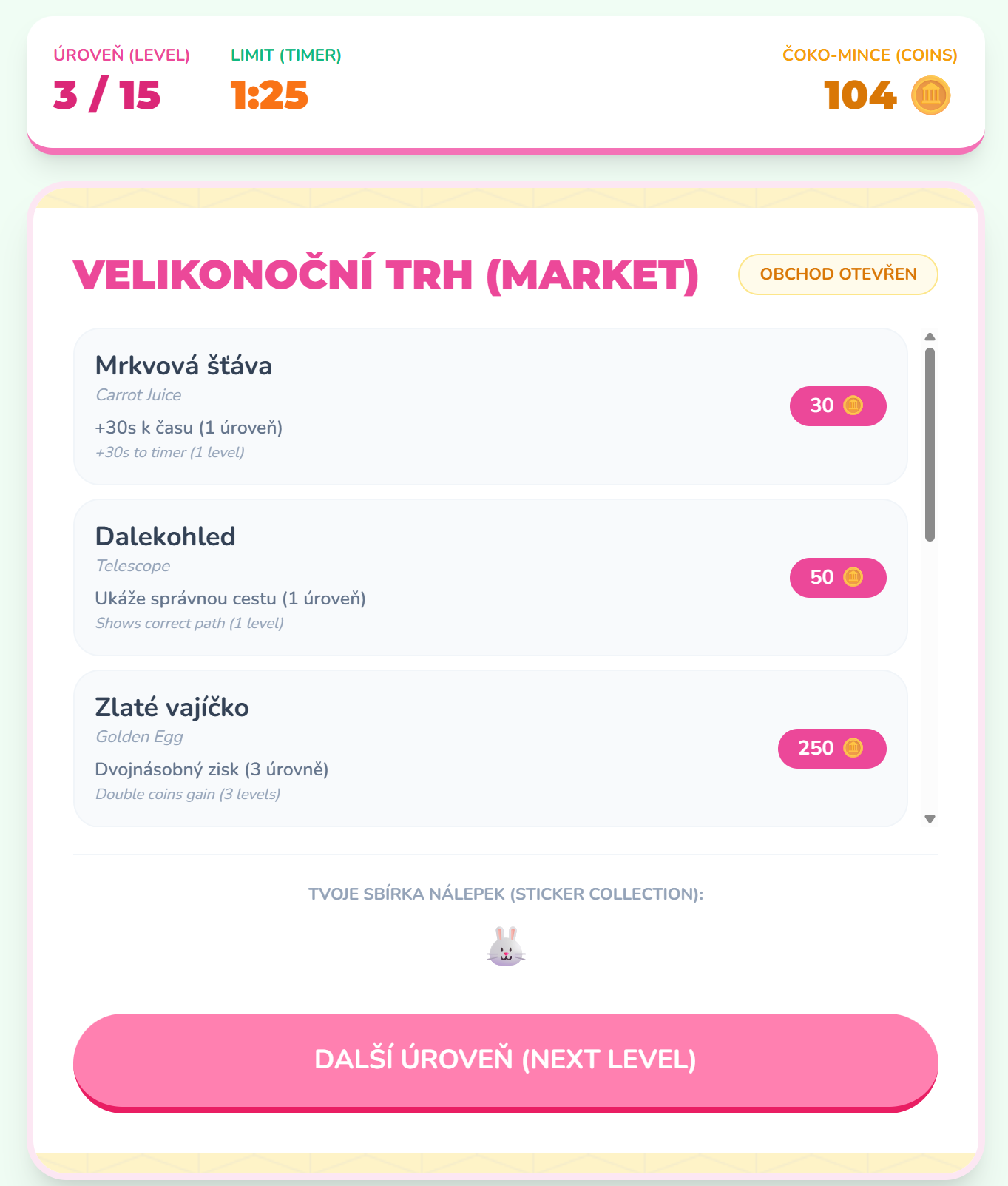 - Sběratelské nálepky: Trvalé trofeje (Zajíček, Kuřátko, Beránek, Král Velikonoc), které se zobrazují v hráčově sbírce.