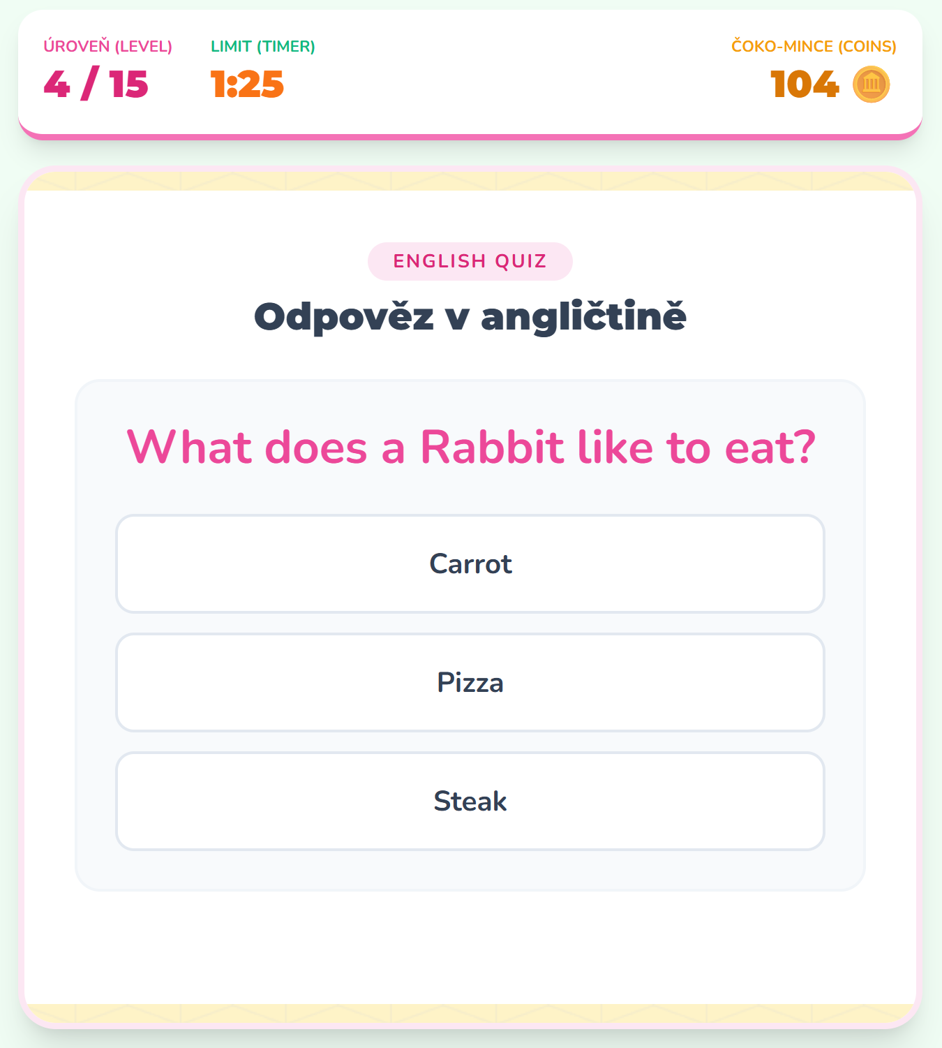 - Anglický kvíz: Hráč musí nejprve správně odpovědět na dvě otázky v angličtině (např. „What animal lays eggs?“). Správná odpověď ho posune dál, špatná odpověď mu odečte 10 sekund z časového limitu.