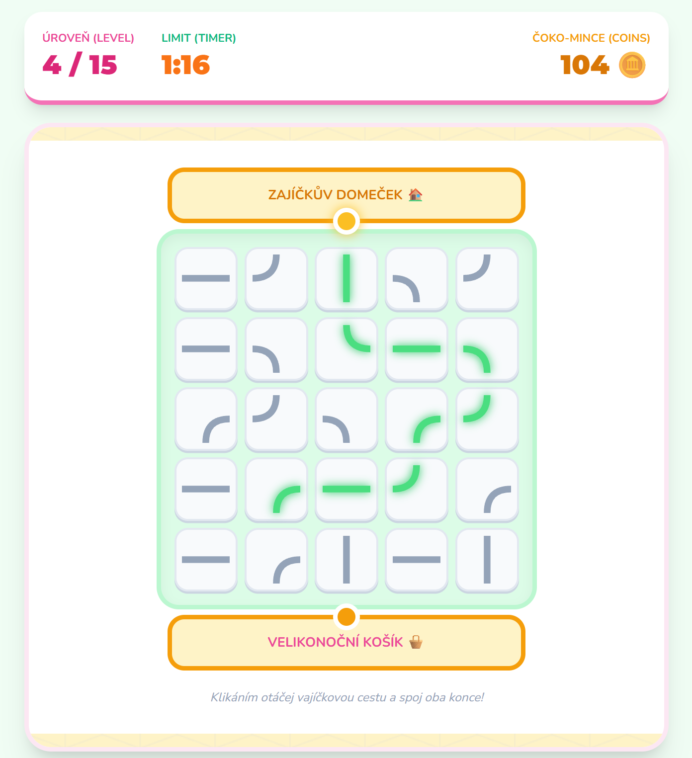 - Logické propojování: Hlavním úkolem je otočit dílky cesty na mřížce 5x5 tak, aby vzniklo souvislé spojení mezi „Zajíčkovým domečkem“ nahoře a „Velikonočním košíkem“ dole.