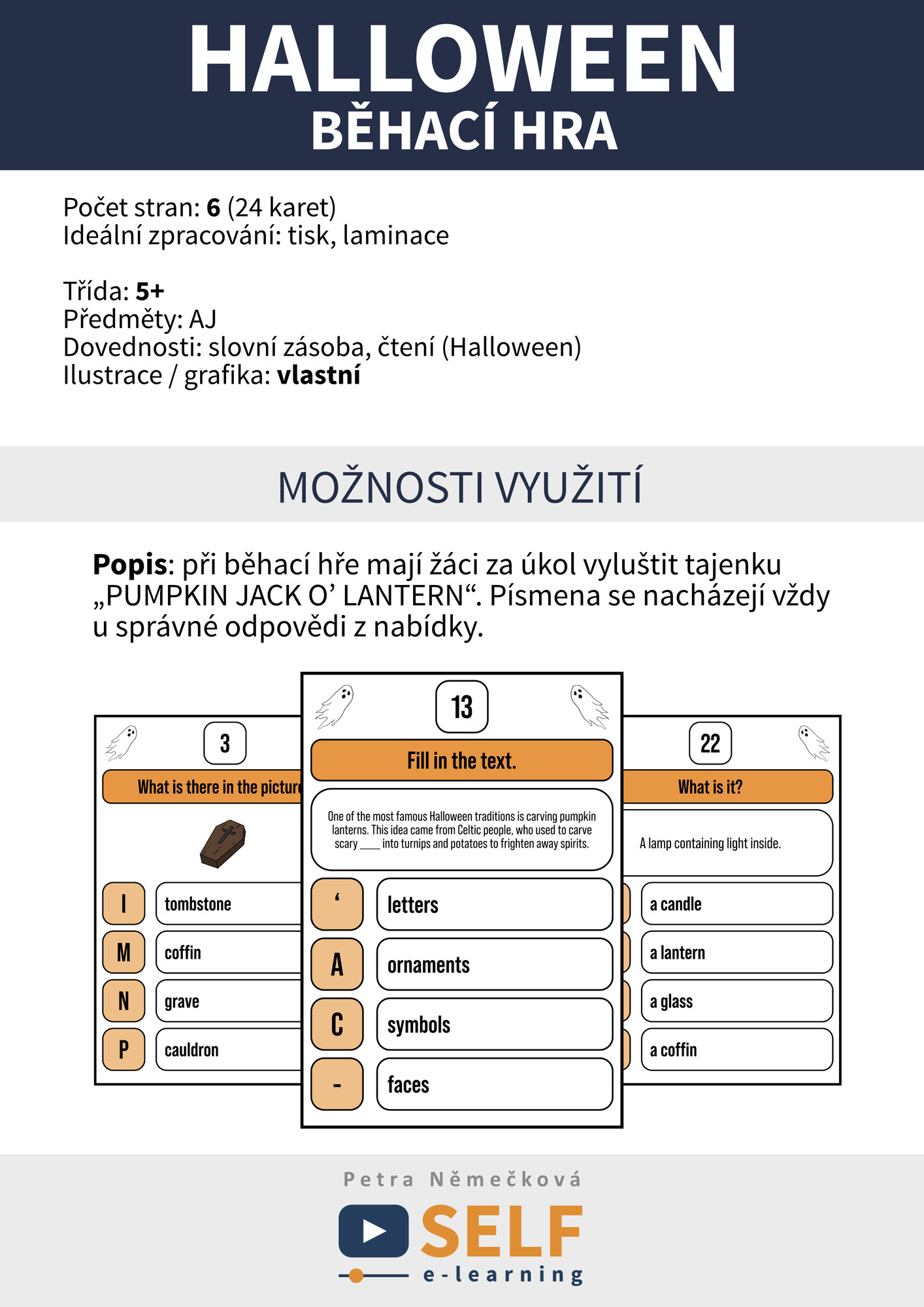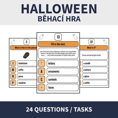 Popis: při běhací hře mají žáci za úkol vyluštit tajenku „PUMPKIN JACK O’ LANTERN“. Písmena se nacházejí vždy u správné odpovědi z nabídky.