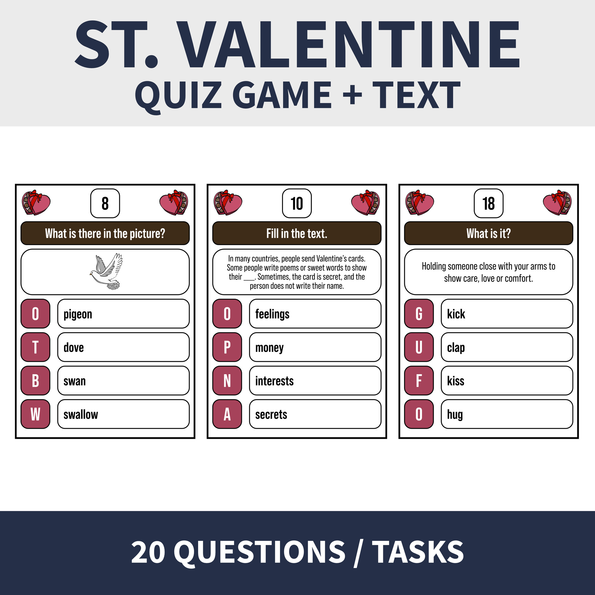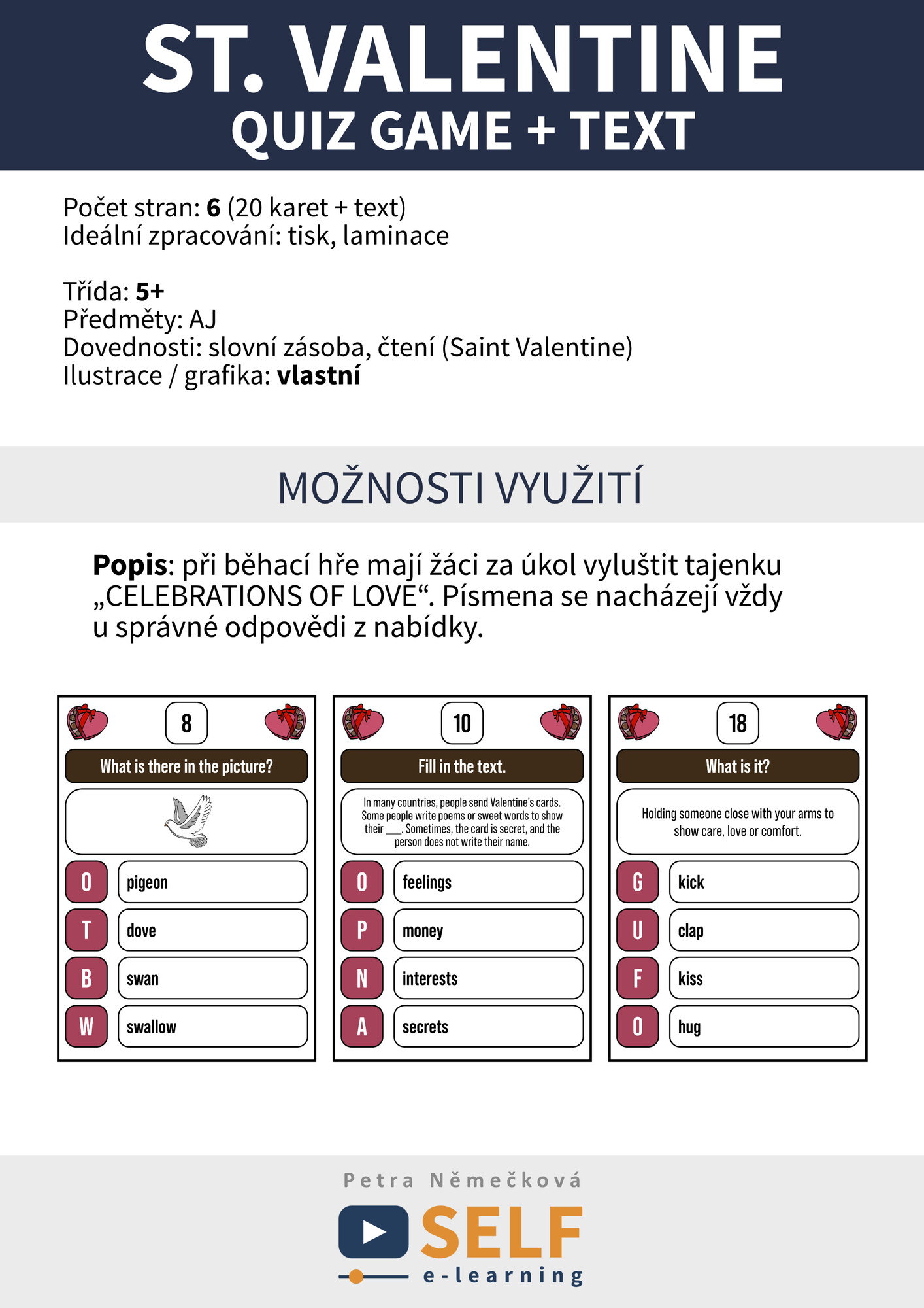 Popis: při běhací hře mají žáci za úkol vyluštit tajenku „CELEBRATIONS OF LOVE“. Písmena se nacházejí vždy u správné odpovědi z nabídky.